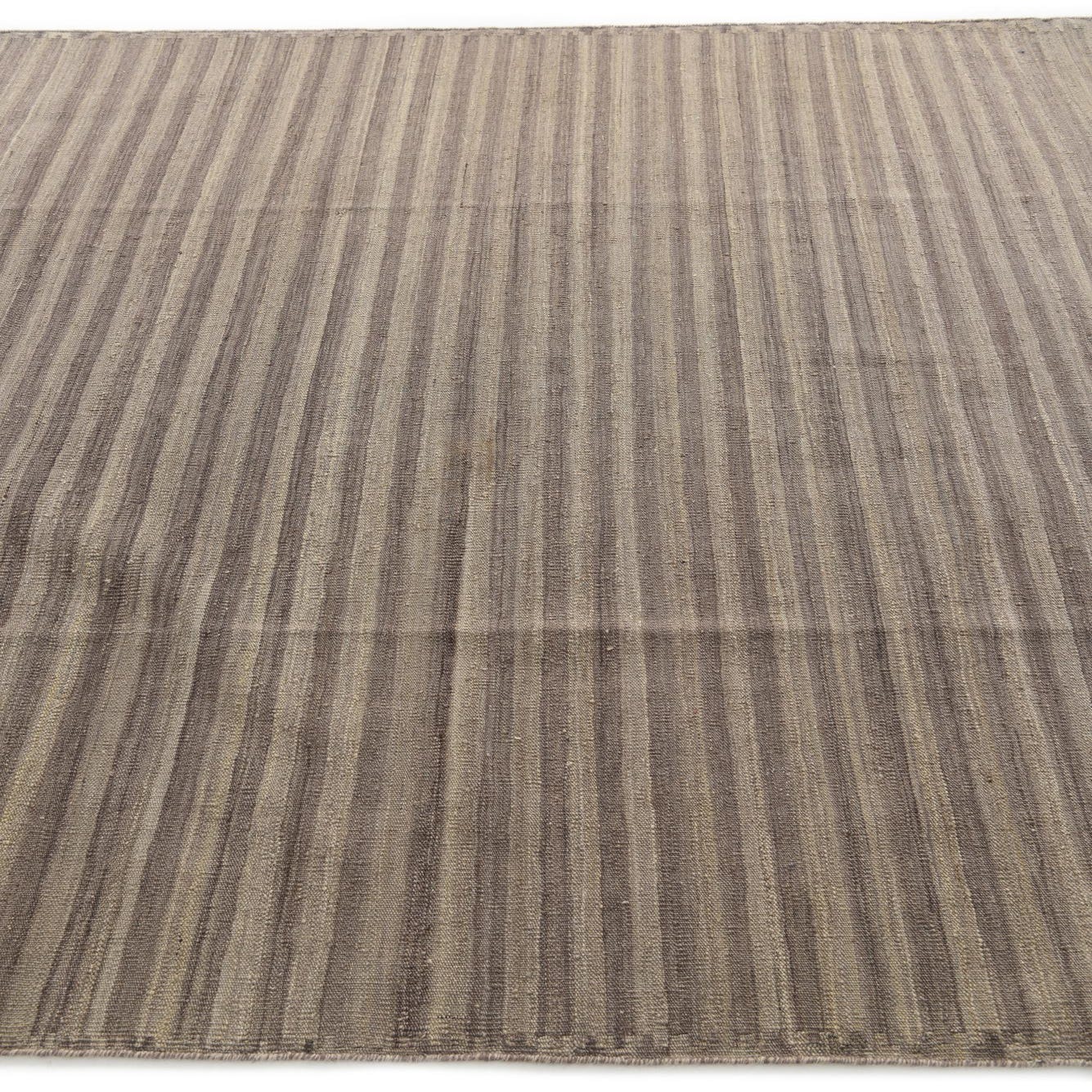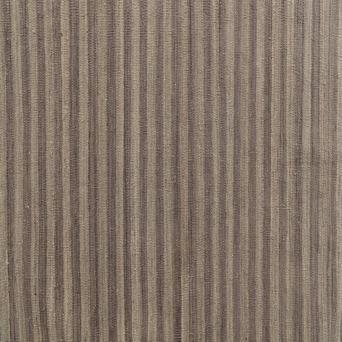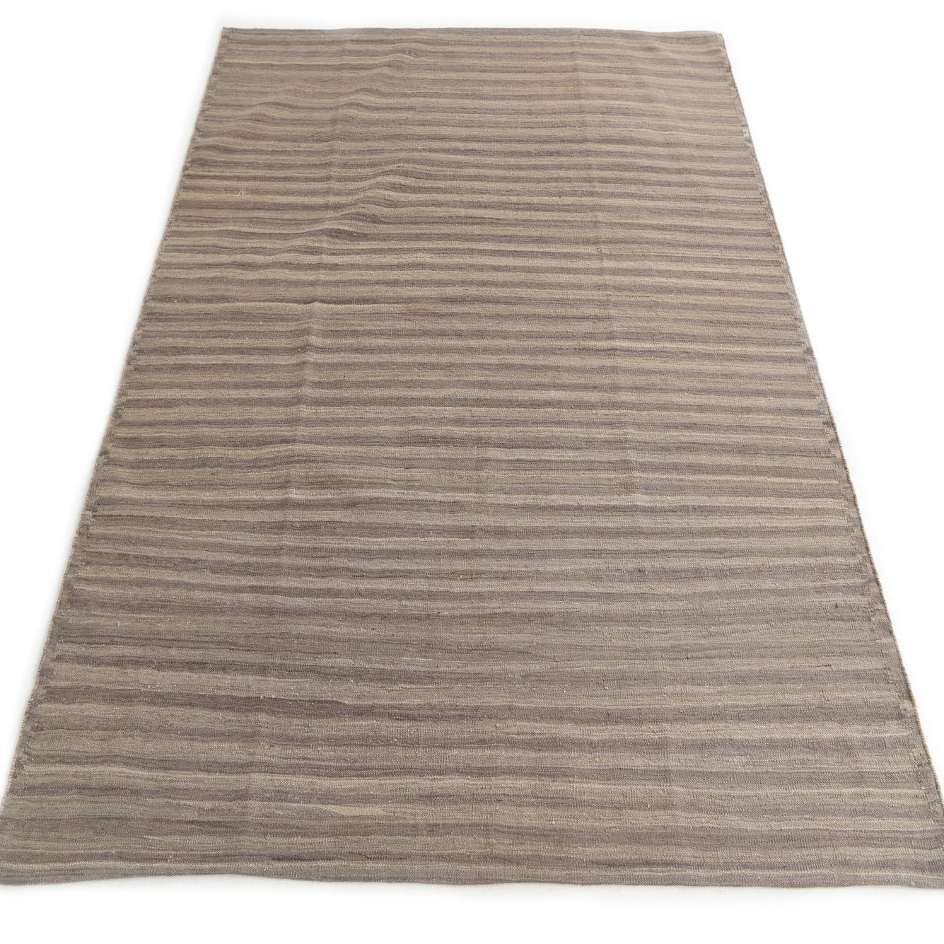 A 6x9 rectangular gray flatweave wool rug with horizontal stripes in varying shades of gray.