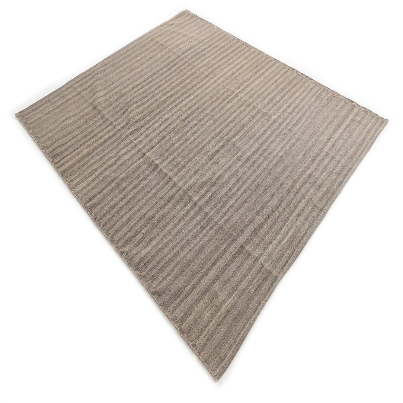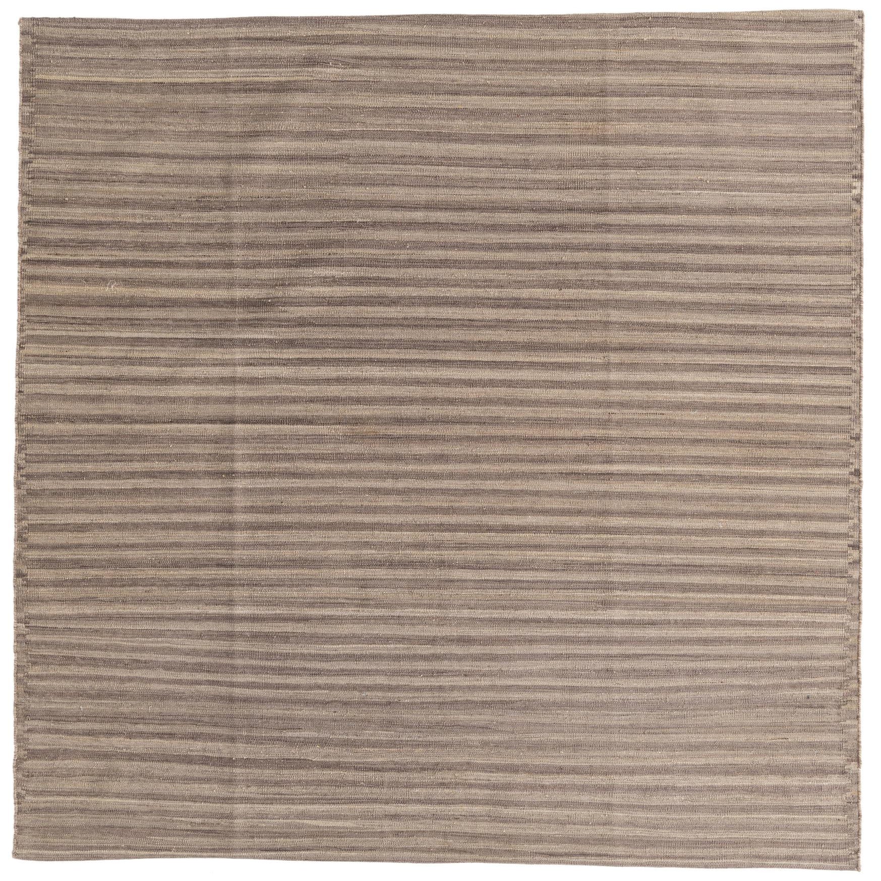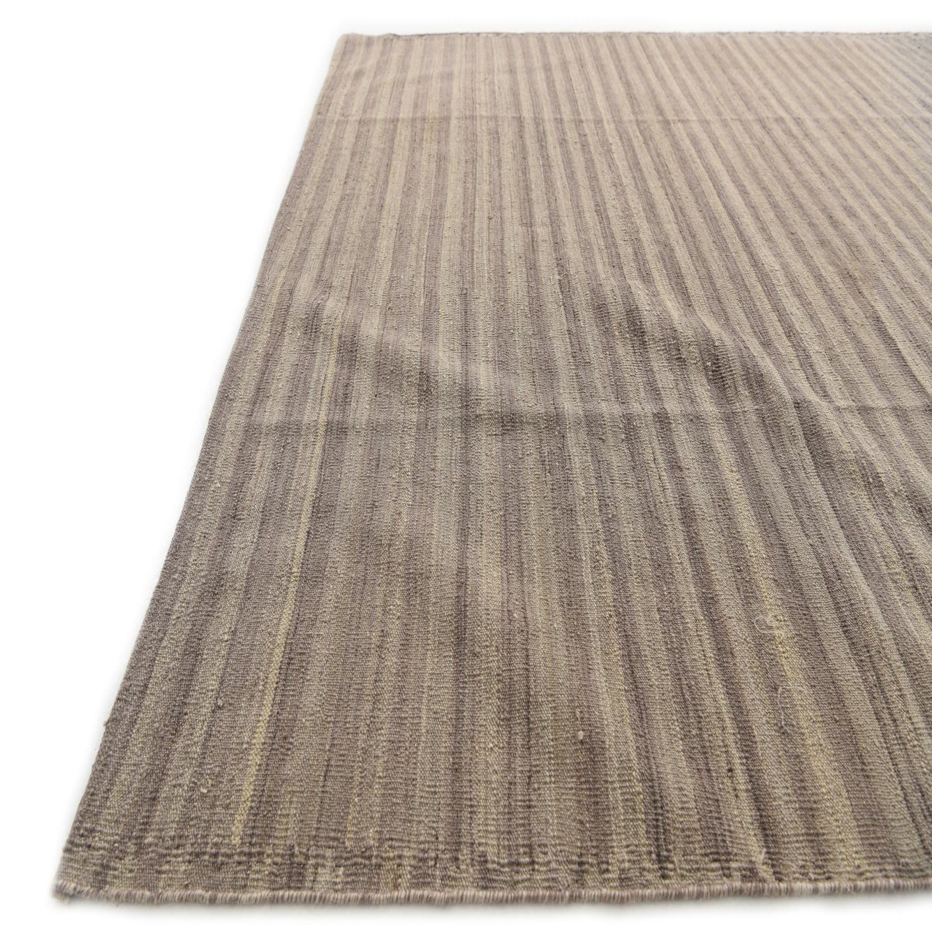 A 6x9 rectangular gray flatweave wool rug with horizontal stripes in varying shades of gray.