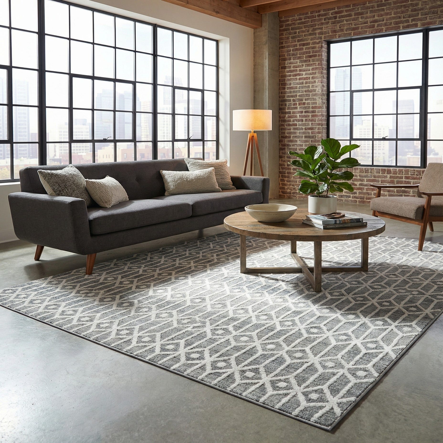 A crisp ivory lattice pattern overlays a heathered gray ground to create a clean, geometric look. The repeating motif of elongated hexagons and small circular accents forms a structured trellis that reads modern without being fussy. The ivory pattern is slightly raised against the gray background, giving the surface subtle dimensionality and a tactile contrast that’s pleasant underfoot.
