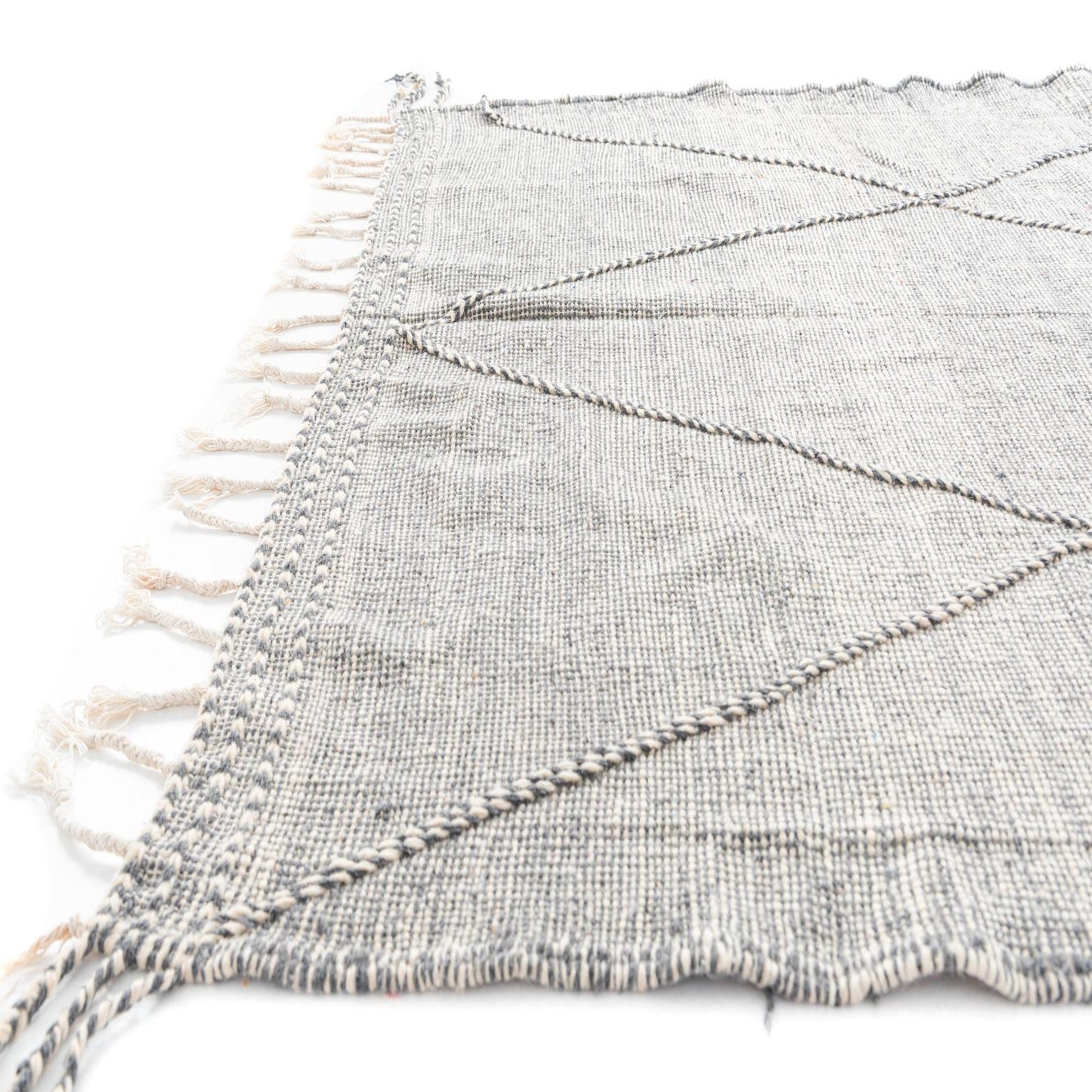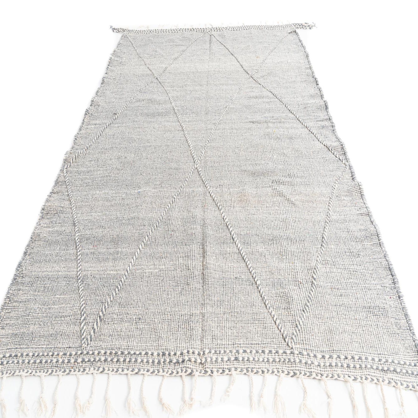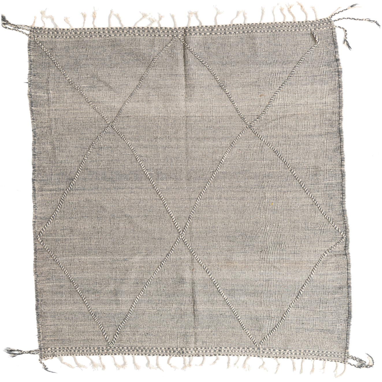 The symmetrical diamond design is highlighted by raised weaving that adds dimension and texture to this handcrafted rug. The inclusion of fringe on the ends contributes to its authentic Moroccan aesthetic and heritage. Its versatile color palette of gray and ivory makes it a suitable addition to a variety of design settings, ranging from modern and minimalist to more traditional or eclectic interiors.