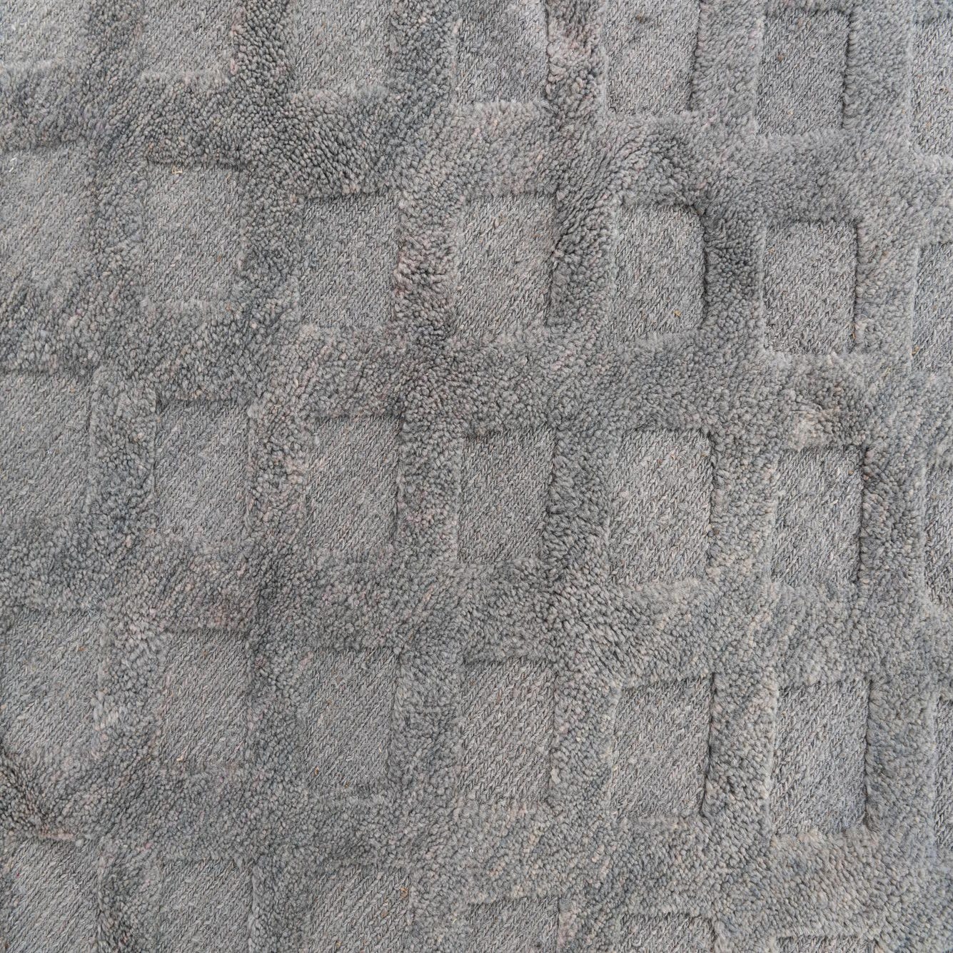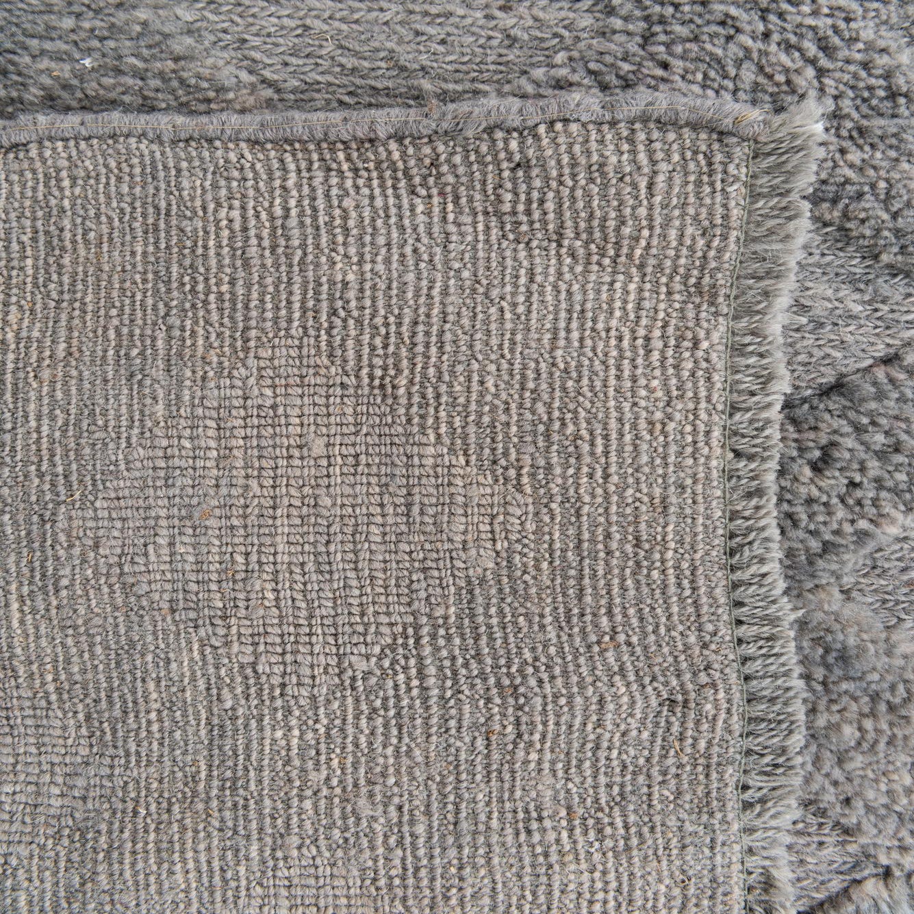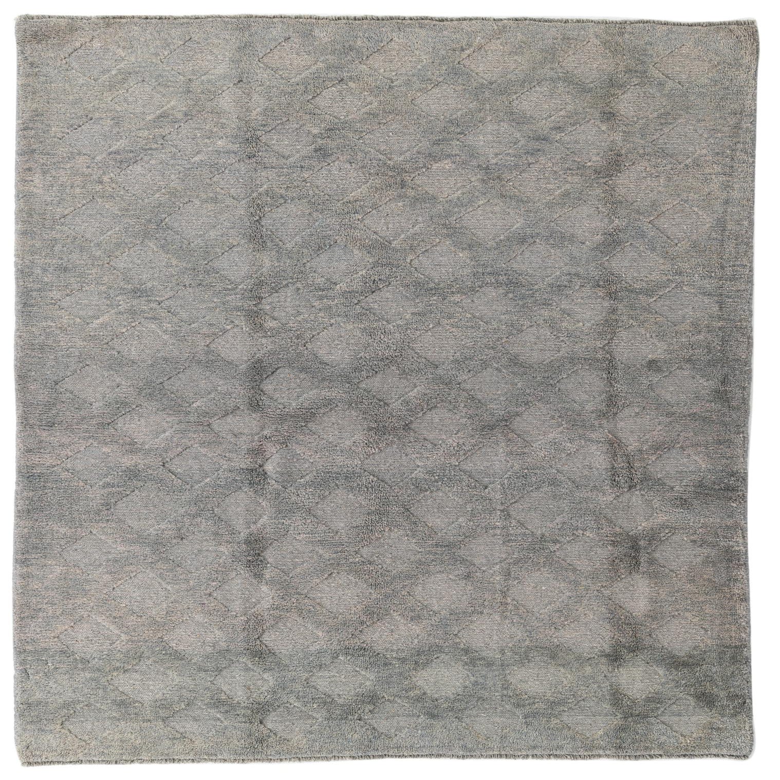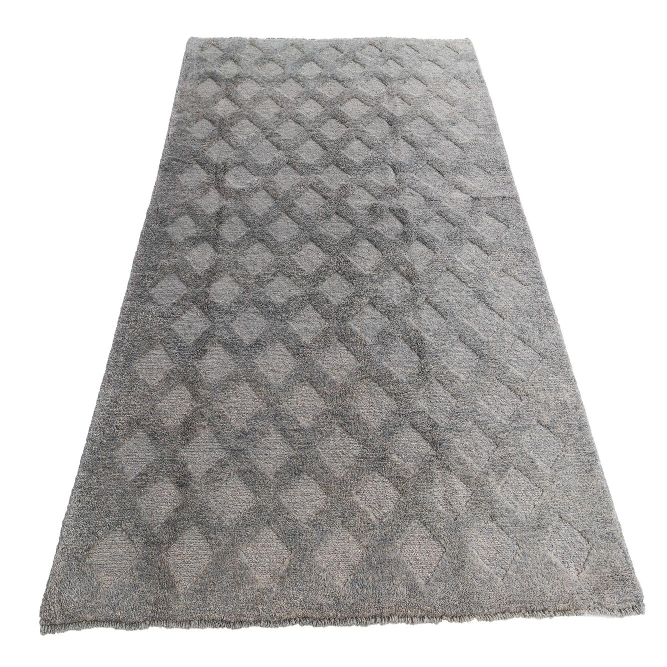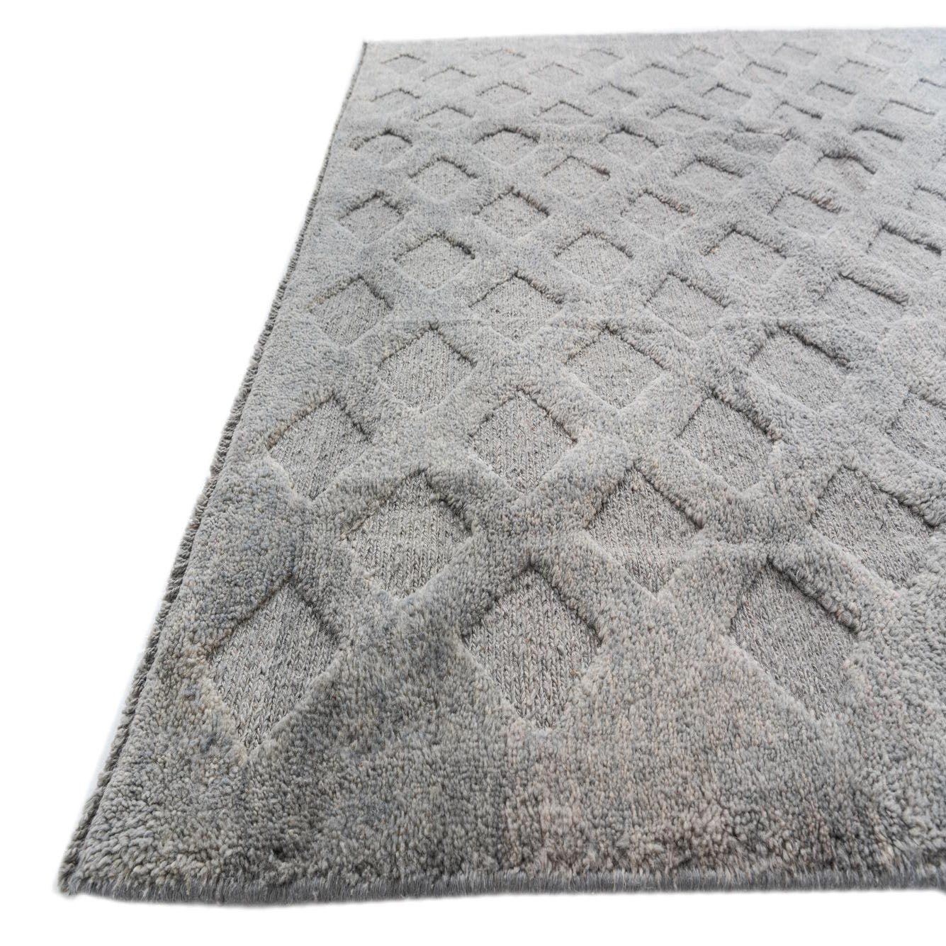 This Moroccan Collection rug is a hand-knotted 6x9 piece, crafted using 100% wool that offers a plush feel and durability. It showcases a muted gray backdrop with a discreet diamond lattice pattern that provides a subtle nod to traditional Moroccan designs. The texture is rich and inviting, contributing to a cozy atmosphere within a space.