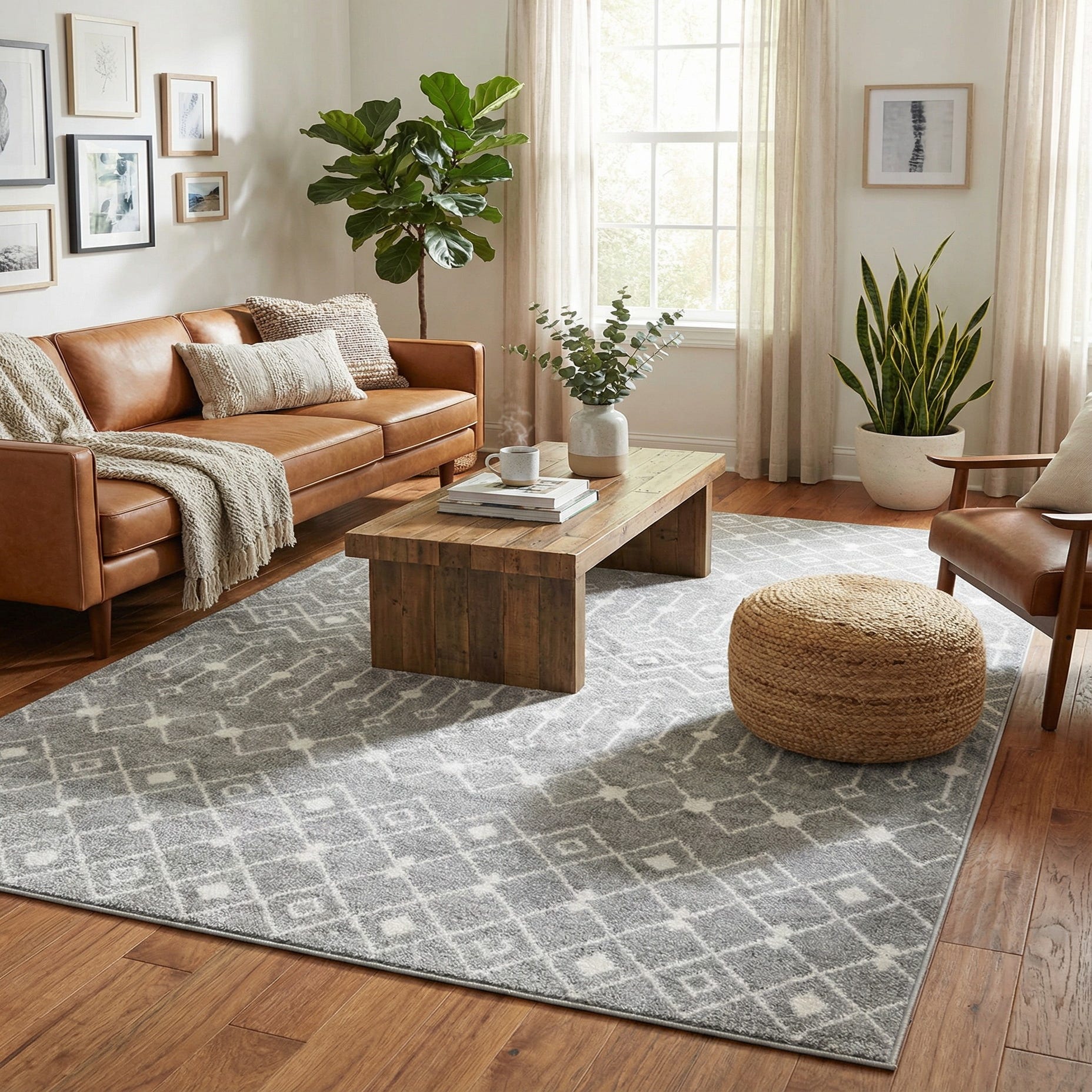Place this rug under a seating group to anchor a living room, layer it beneath the lower two-thirds of a bed for added texture in a bedroom, or use it in a home office to introduce subtle patterning. Its gray-and-ivory palette pairs easily with light wood tones, matte metals and neutral textiles, fitting neatly into modern, transitional, Scandinavian or coastal interiors that favor clean lines and calm colors.