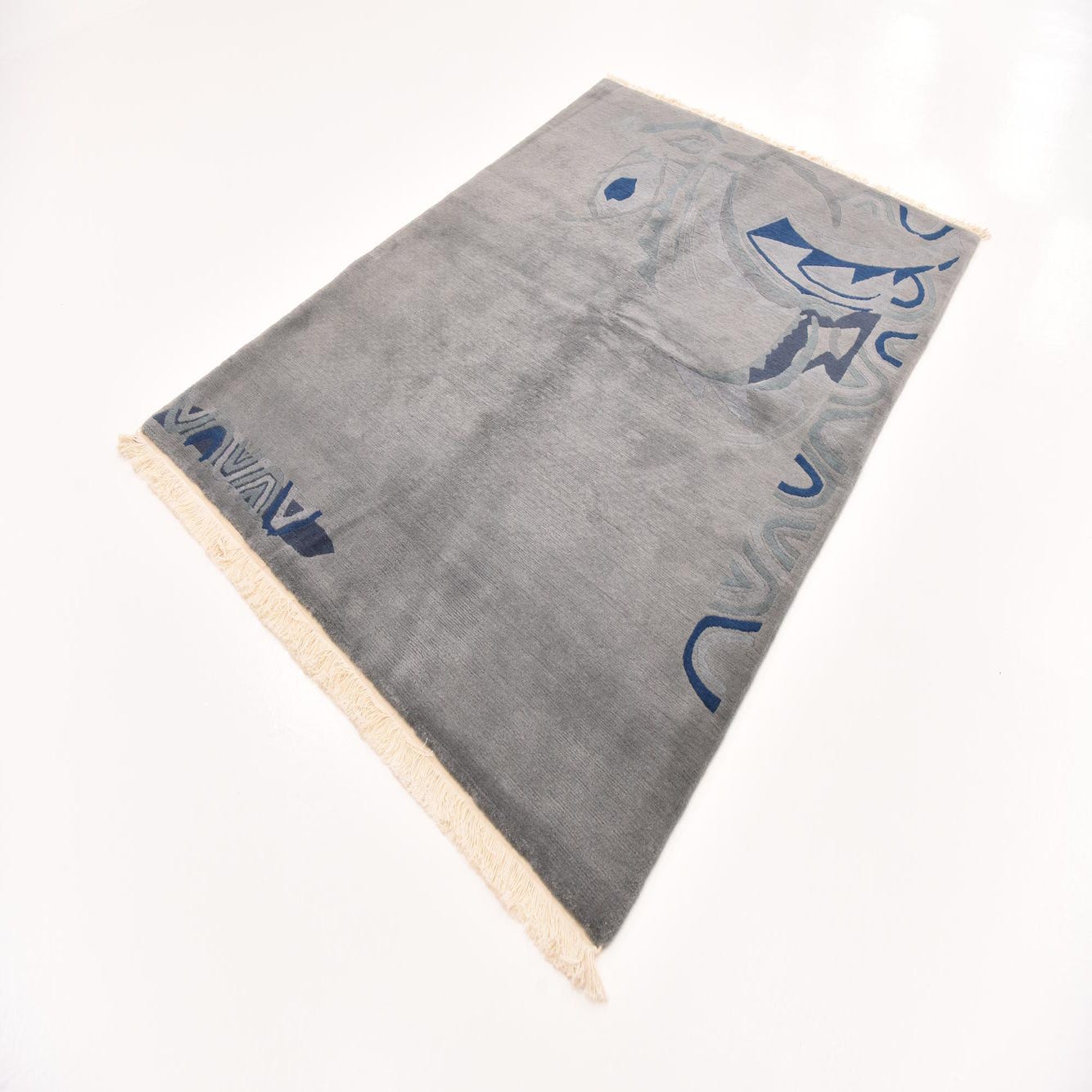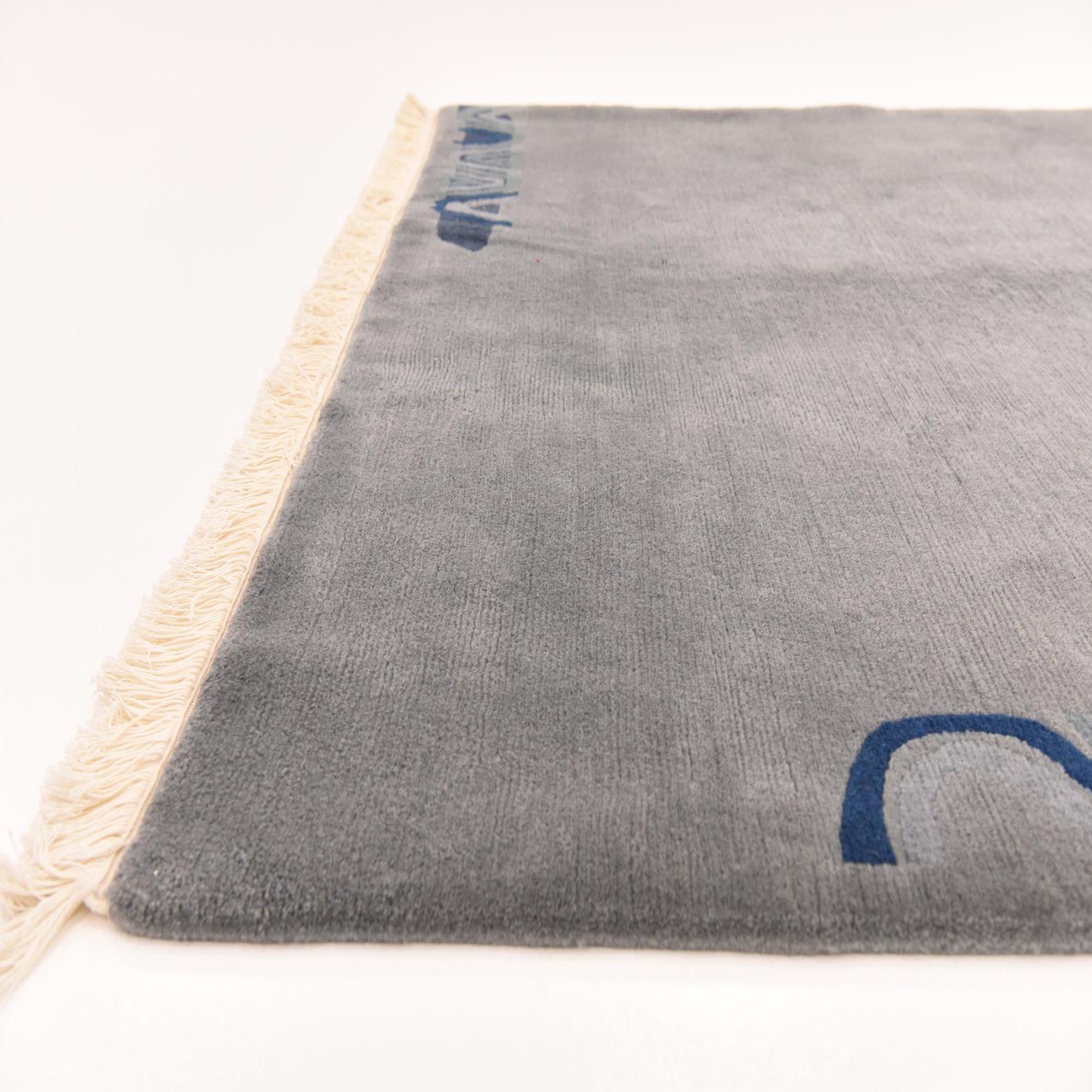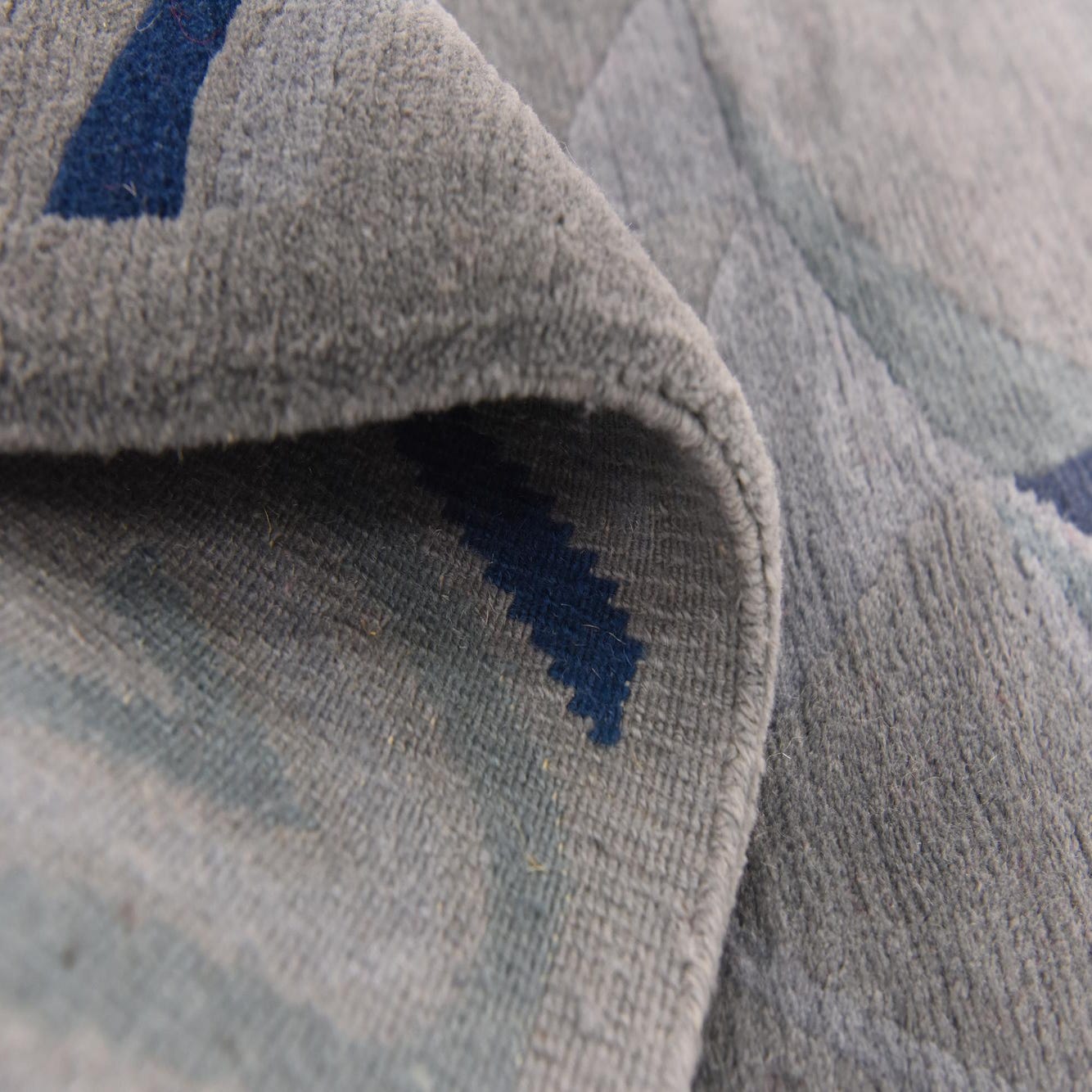 A 6x9 rectangular gray wool rug with a high pile, featuring an abstract, modern design in shades of blue and gray, with white fringe.