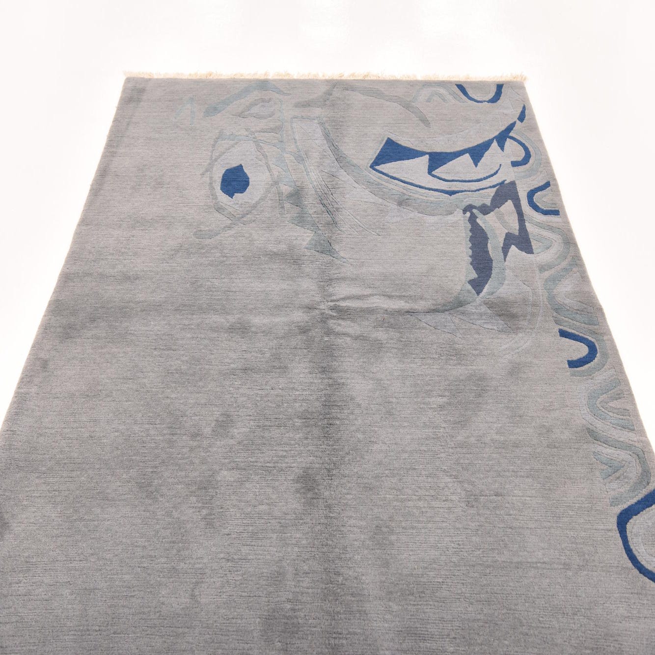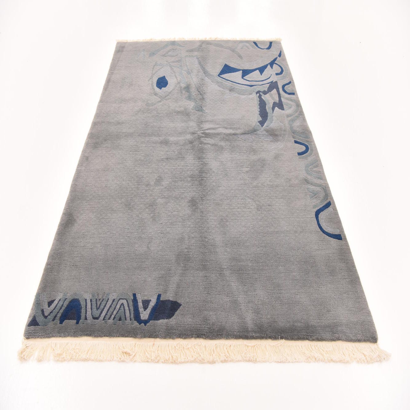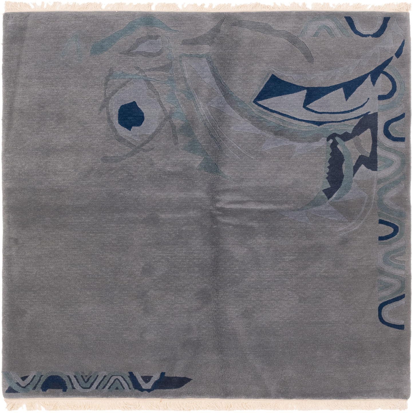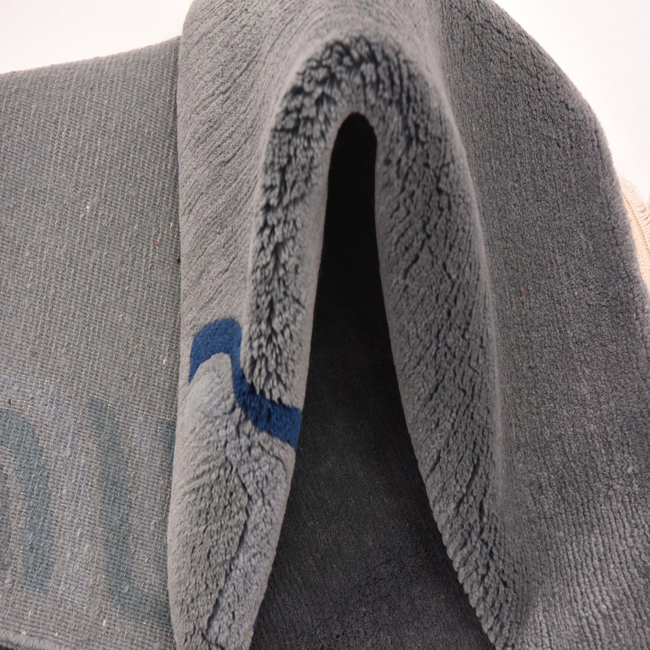A 6x9 rectangular gray wool rug with a high pile, featuring an abstract, modern design in shades of blue and gray, with white fringe.