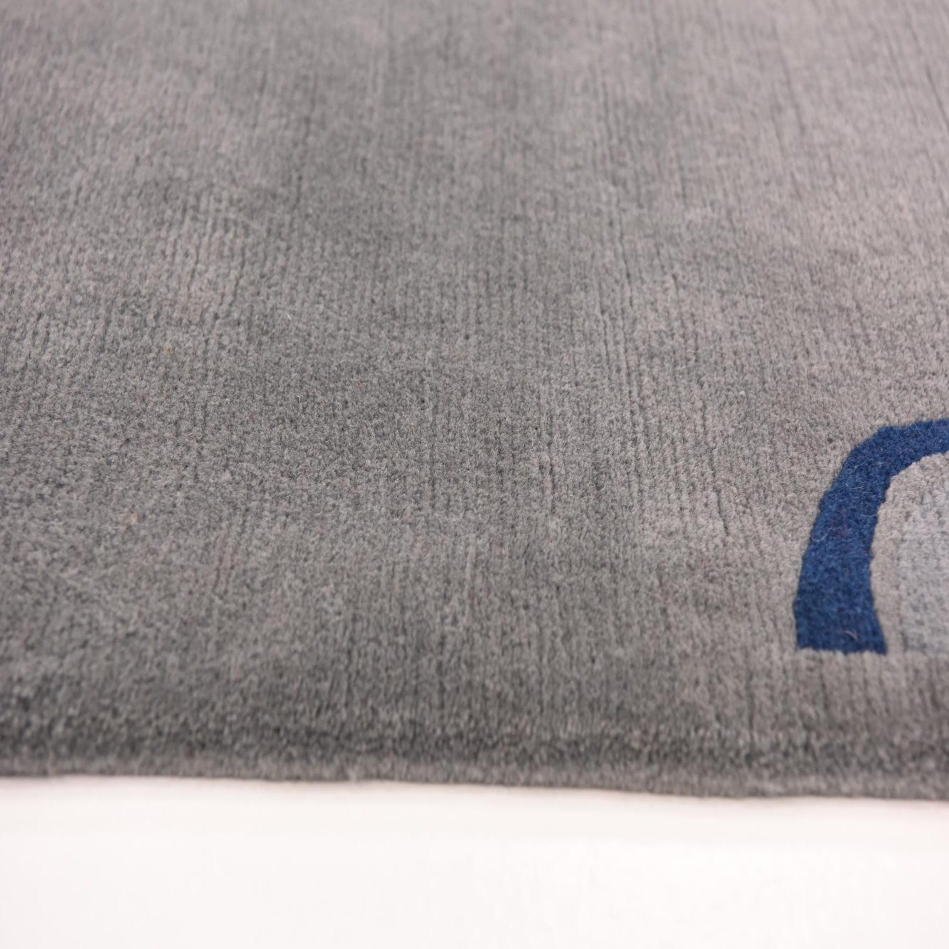 Hand-knotted of 100% wool, this rug has a dense, velvety pile that cushions underfoot and a subtle woolen sheen that catches light. The slightly raised color areas give a gentle dimensional texture against the smooth gray ground, and short fringed edges complete the look. Place it beneath a low-profile sofa and coffee table in a modern living room, layer it in a serene bedroom with oak or walnut furnishings, or use it to bring color and texture to a home office paired with metal or glass accents.