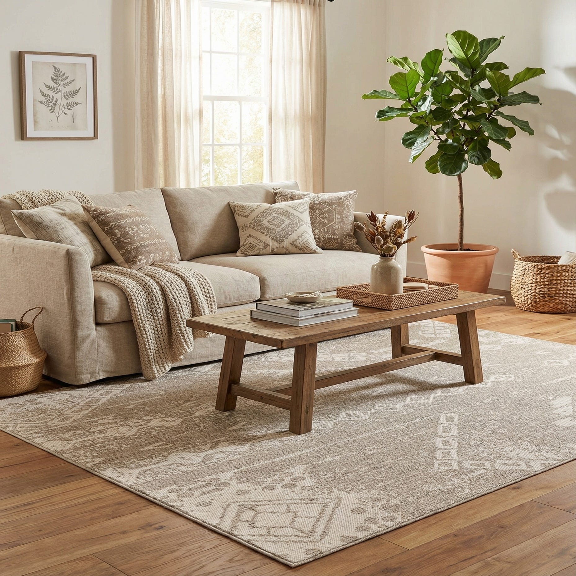 Its neutral coloring and subtle pattern make it versatile for various decorating themes, from minimalistic modern settings that require a touch of texture without overwhelming the space, to more rustic or Mediterranean-inspired decors that benefit from the rug's earthy tones and simple design.