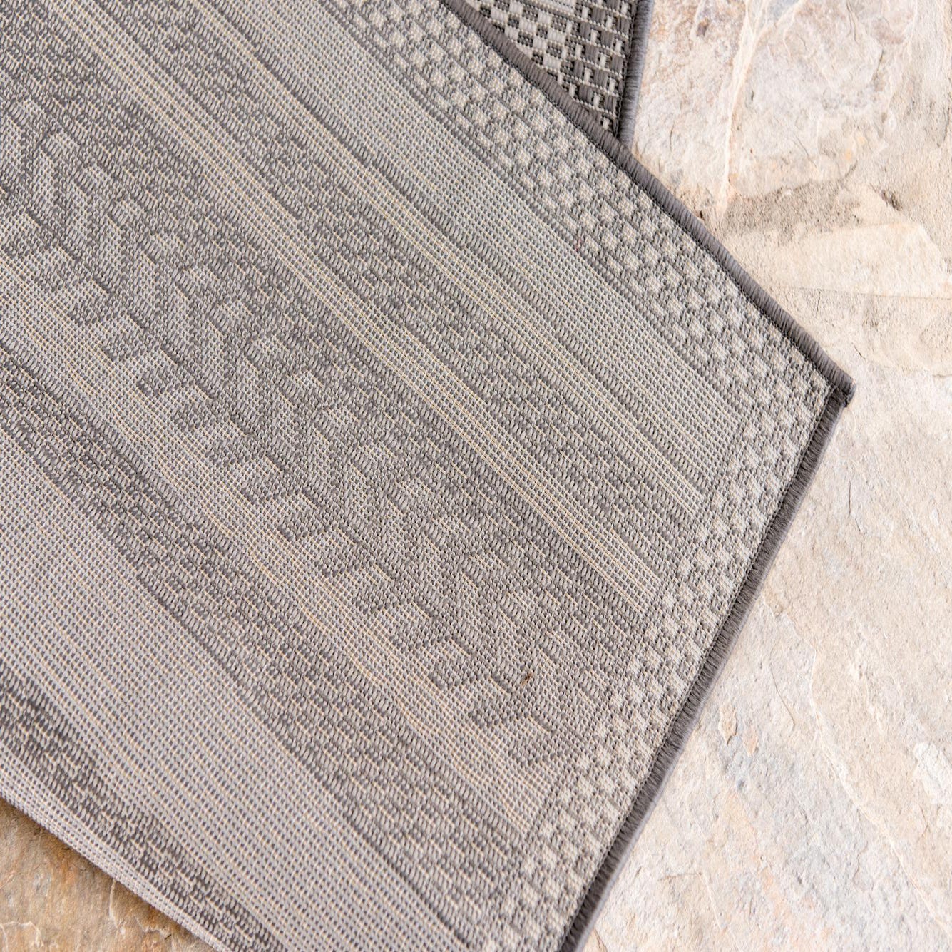 A clean, low-profile indoor/outdoor rug with a layered stripe motif in gray and silver. The field is a soft gray ground woven with alternating bands of tiny geometric checks, linear textures and a bold chevron stripe that runs across the width, while a narrow, dotted border frames the edges. The weave sits flat underfoot with a smooth, durable surface that highlights the contrasting silver accents without adding bulk.