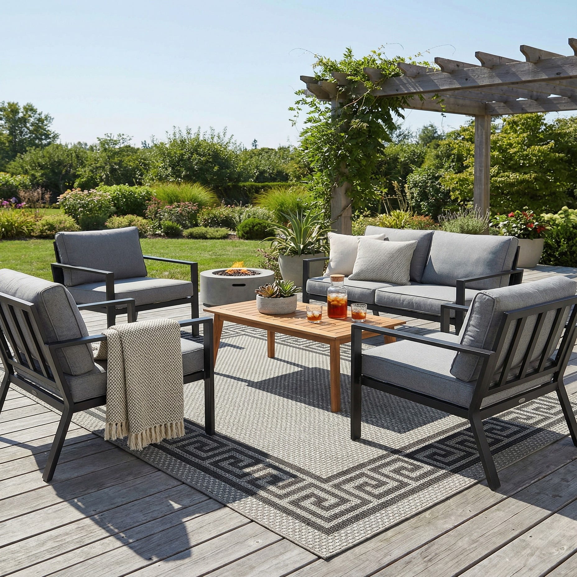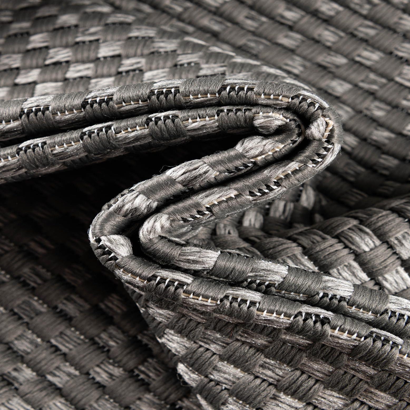 This design works well on covered patios, sunrooms, and high-traffic living spaces where a clean, architectural look is desired. Pair it with metal or teak outdoor furniture and neutral cushions for a modern alfresco dining area, or layer it beneath a simple sectional and glass coffee table in a monochrome living room to anchor the seating. It also complements minimalist, coastal, and Mediterranean-inspired schemes that benefit from a strong border and a subtle, woven texture.