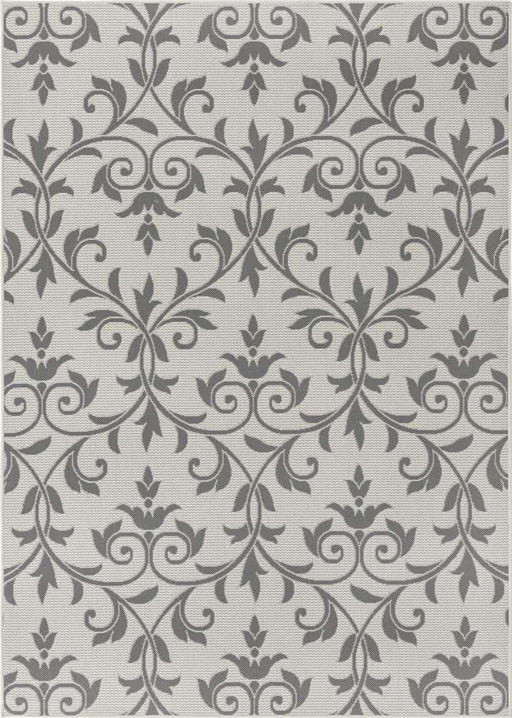 Place the rug on a covered patio or sunroom to add pattern without overwhelming a casual seating area, or use it inside an entry or dining space to anchor neutral furnishings. Pair it with light-washed woods and silver metal accents for a contemporary take, or layer it under a charcoal sofa and soft linen pillows in transitional living rooms for contrast and calm. Its muted gray-and-silver palette also complements coastal and modern farmhouse palettes, working well alongside white wicker, navy textiles, or streamlined outdoor dining sets.