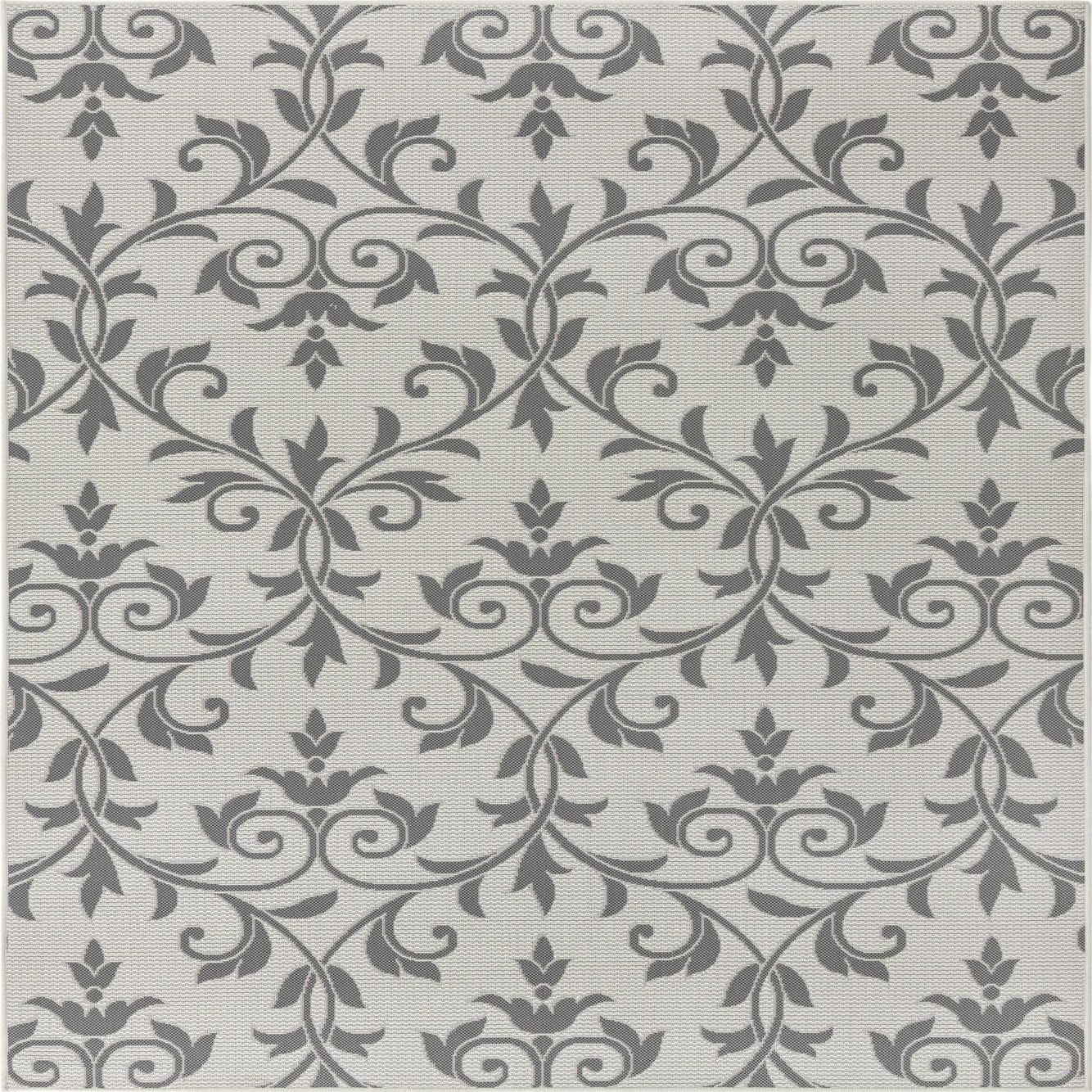 A graceful botanical damask unfolds across a soft gray field, its scrolling vines and stylized blooms rendered in a cool silver tone for a refined, layered look. The motif is woven into the surface rather than printed, so you can feel a subtle texture underfoot — a low-profile, tightly woven surface with a slight ribbed hand that reads clean and tailored. Machine made from 100% polypropylene, the rug combines the crisp definition of the pattern with a smooth, easygoing texture.