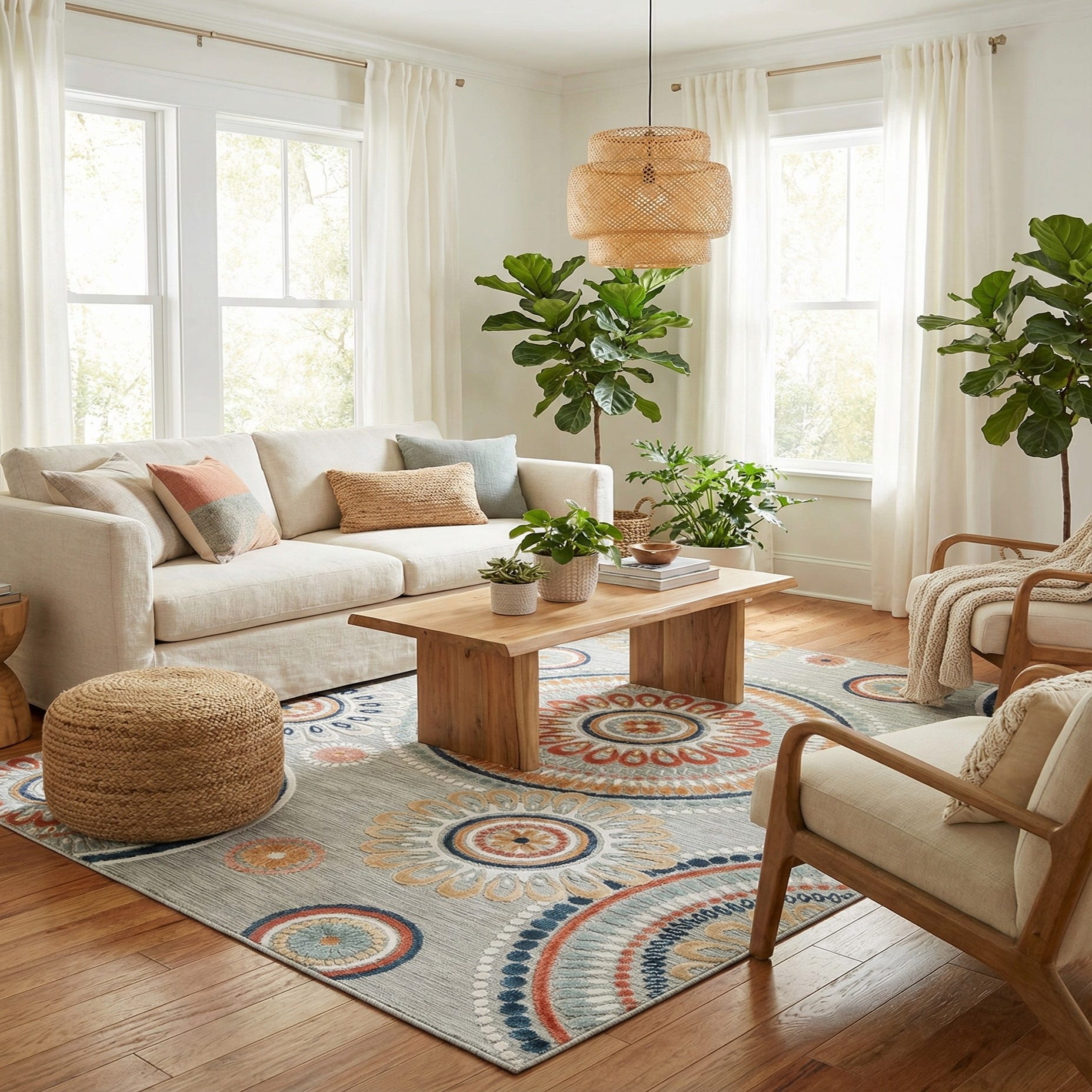 Made of polypropylene for outdoor use, this rug fits well in covered outdoor rooms, screened porches or sunrooms as well as casual indoor spaces like a mudroom or under a bistro set. It pairs nicely with natural materials—wicker or teak seating, light wood tables and linen or ivory upholstery—and coordinates with navy or rust accent pillows to bring out the deeper tones. For a relaxed, layered look, place it beneath a small seating group or use it to anchor an entry area where its pattern will add color and direction without overwhelming the space.