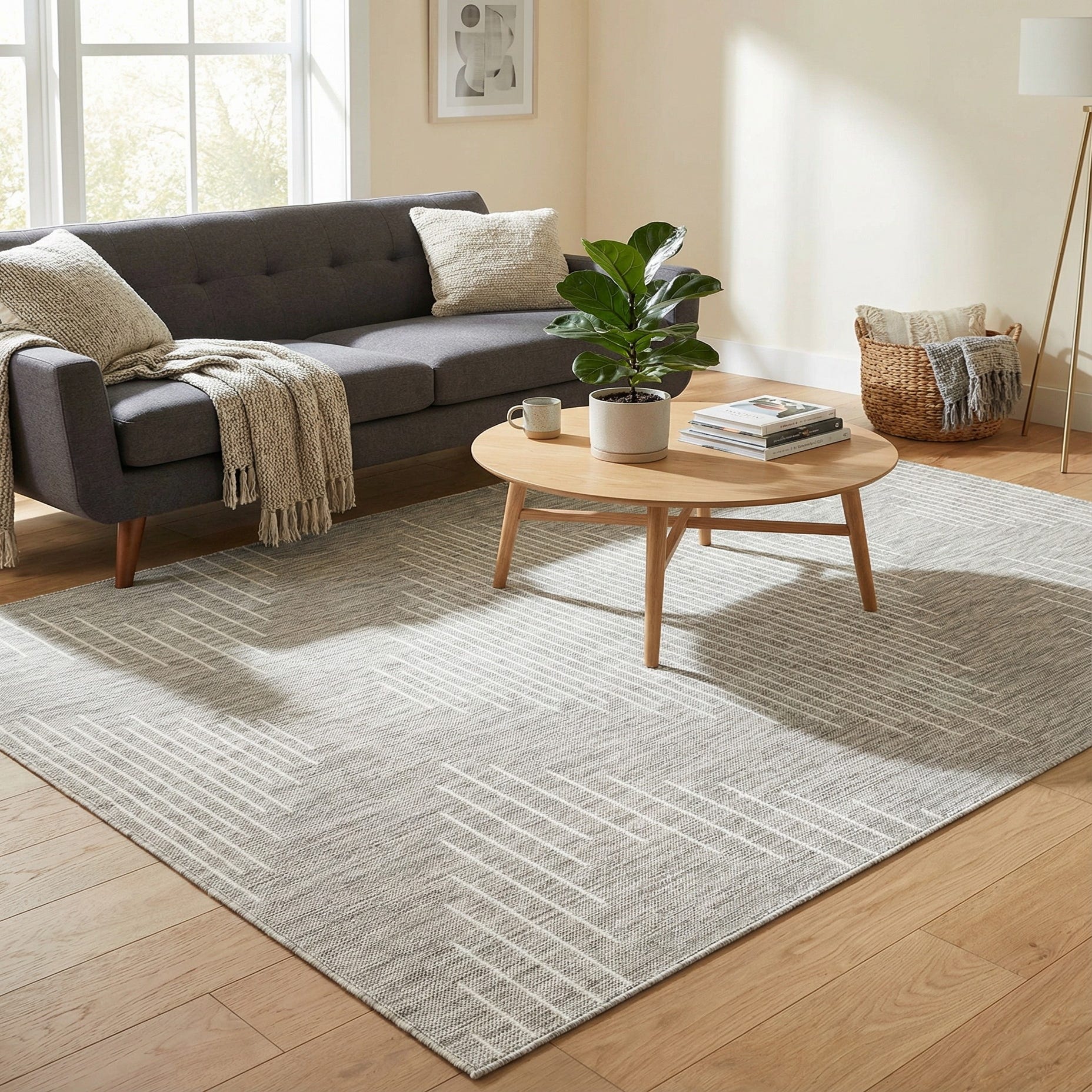 Works well as an anchor for a pared-back living room or beneath a dining table where a neutral palette is preferred. It complements Scandinavian, modern coastal, or minimalist interiors, and also brings a refined, casual look to covered patios or sunrooms when paired with wicker or metal seating. Use with soft linens, light wood tones, and simple accessories to emphasize the rug’s calming geometry and tonal balance.