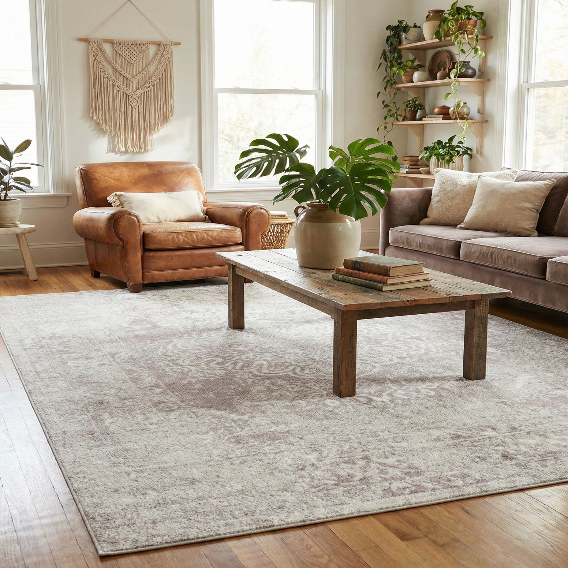 A softly distressed medallion design gives this rug a lived-in, vintage character without heavy contrast. The gray background provides a calm base while the ivory pattern—faded in places—creates delicate floral and curvilinear motifs that sit quietly within the field. A subtle border and layered tonal variations add depth, so the overall look reads traditional with a contemporary, lived-in finish.