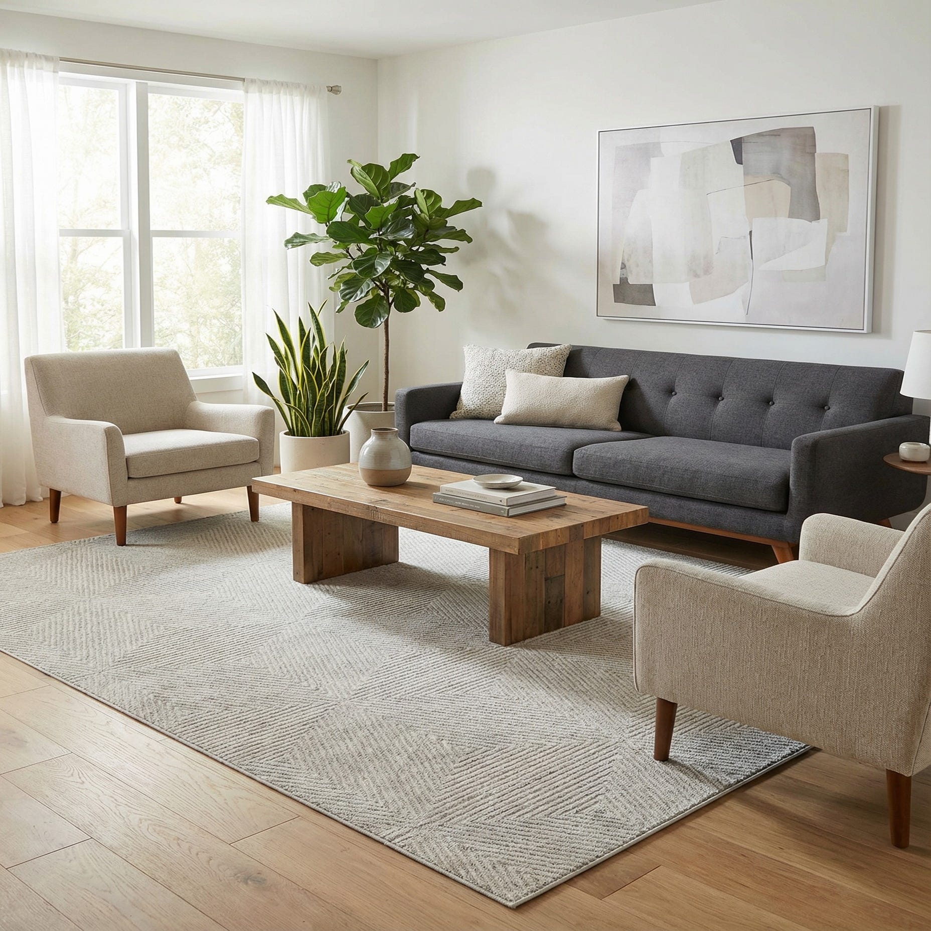 A 6x9 rectangular gray modern area rug with a subtle geometric triangular pattern, suitable for indoor or outdoor use.