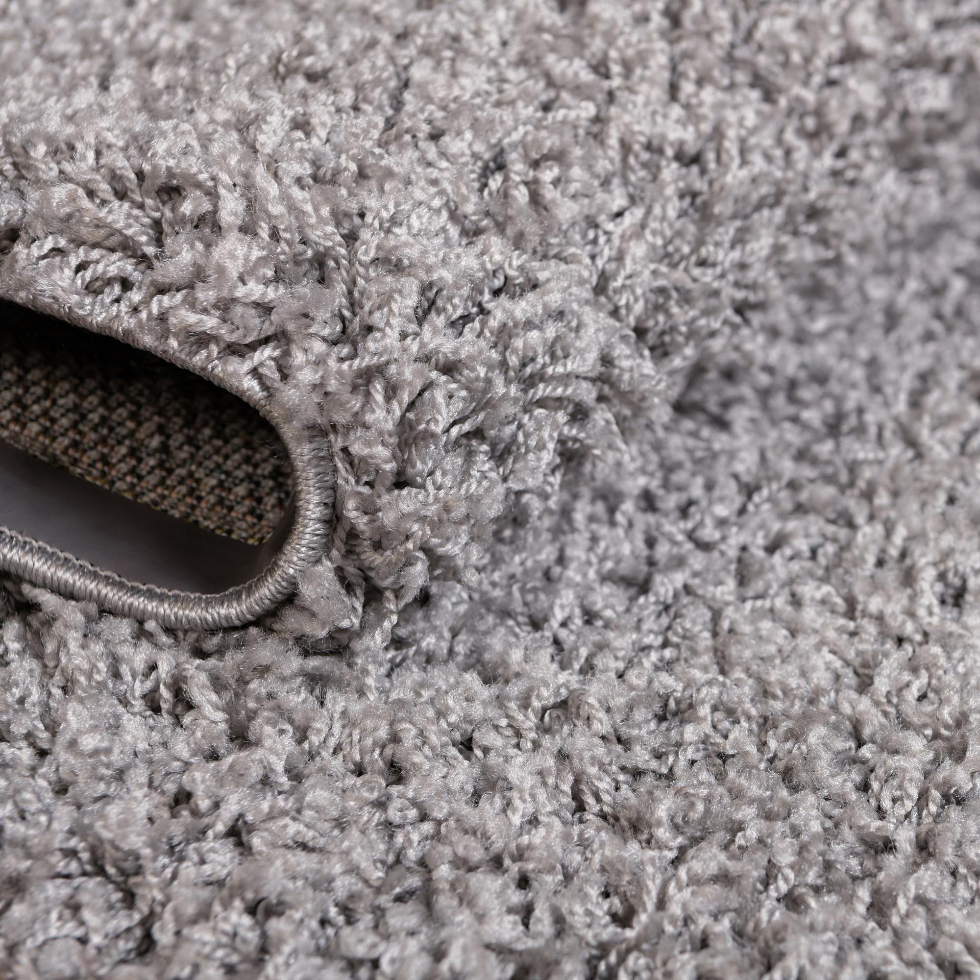 A solid gray shag with a uniform, unpatterned surface, this rug is made with a plush, high-pile polypropylene construction that feels soft and cushiony underfoot. Running your hand across the fibers reveals a dense, slightly lustrous pile that gives the gray color subtle depth and movement as light shifts. The machine-made construction delivers consistent texture and an even finish across the entire field.