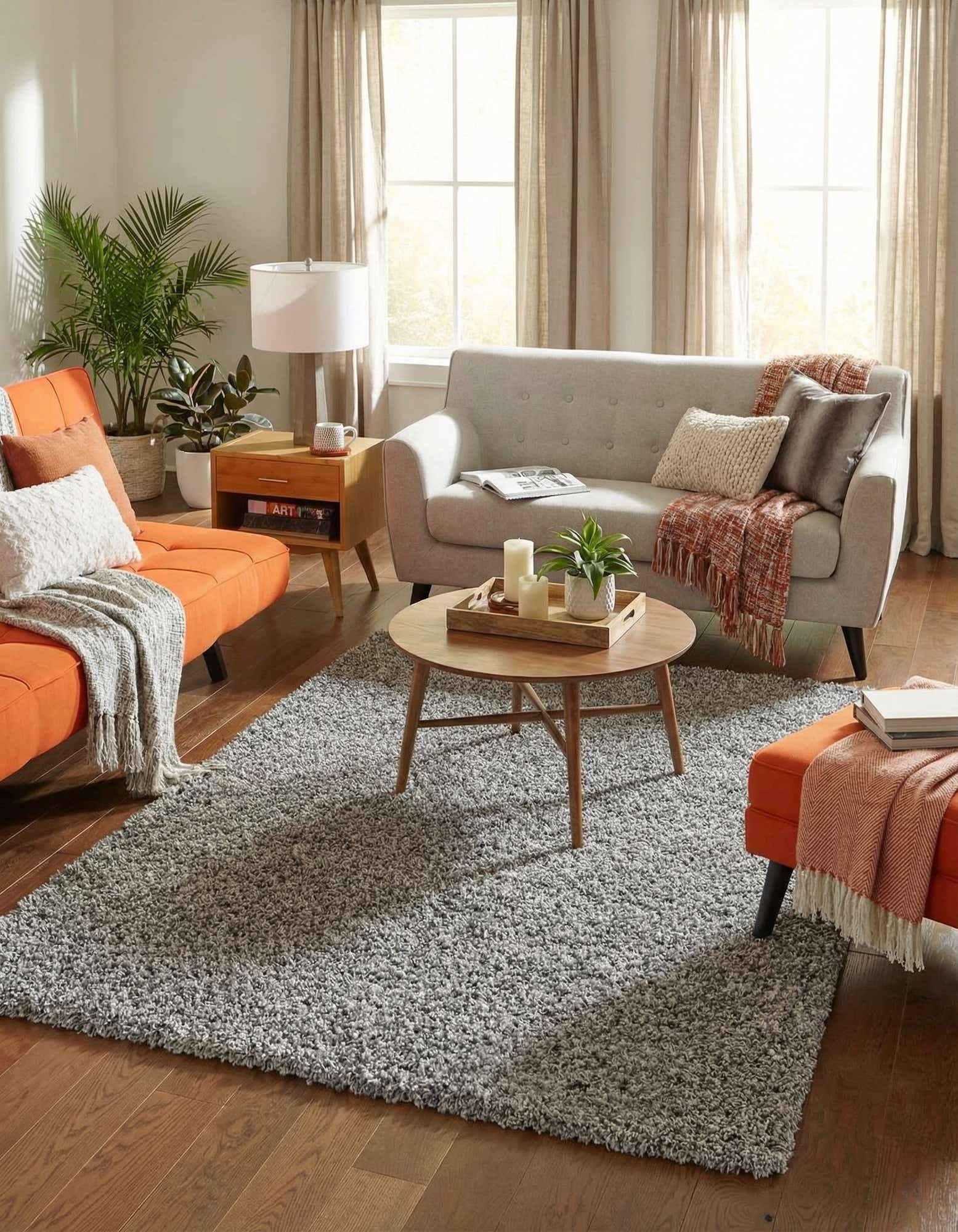 This versatile piece works well in living rooms and bedrooms where extra softness is desired, and it pairs easily with modern, Scandinavian, or transitional interiors. Use it under a low-profile sofa and coffee table to anchor a seating area, layer it in front of a fireplace for added warmth, or place it at the foot of a bed to create a cozy landing. The neutral gray backdrop supports both bold accent colors and tonal, minimalist palettes.