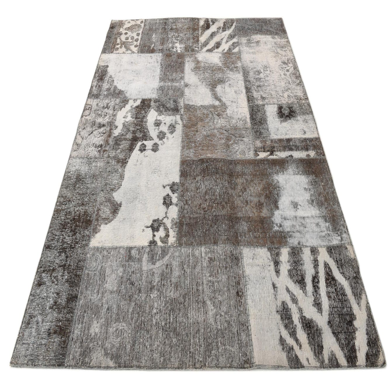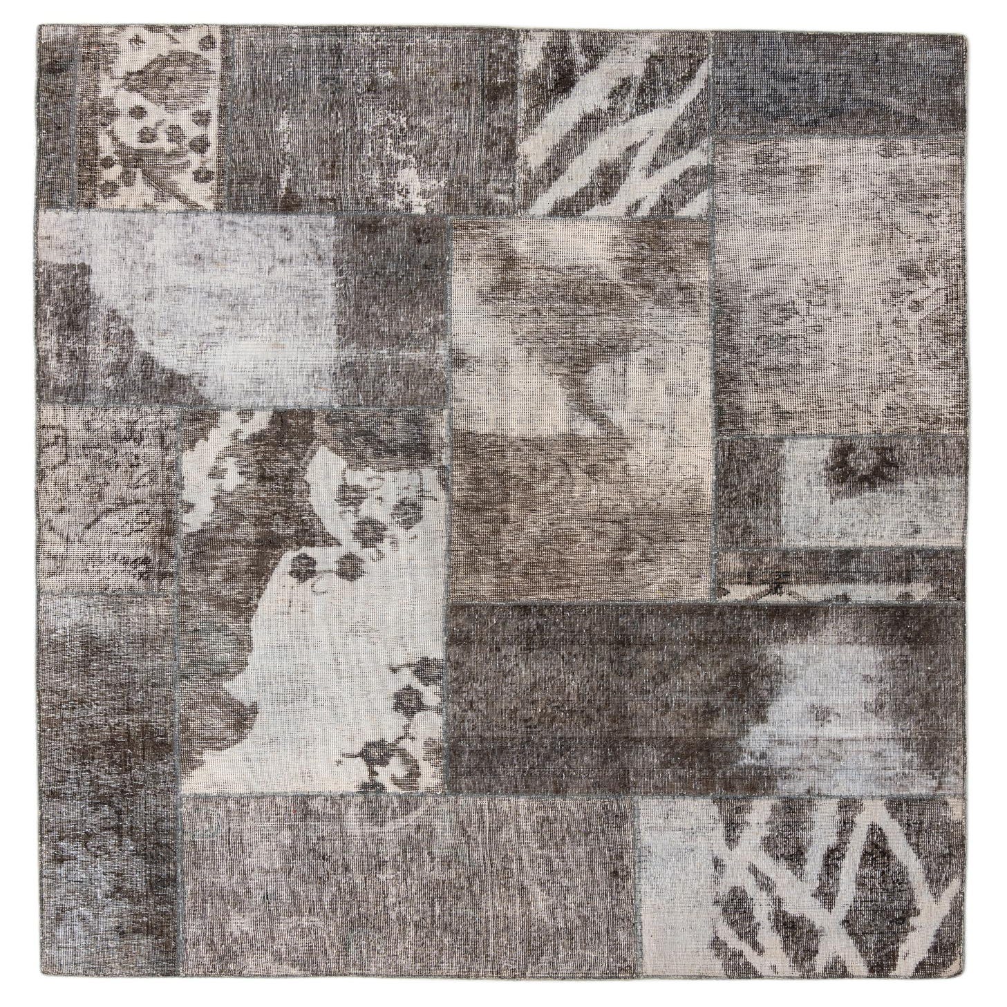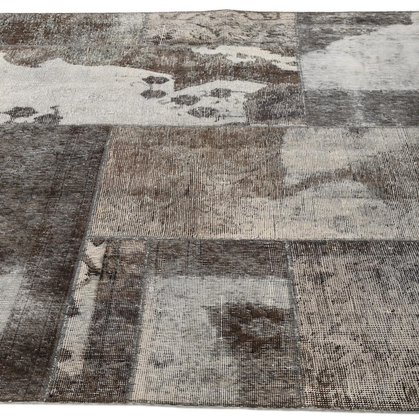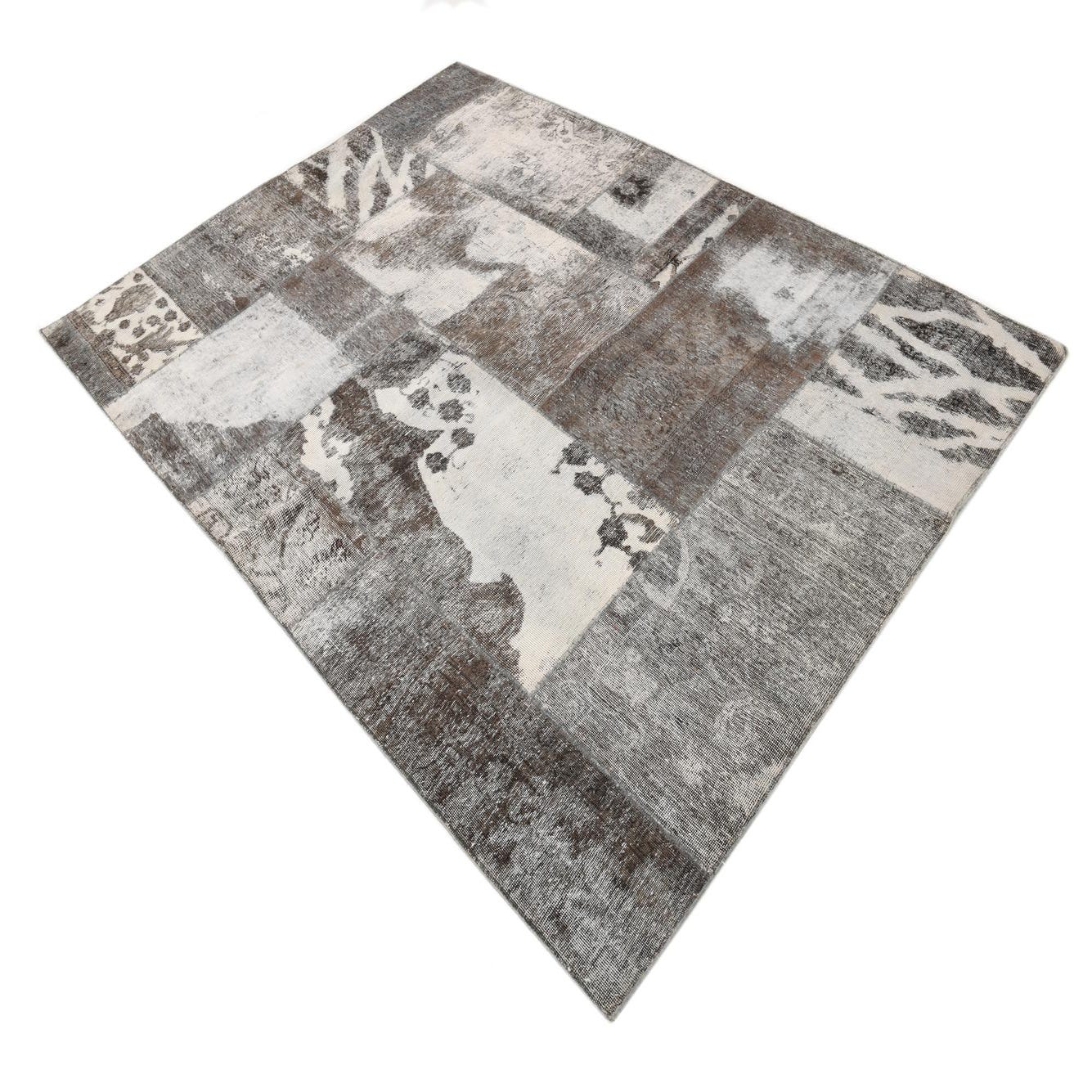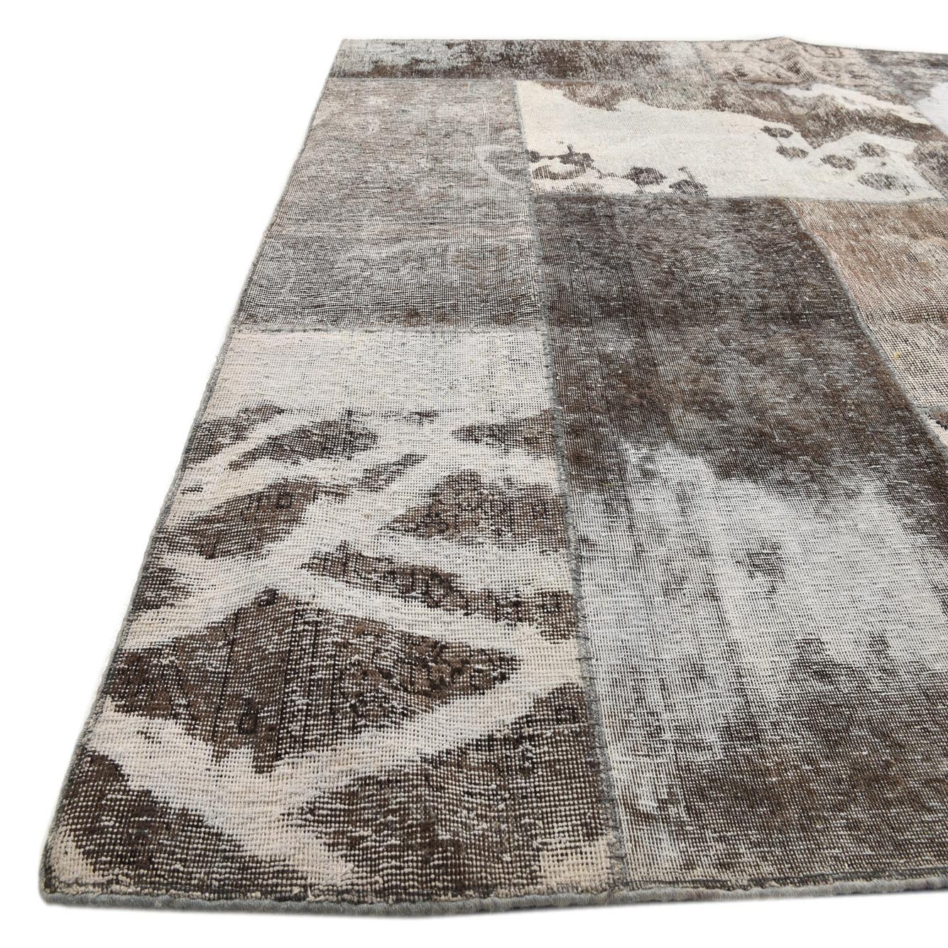 A 6x9 rectangular Ultra Vintage wool rug featuring a patchwork design in various shades of gray and silver, blending Persian, modern, and abstract patterns.