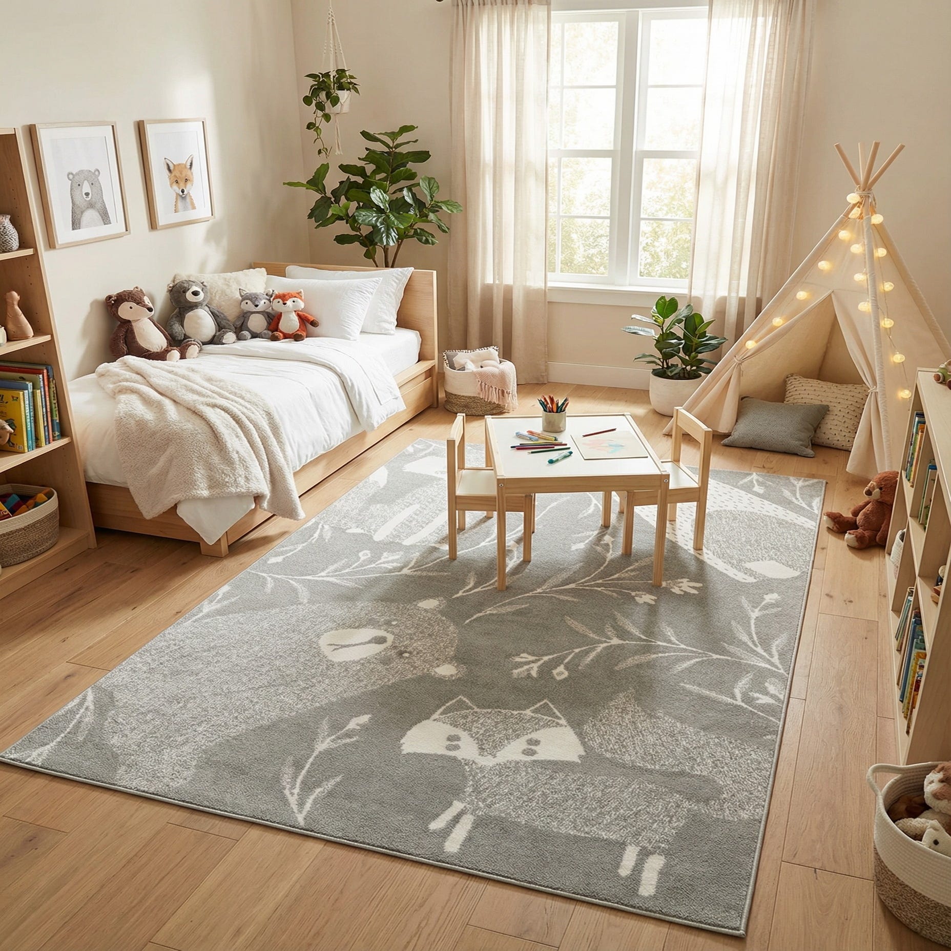 A soft gray field provides a calm backdrop for a charming ivory pattern of woodland friends — bears, foxes and owls — woven alongside slender, hand-drawn branches and buds. Machine-made from 100% polypropylene, the surface has a low-to-medium pile that feels slightly cushioned and velvety underfoot, with enough definition in the tone-on-tone design to keep the motifs clear without harsh contrast. The overall style is playful yet restrained, pairing child-friendly imagery with a modern, neutral palette.
