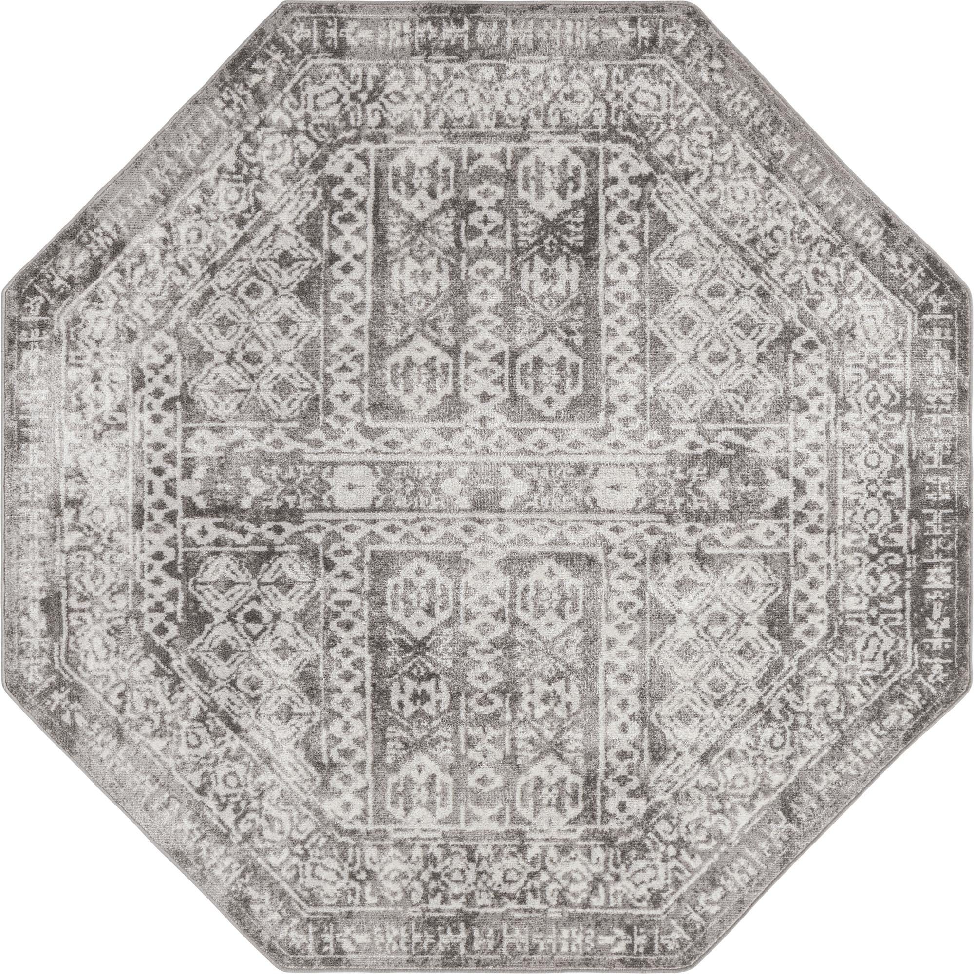 An octagonal rug with a layered, vintage-style medallion and border pattern, rendered in ivory motifs on a gray background. The design pairs geometric and floral elements in a softly distressed finish that gives the rug a lived-in, antique feel. Machine-made from 100% polypropylene, the surface has a low, dense pile with a smooth hand and subtle sheen—clear pattern definition with a tactile, comfortable presence underfoot.