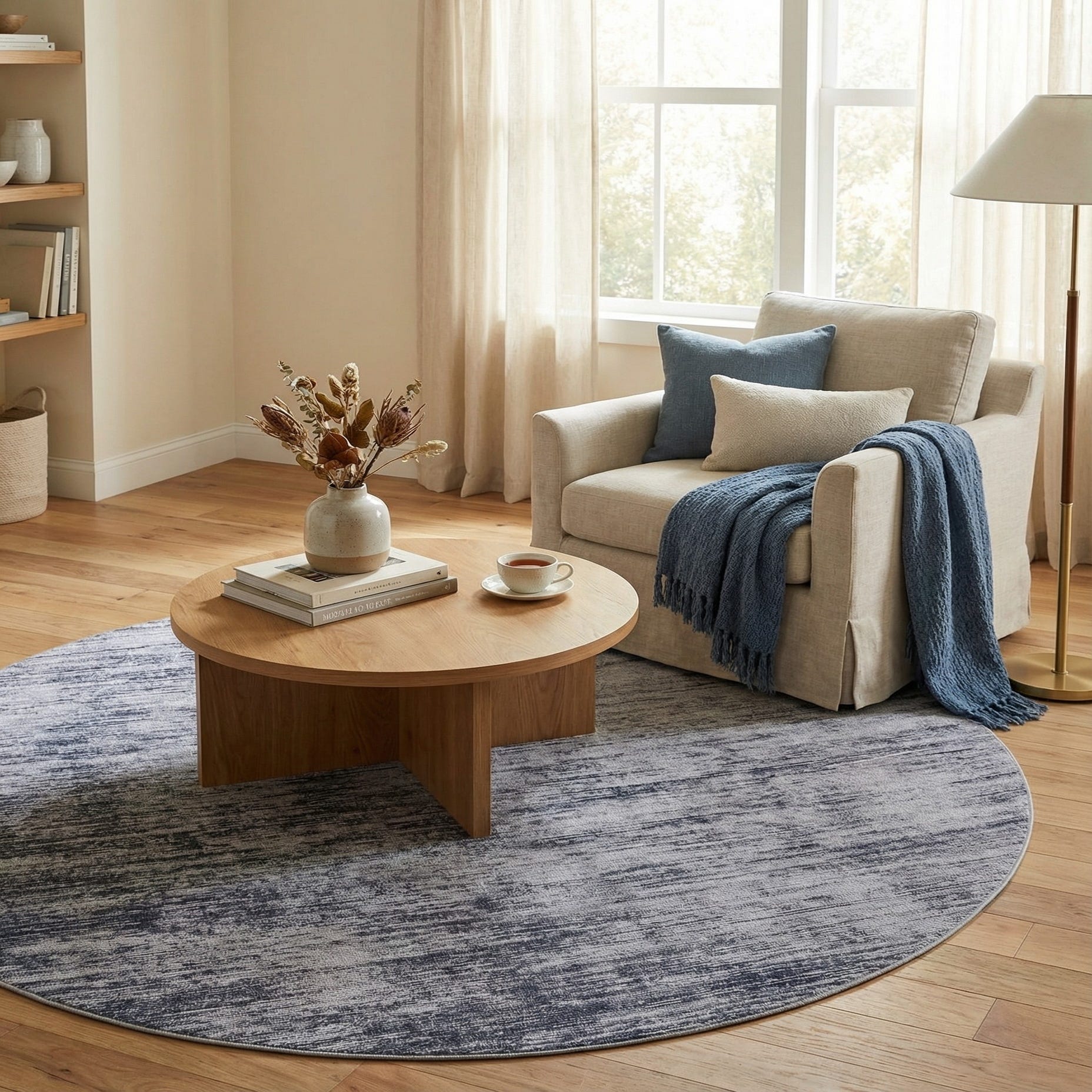 This piece works well as an anchor in contemporary and transitional rooms—place it beneath a round coffee table to soften a seating area, or center it beneath a circular dining table to define an intimate eating nook. It also layers nicely on hardwood or tile in a bedroom or home office, pairing easily with cool color palettes, warm wood tones, or matte metal accents to add tactile interest without overwhelming a space.