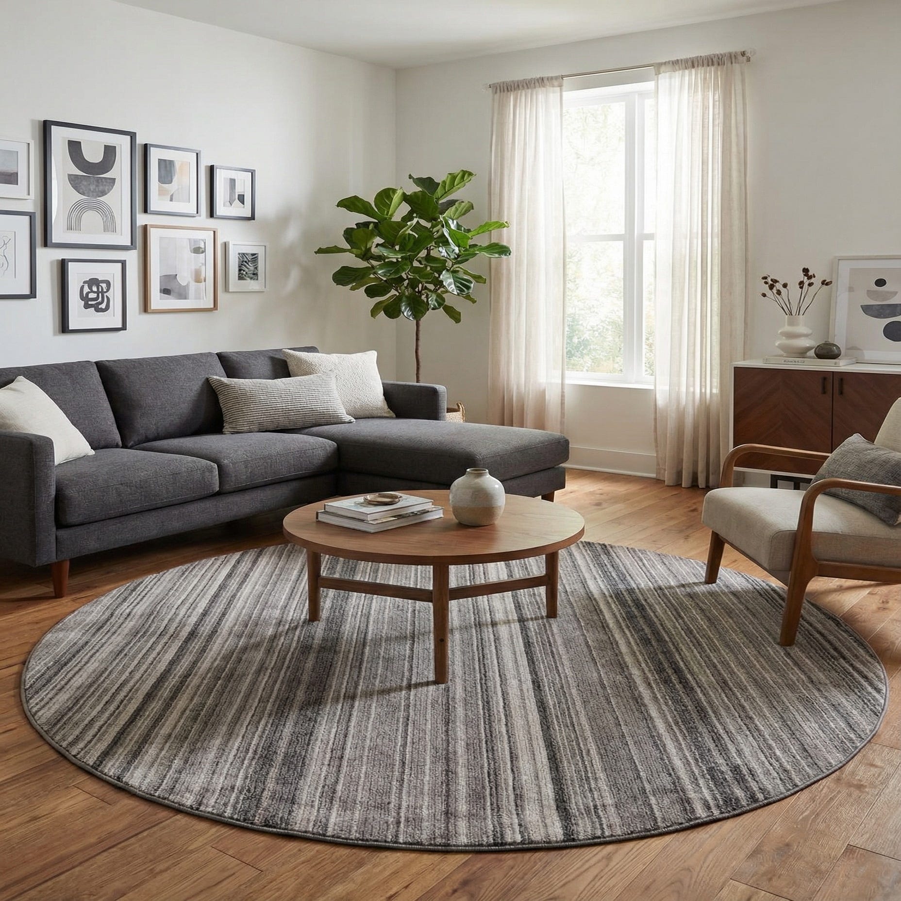 A 7' 3 x 7' 3 round gray area rug with a modern striped pattern, featuring varying shades of gray and silver.