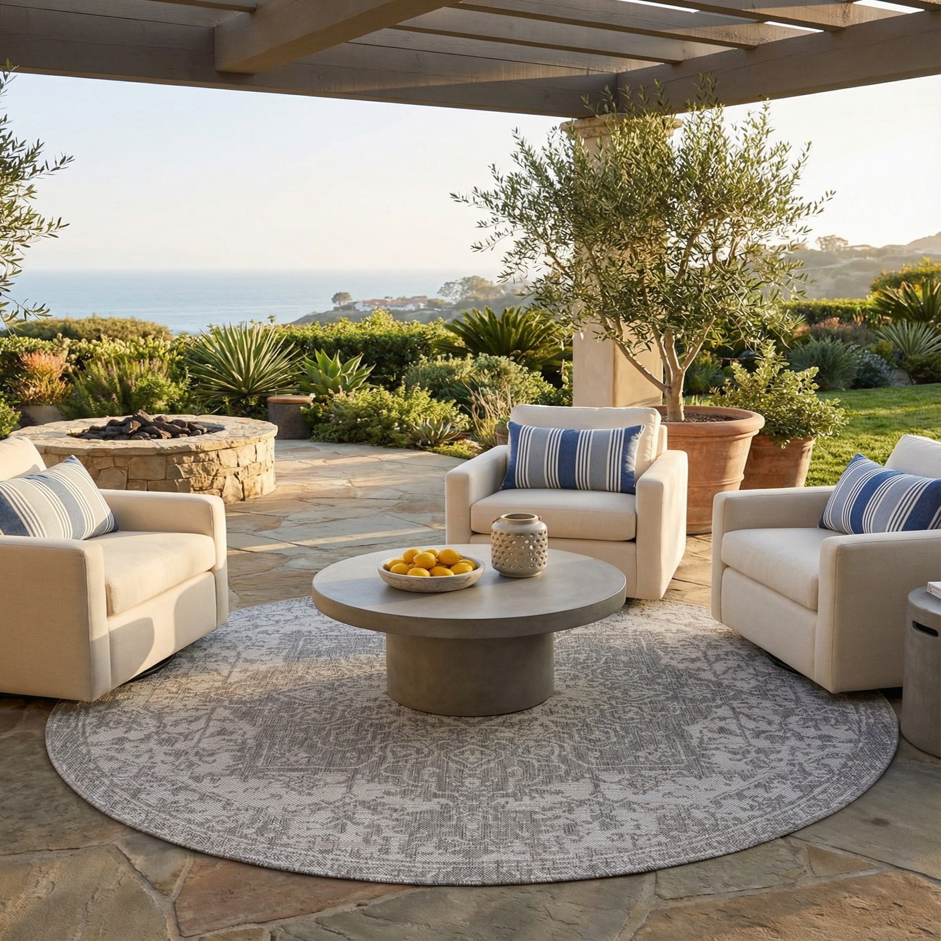 Use this round piece to anchor a breakfast nook or cozy conversation area, place it beneath a bistro set on a covered patio, or add it to a sunroom to tie together wicker and weathered wood pieces. It pairs naturally with neutral linens, matte-metal accents, and natural textures, fitting well in coastal, modern farmhouse, and transitional interiors that favor calm, layered palettes.