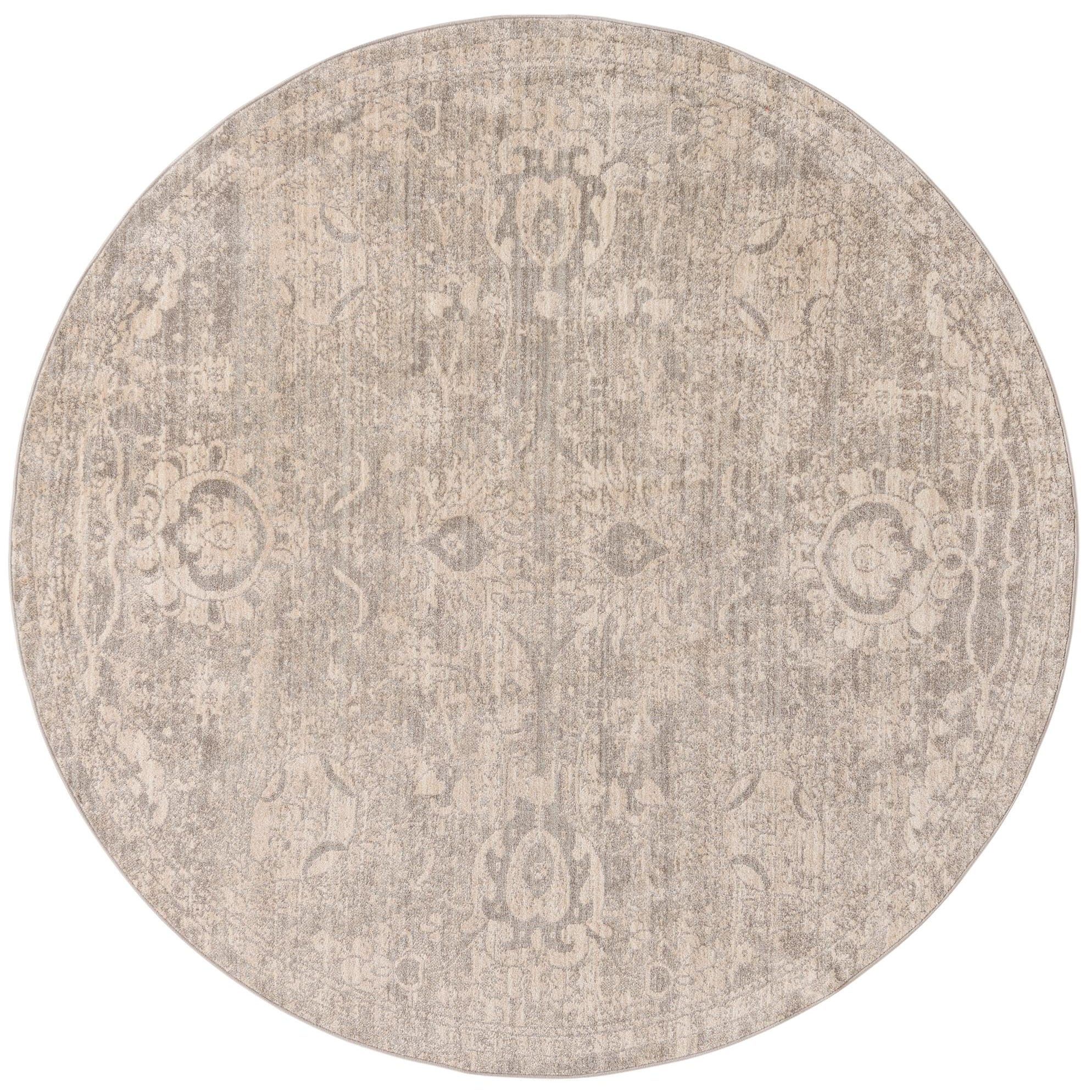 A 7' 0 x 7' 0 round gray and silver traditional rug with a vintage floral pattern, suitable for indoor spaces.