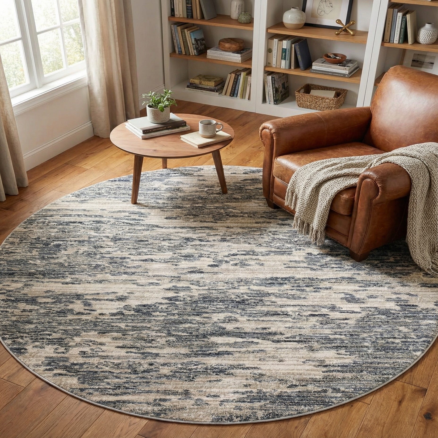 The round shape makes this piece a natural fit beneath a round dining table, as a grounding element in a seating vignette, or beside the bed to soften a bedroom floor. Pair it with light woods and linen upholstery for a relaxed, coastal-inspired scheme, or combine with navy accents and clean-lined furnishings for a modern-transitional look. The neutral gray base and muted blue highlights allow the rug to complement both warm and cool palettes, bringing quiet texture and layered color to living rooms, dining areas, and bedrooms.