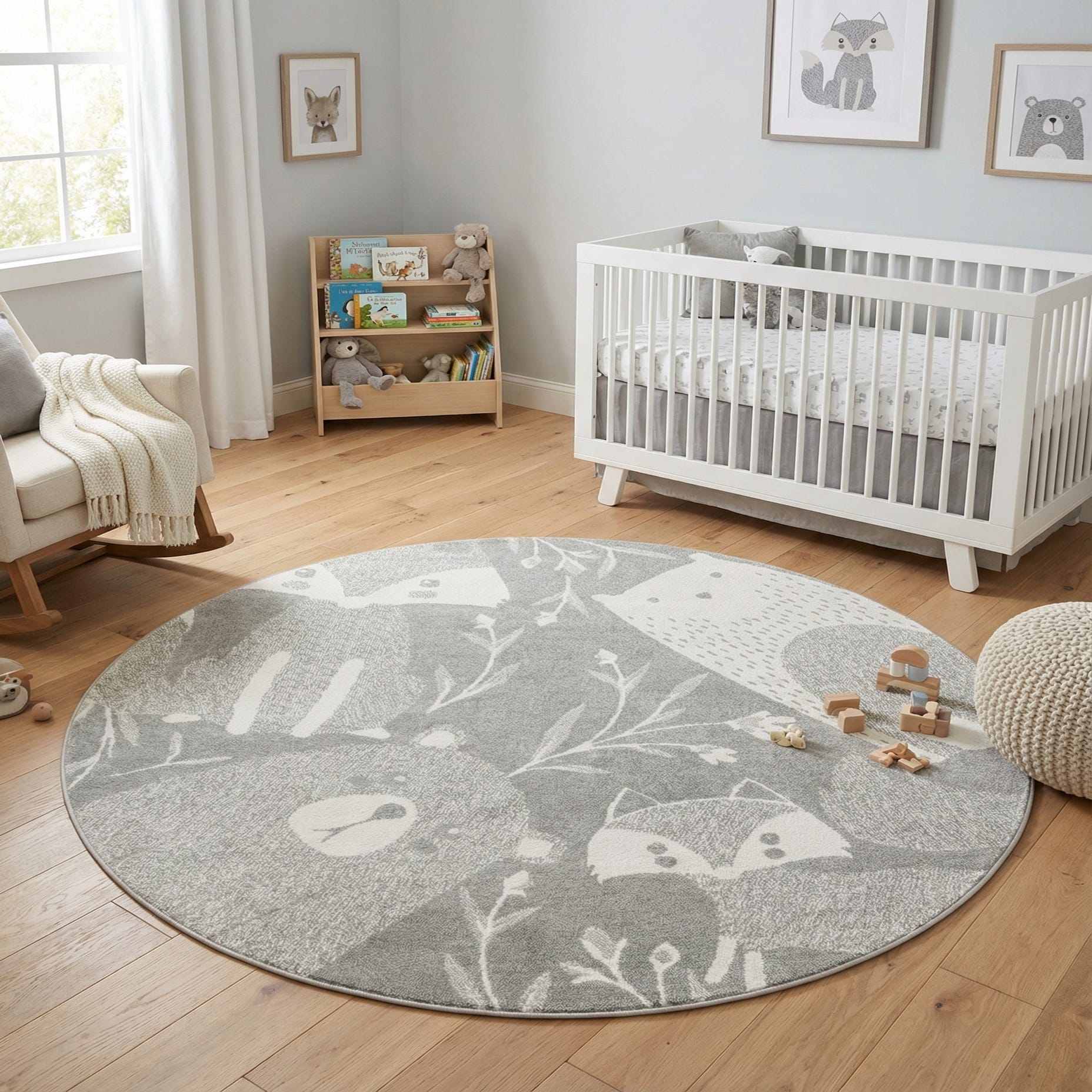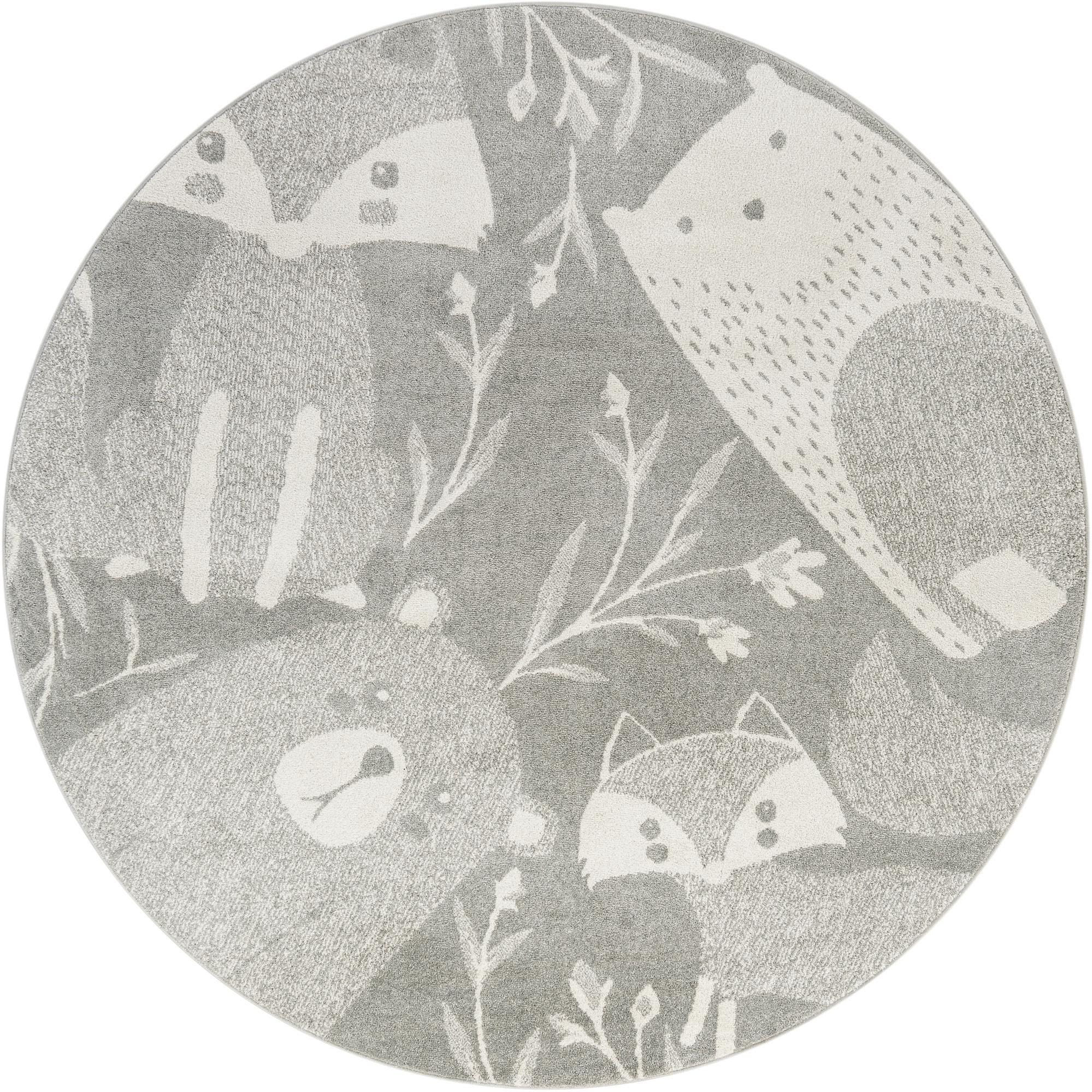 A 7' round gray rug featuring a playful modern design with white bears, foxes, and abstract foliage.