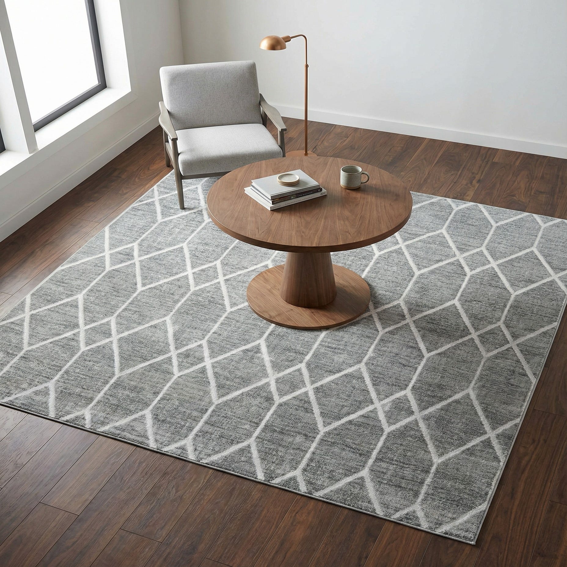 Soft gray forms the background for a crisp ivory lattice that traces a repeating network of elongated diamonds and hexagonal links. The geometric pattern reads modern with a subtle nod to classic trellis design, offering structure without heaviness. Machine-made from 100% polyester, the rug has a low-profile pile with slightly raised ivory lines that add a touch of tactile contrast and a gentle, muted sheen across the gray field.