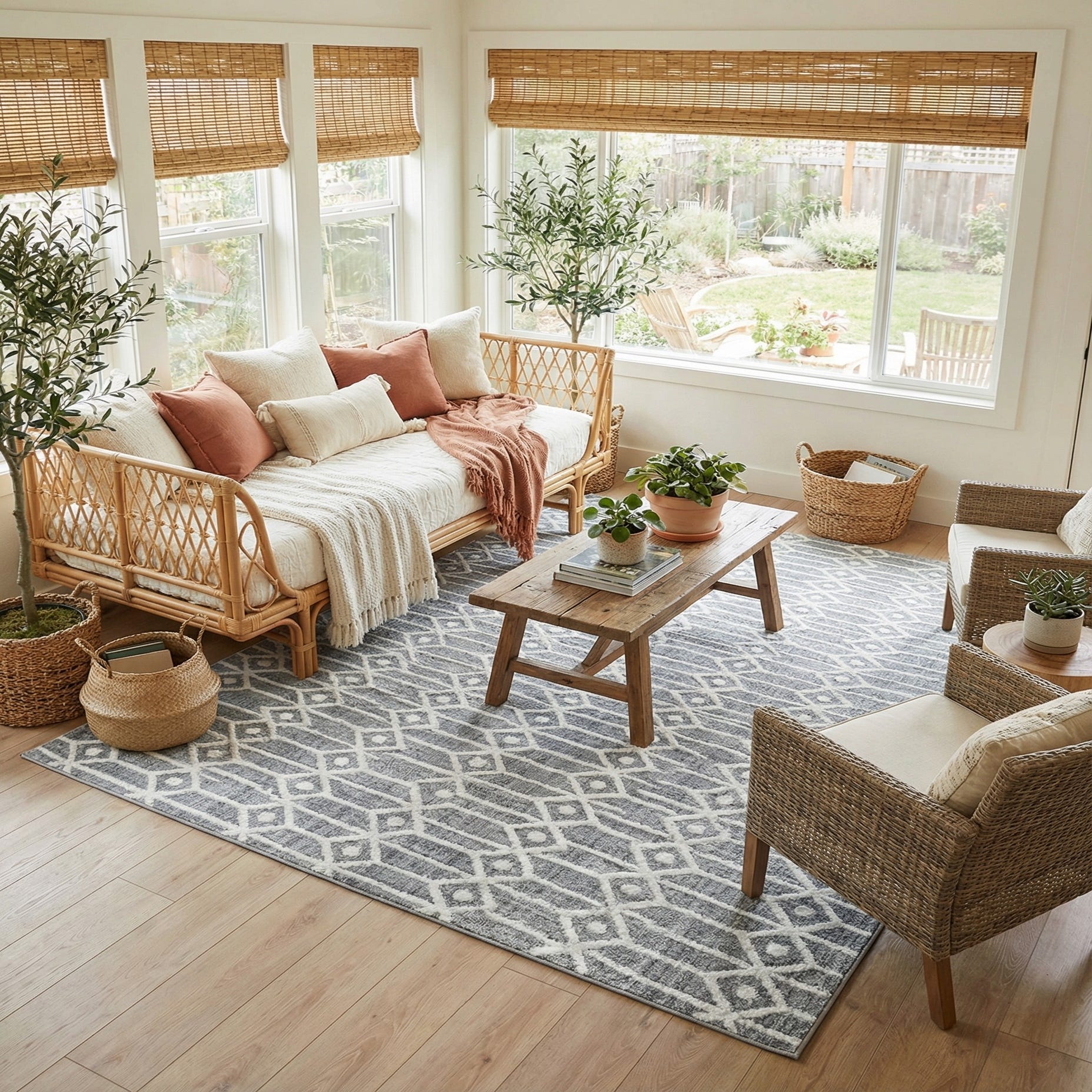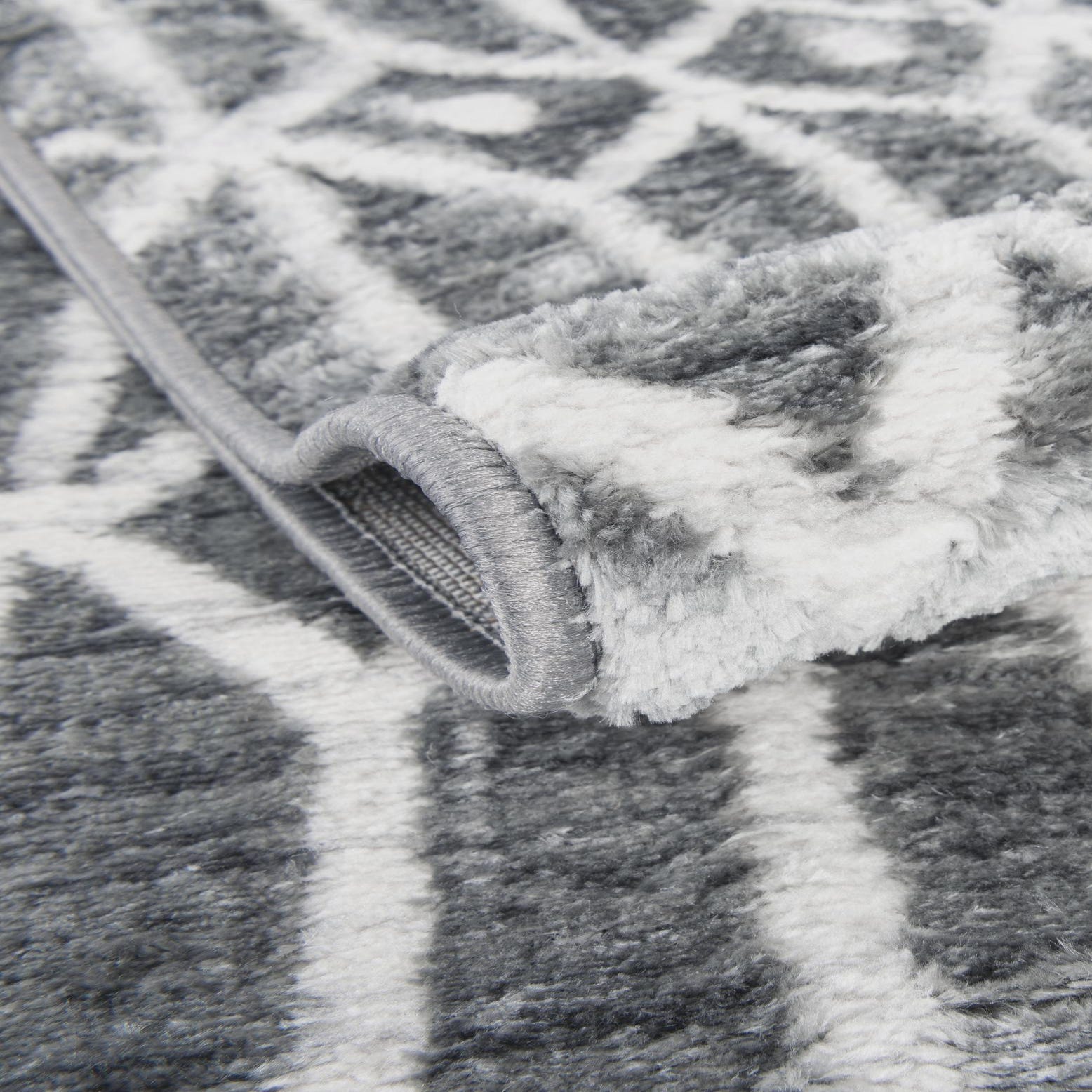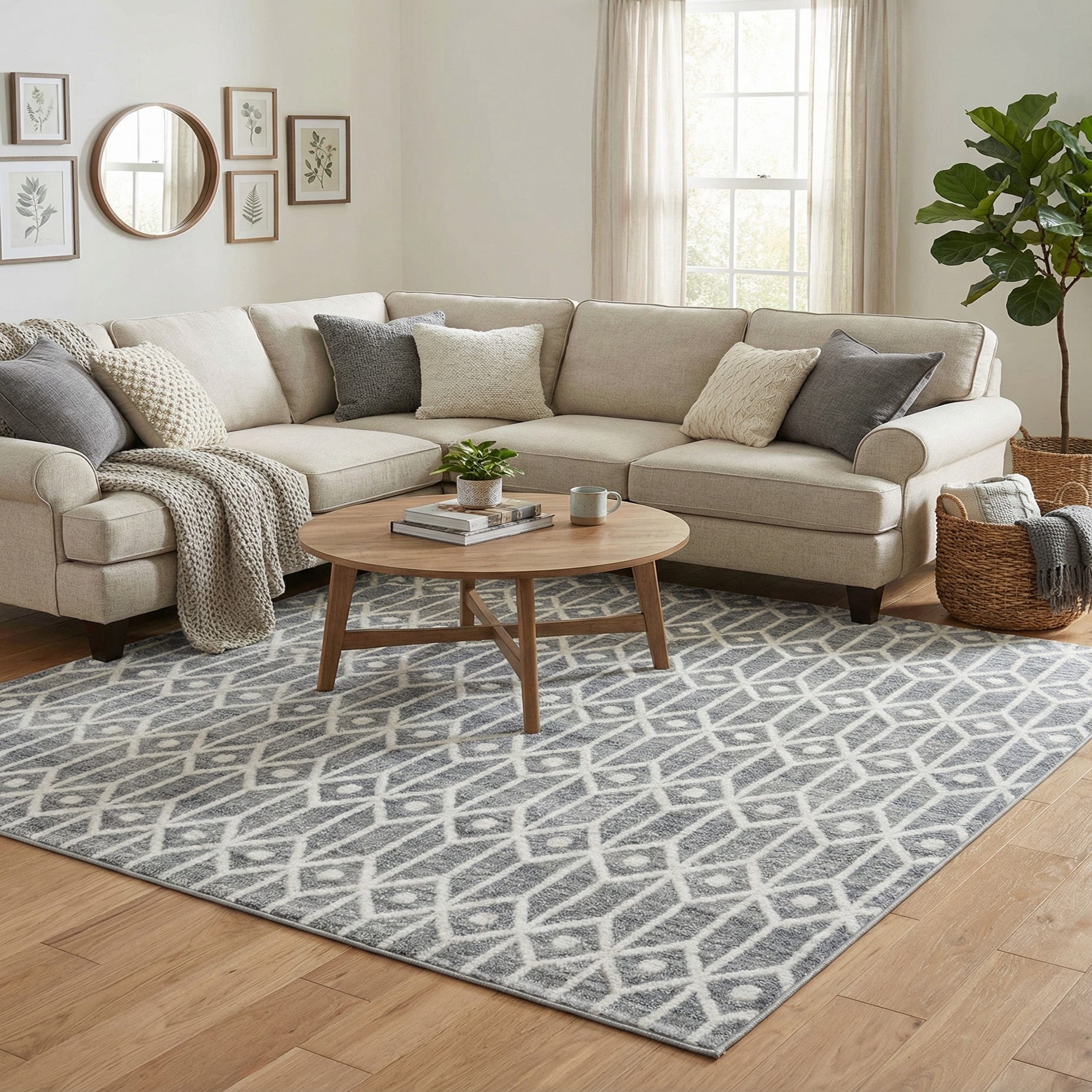A 7'x7' square gray area rug with a repeating white trellis pattern, featuring interconnected diamonds and dots, showcasing its textured pile.