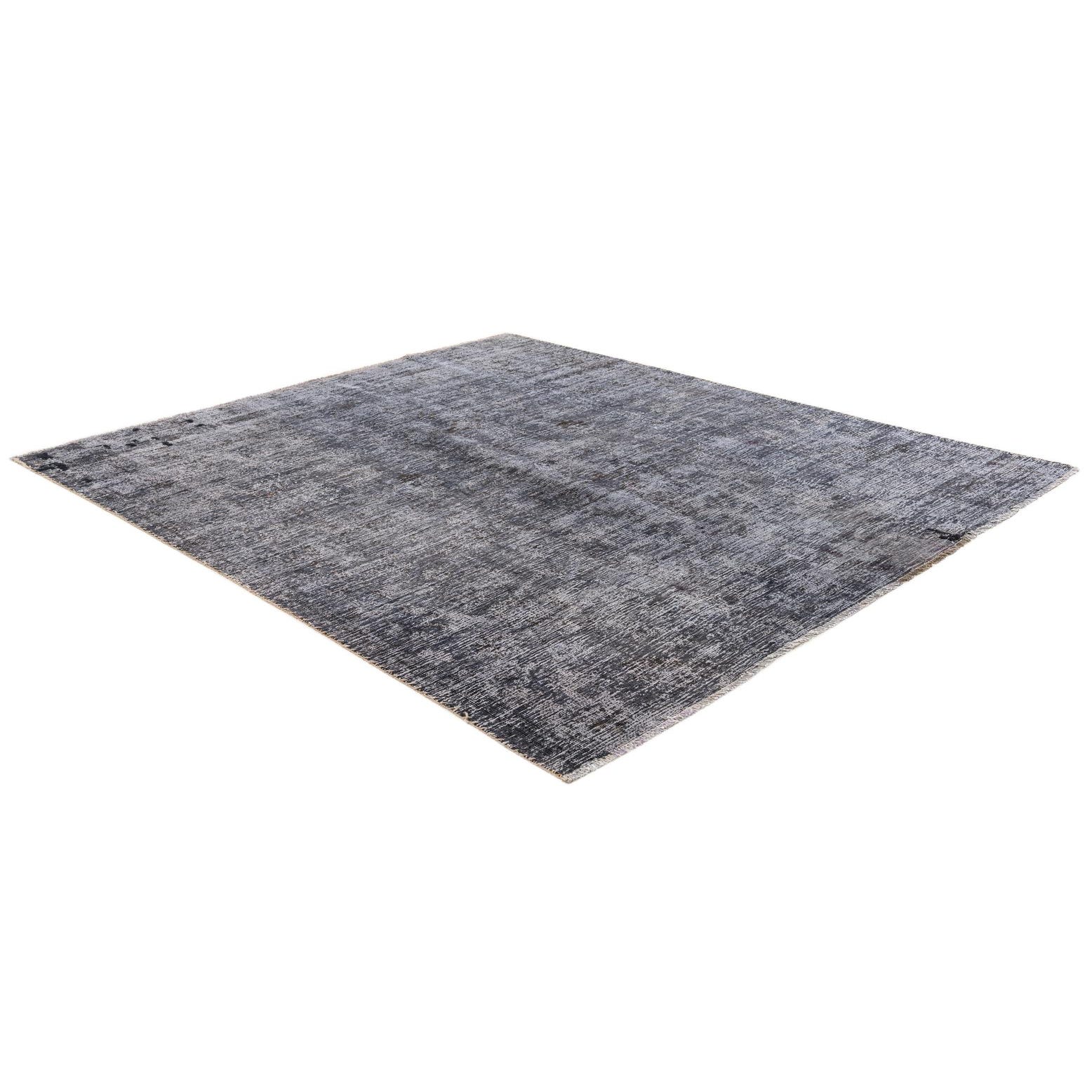 A 6' 9 x 7' 6 square gray and silver wool rug with a distressed Persian-inspired medallion pattern.