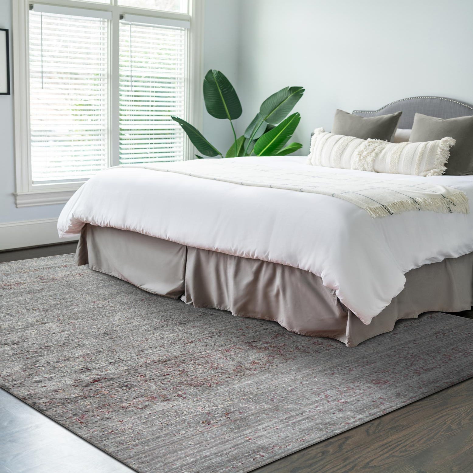 A 7x10 rectangular gray area rug with subtle silver and rust-colored distressed accents, suitable for a living room.