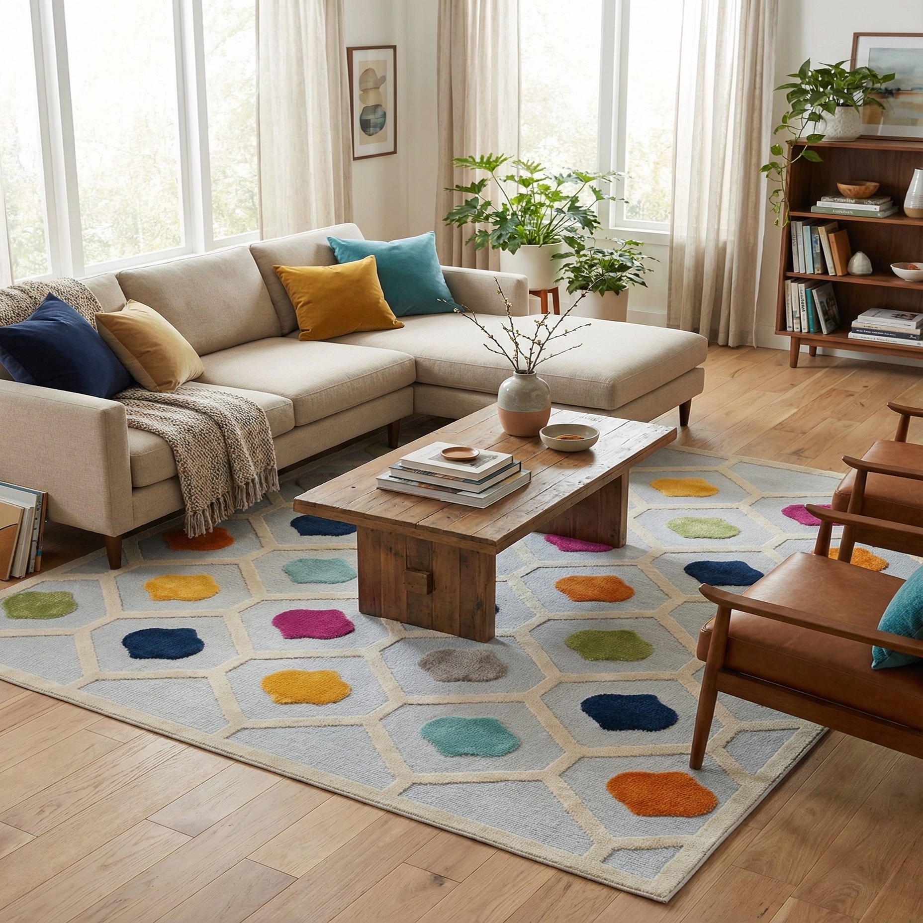 Warm and versatile, this rug works well in casual living rooms or family rooms where a pop of color brightens neutral furniture, and it’s a good choice for sunrooms or covered outdoor seating where layered style is desired. It also fits nicely in a modern coastal scheme or a mid-century inspired space when combined with light wood tones, navy upholstery, and brass or gold accents, and it can bring playful energy to a child’s playroom or a transitional dining area.