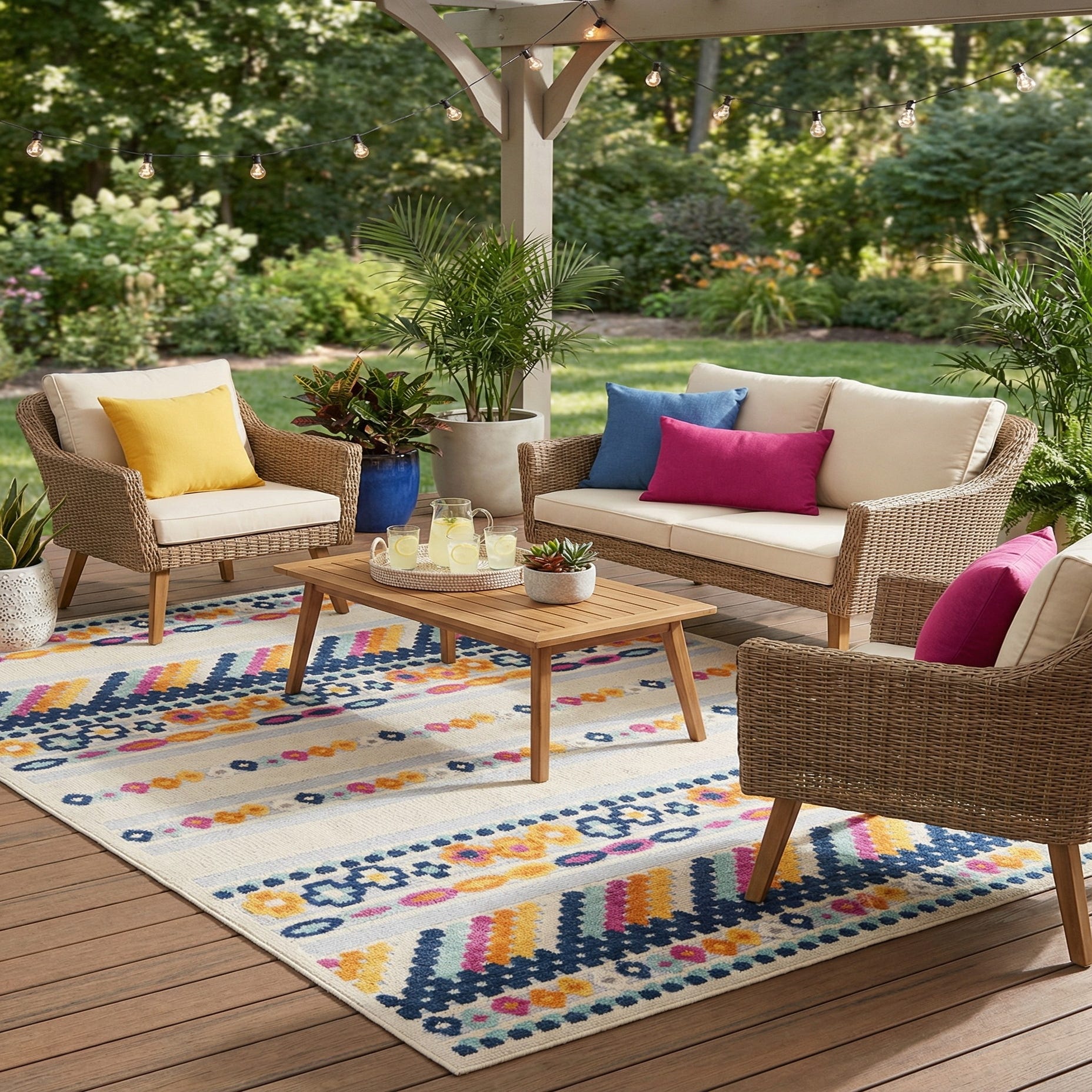 Warm and versatile, this rug pairs well with casual coastal or modern bohemian interiors—place it beneath a coffee table with rattan or mid-century furnishings, layer it in a sunroom or covered porch to introduce color, or use it to anchor a dining area with light wood seating. The graphic stripes and bright accents also work in an eclectic apartment or a children’s playroom where playful patterning and durable performance are priorities.
