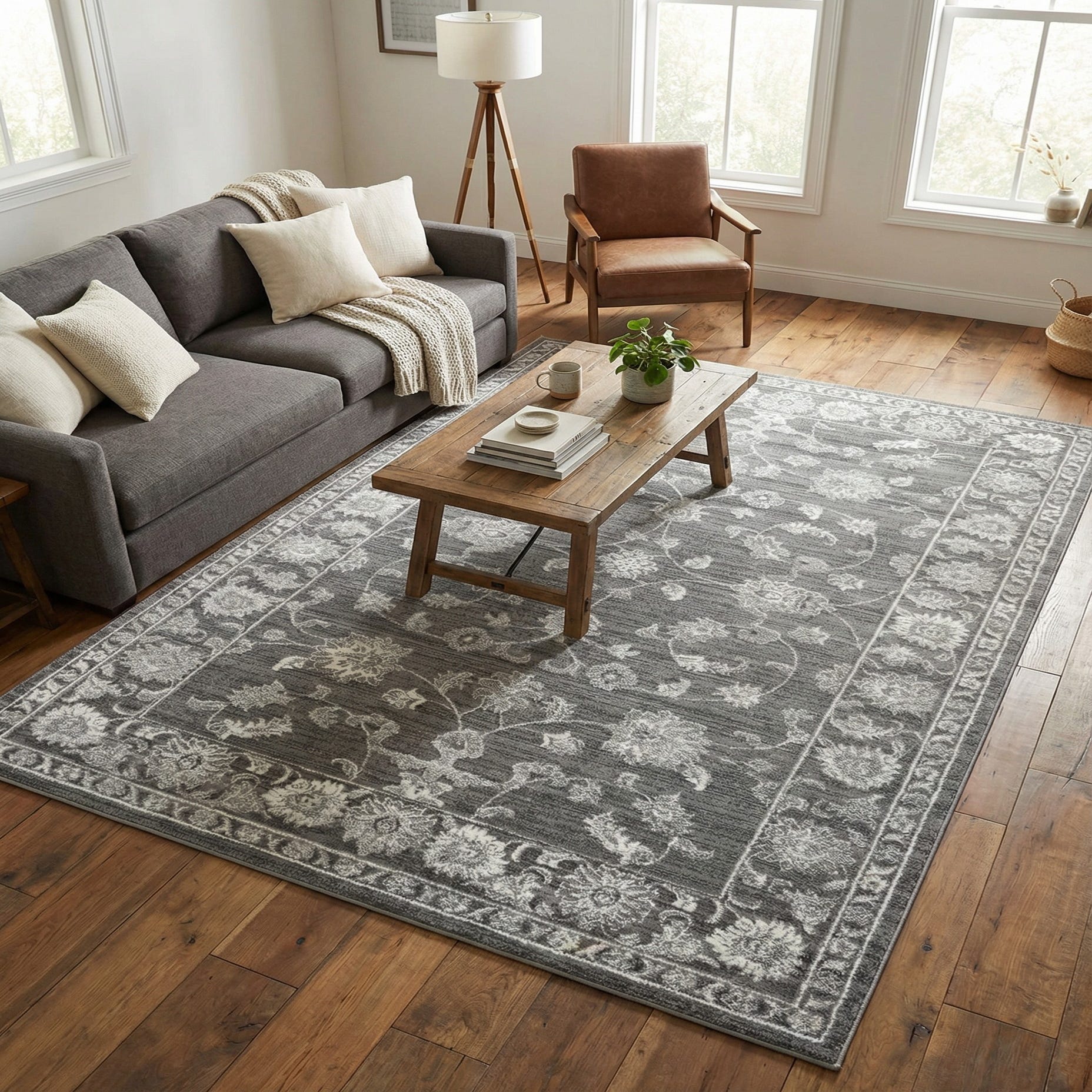 A classic floral medallion layout is rendered in clean ivory against a cool gray field, where scrolling vines and layered blossoms create a balanced, traditional look with a subtle, modern edge. A defined floral border frames the central field, and fine horizontal striations in the ground add depth and visual texture that enhances the pattern without overwhelming a room. The overall style leans transitional—rooted in traditional motifs but quiet enough to pair with contemporary furnishings.