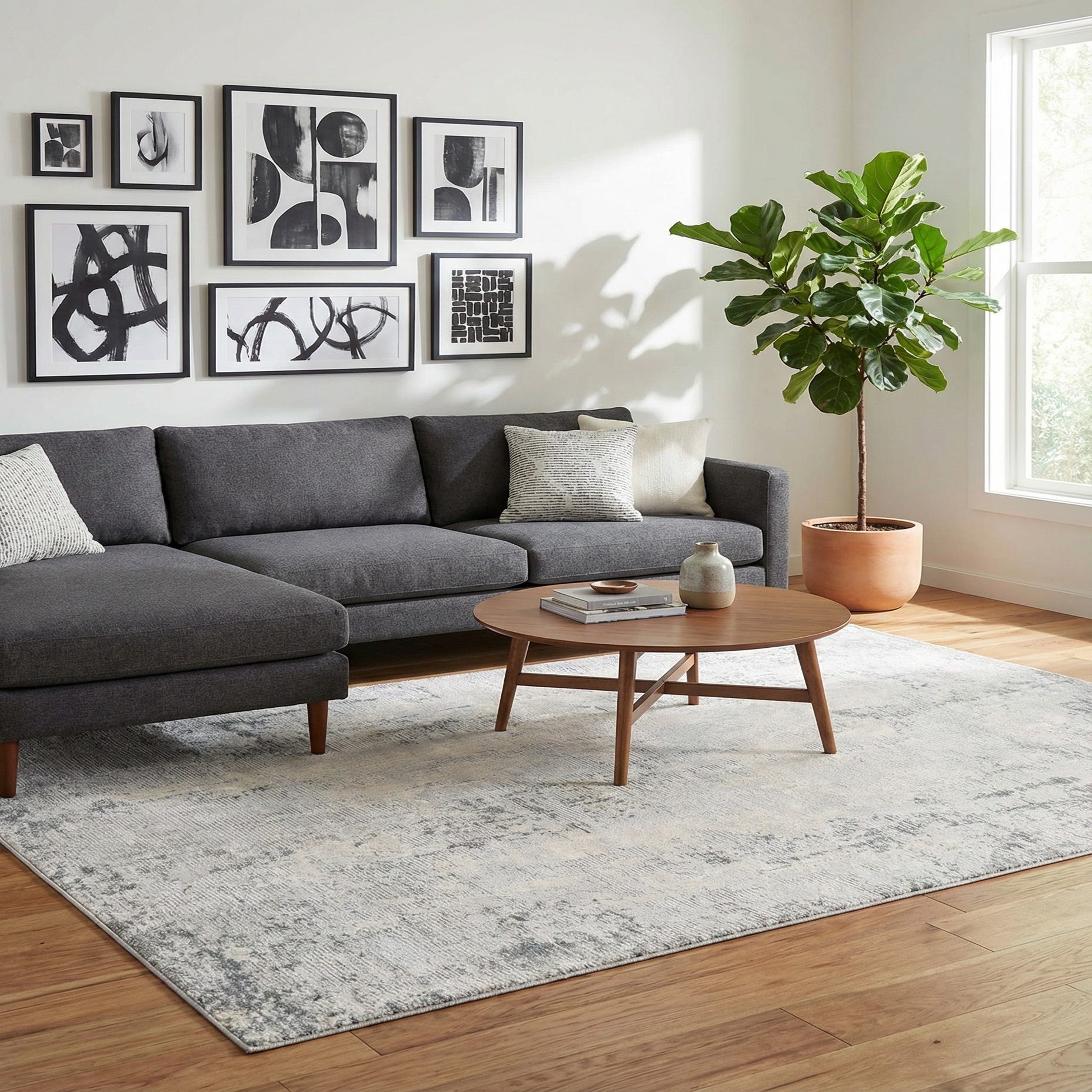 A calm, contemporary expression in gray and ivory, this rug brings a softly distressed abstract pattern to the floor. The gray background provides a cool, neutral base while irregular ivory overlays and faint linear striations create a weathered, tonal effect that adds visual depth without heavy contrast. The design reads as modern transitional — the distressed motifs and subtle variation in shading give it an organic, lived-in look that pairs easily with a range of furnishings.