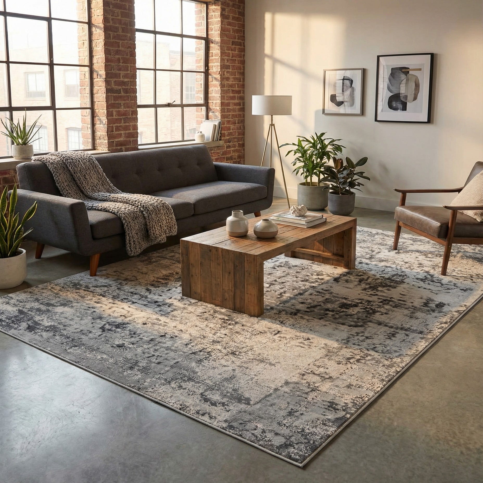 A layered, distressed abstract pattern gives this rug a lived-in, painterly look. A gray ground anchors the design while panels and washes of ivory, beige and light blue float across the surface, creating subtle contrast and visual depth. The overall style leans modern-transitional — contemporary yet comfortably familiar — with an artful, patchwork effect that works as a quiet focal point rather than a loud statement.