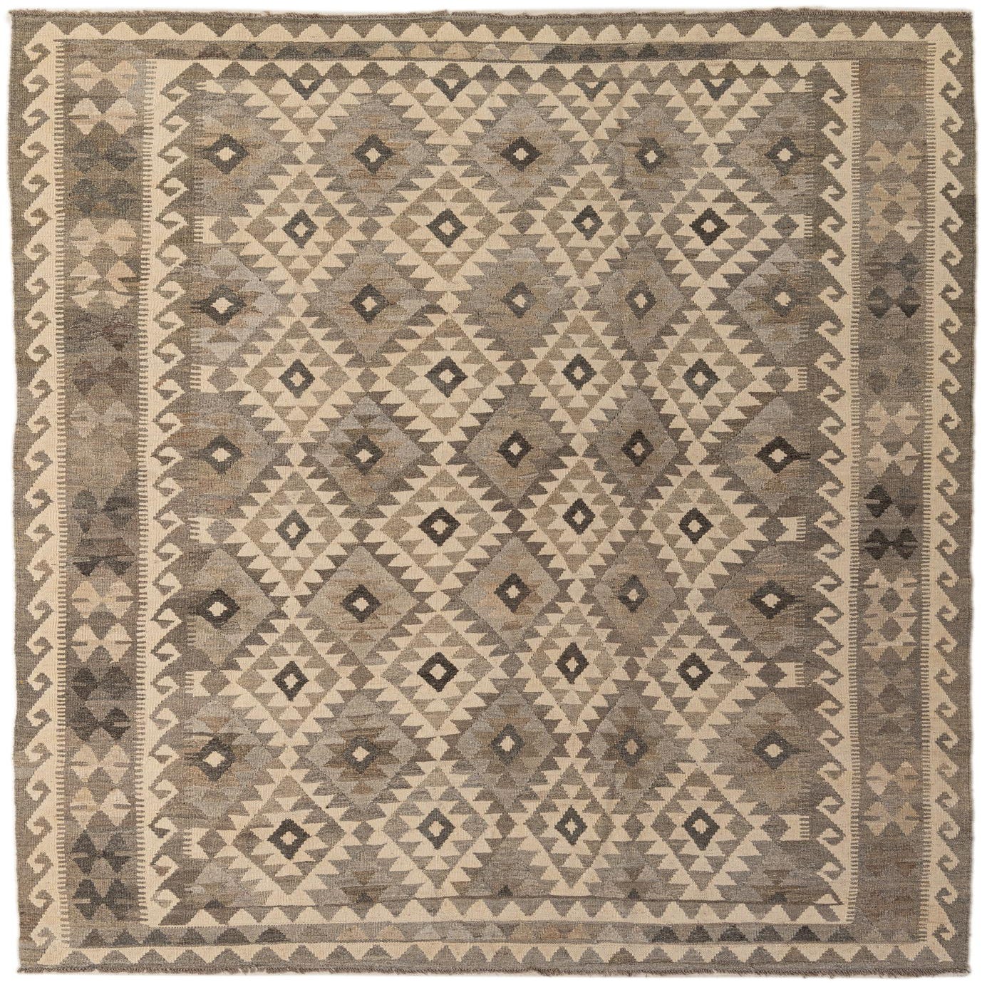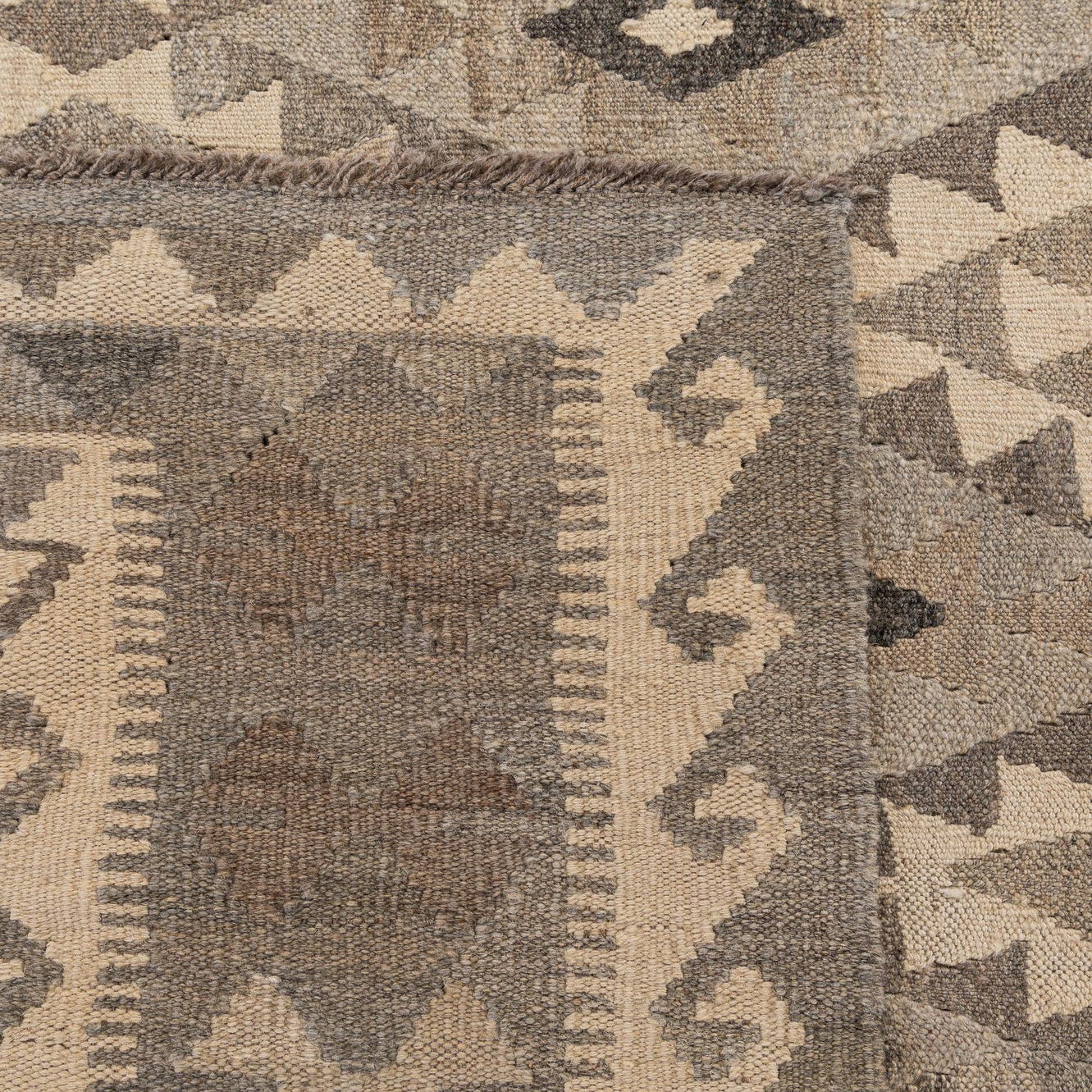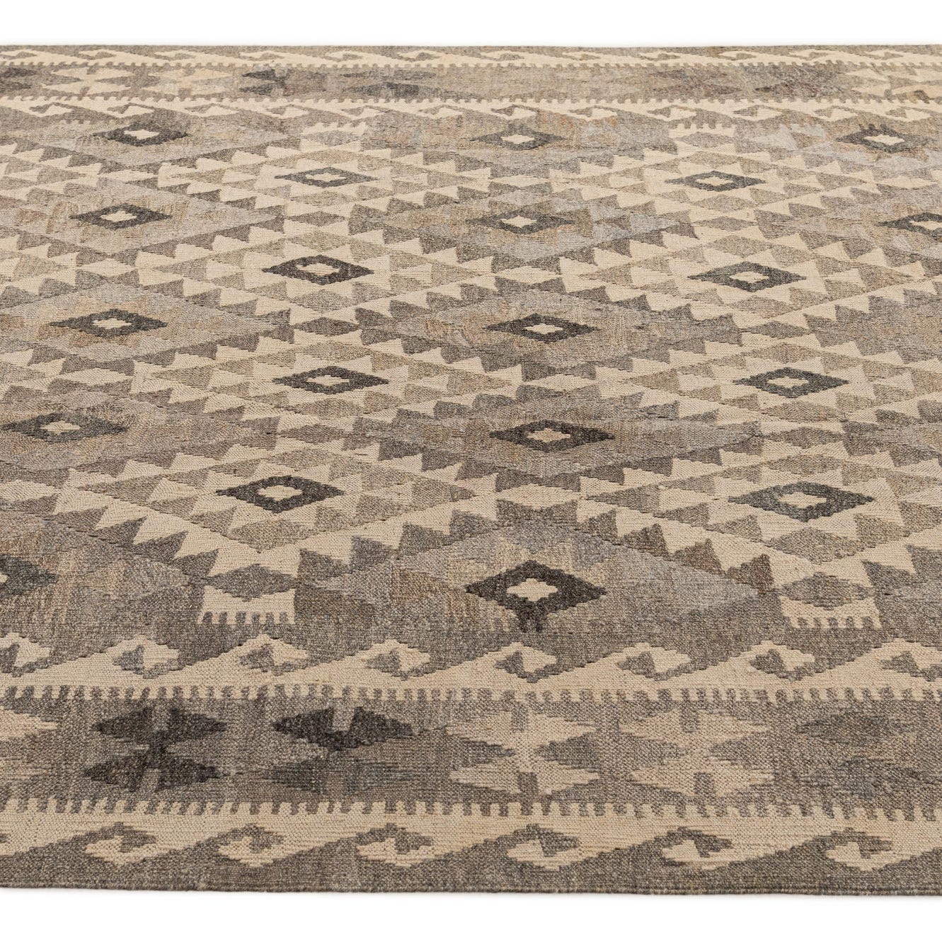 A 7x10 rectangular flatweave Kilim Maymana rug featuring tribal geometric patterns in shades of gray and off-white.