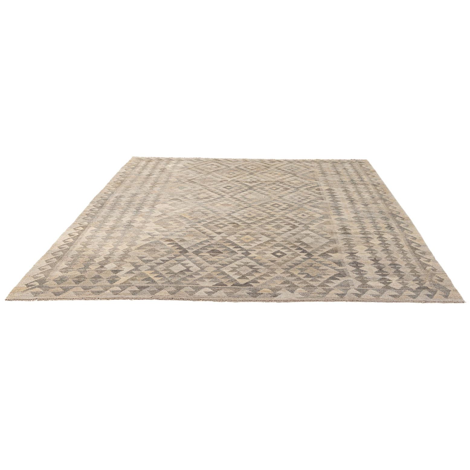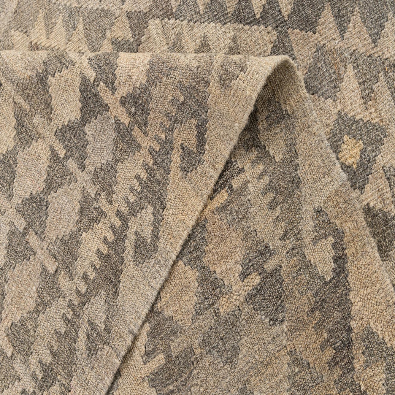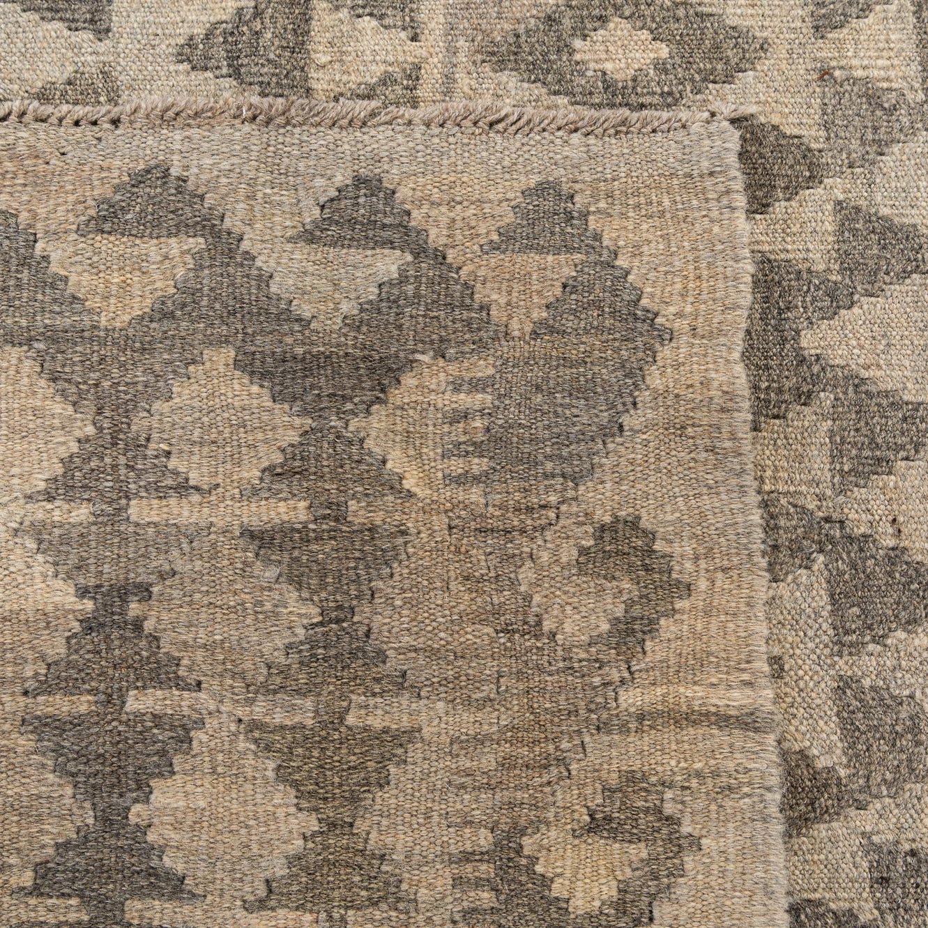 A 7x10 rectangular flatweave Kilim Maymana rug in shades of gray and silver, featuring a modern tribal geometric pattern.