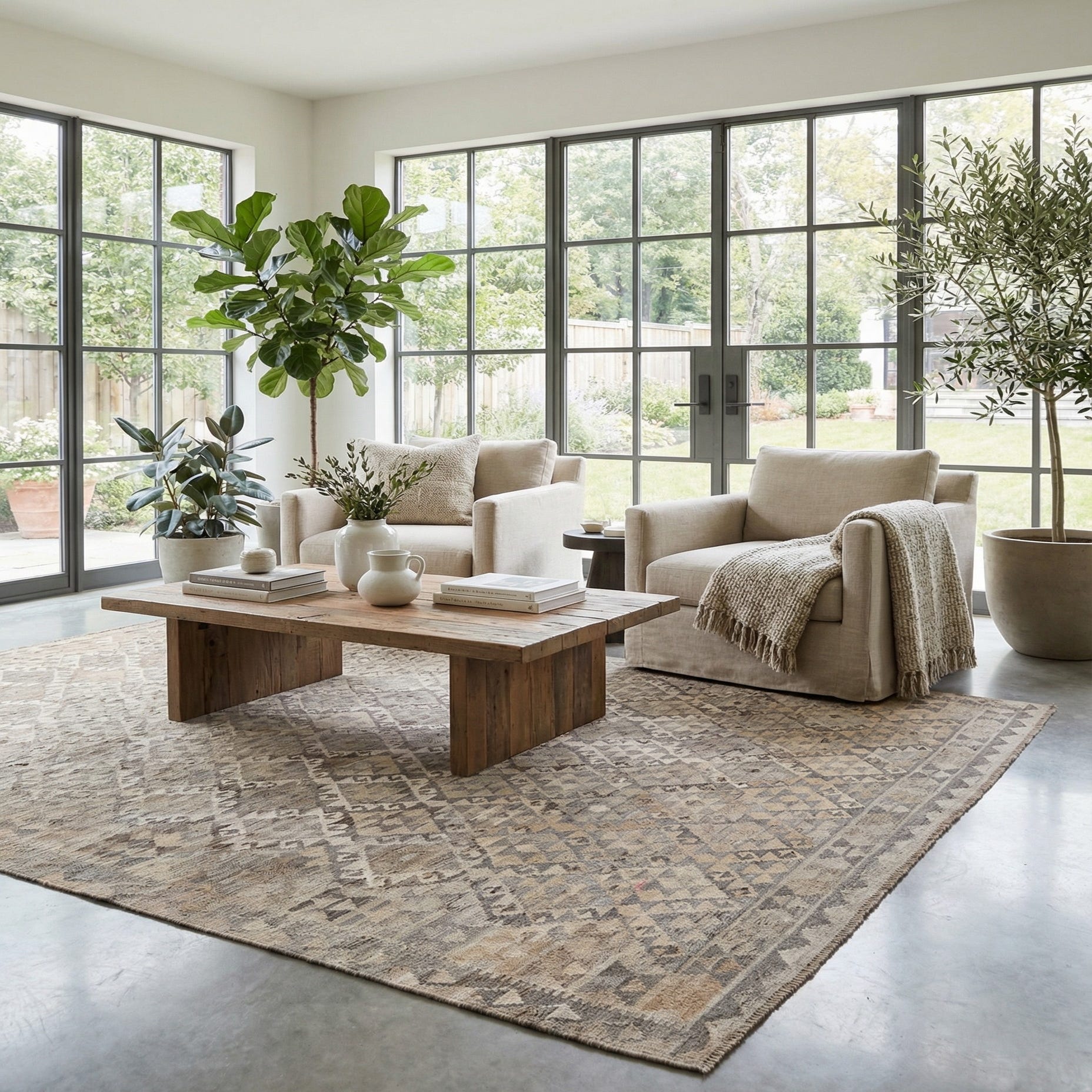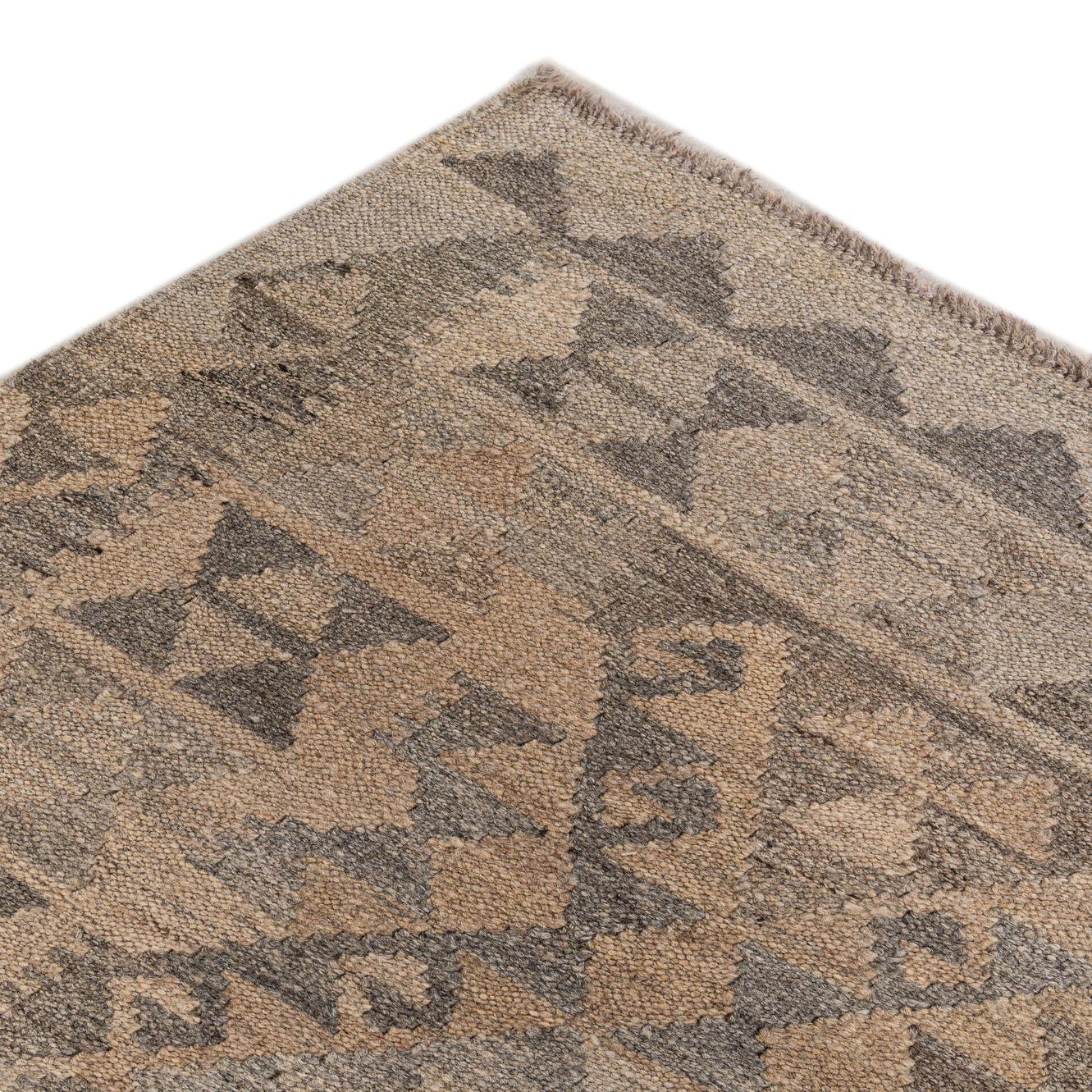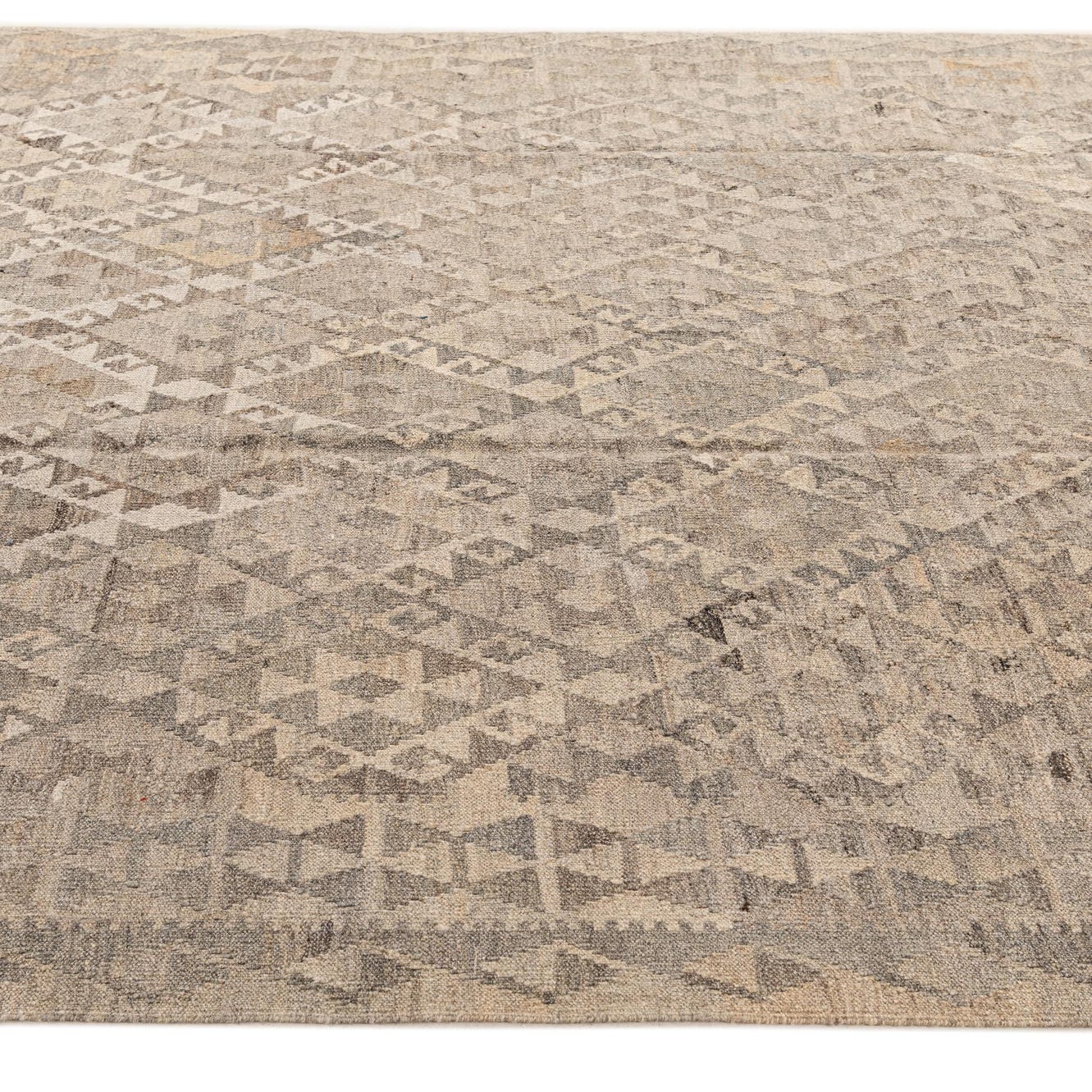 A 7x10 rectangular flatweave rug featuring a geometric tribal pattern in various shades of gray and silver.