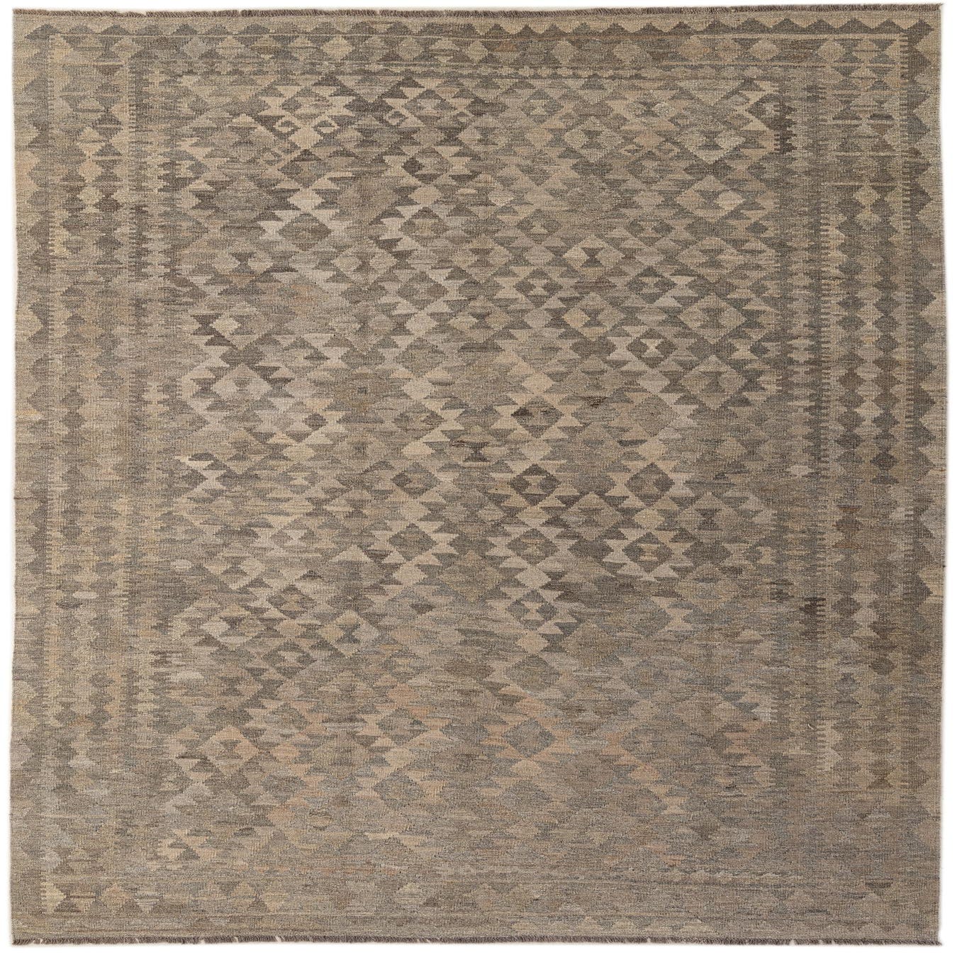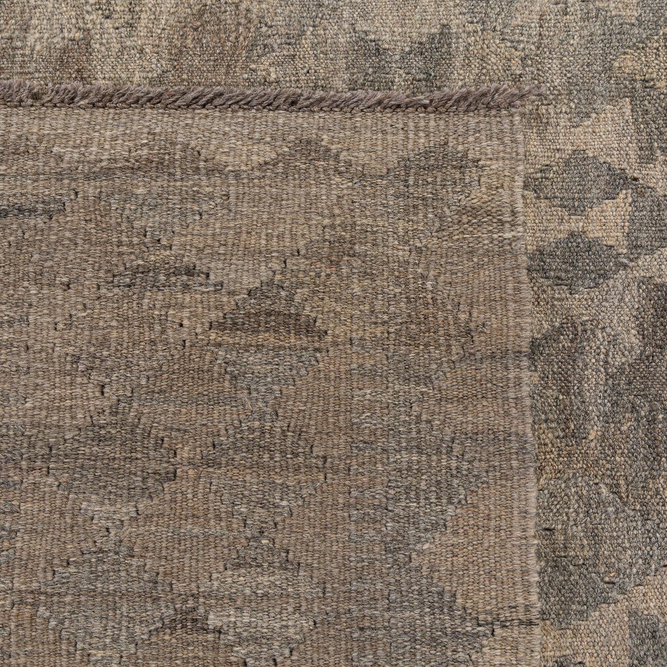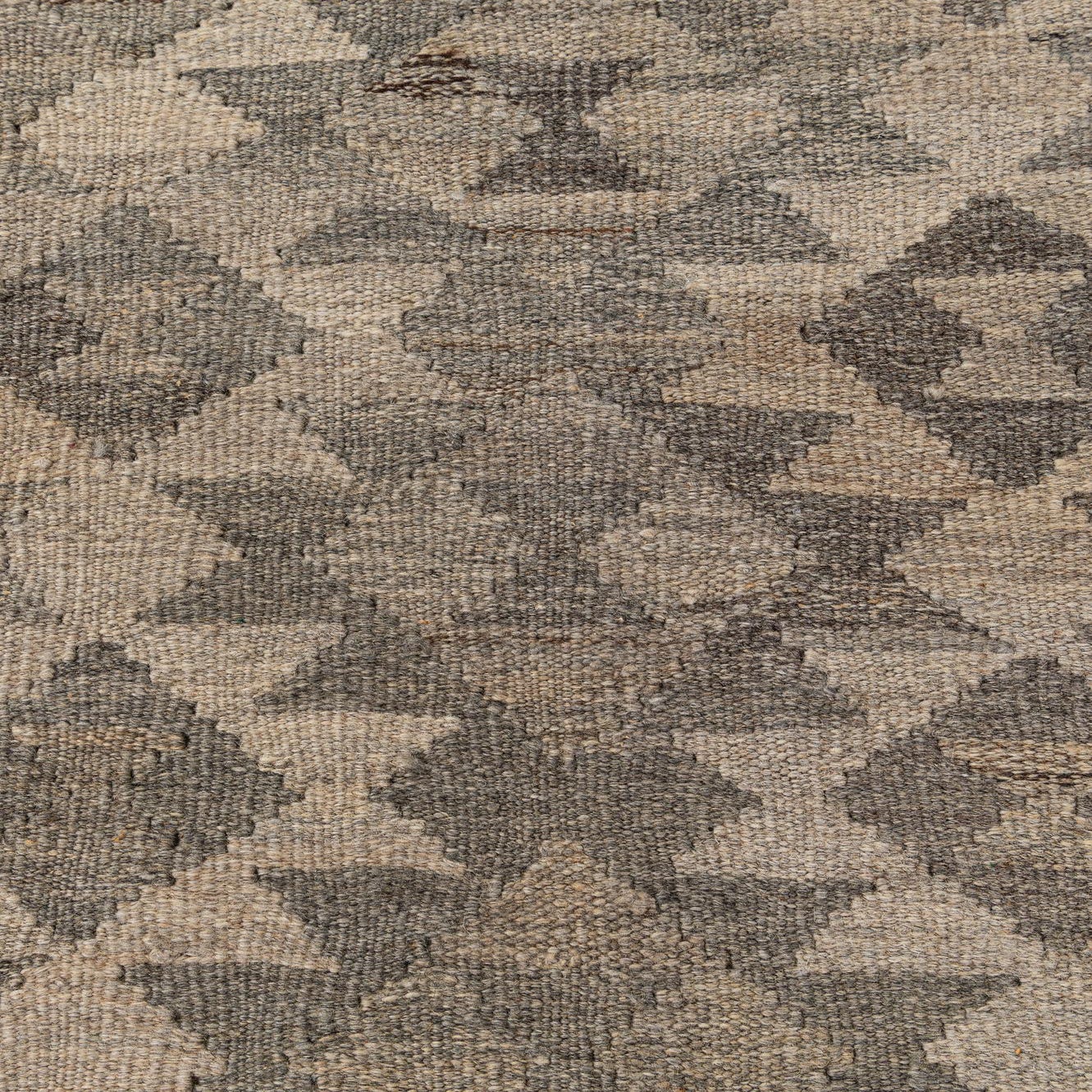 A 7x10 rectangular Kilim Maymana wool rug featuring a tribal geometric pattern in varying shades of gray.