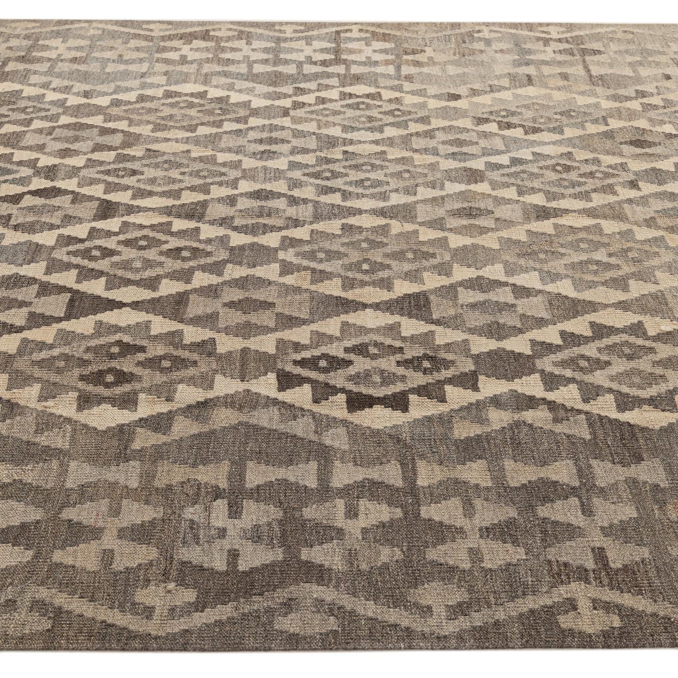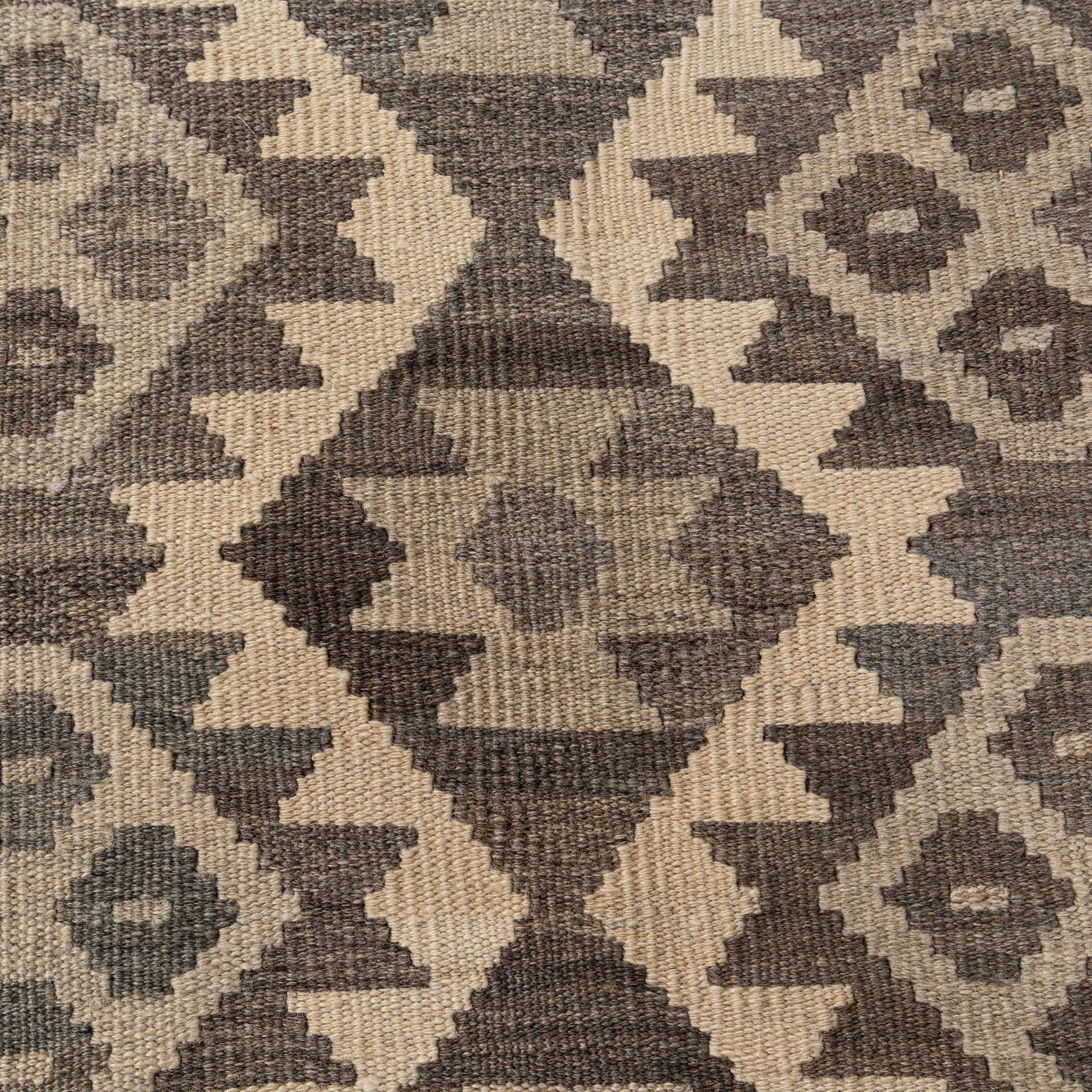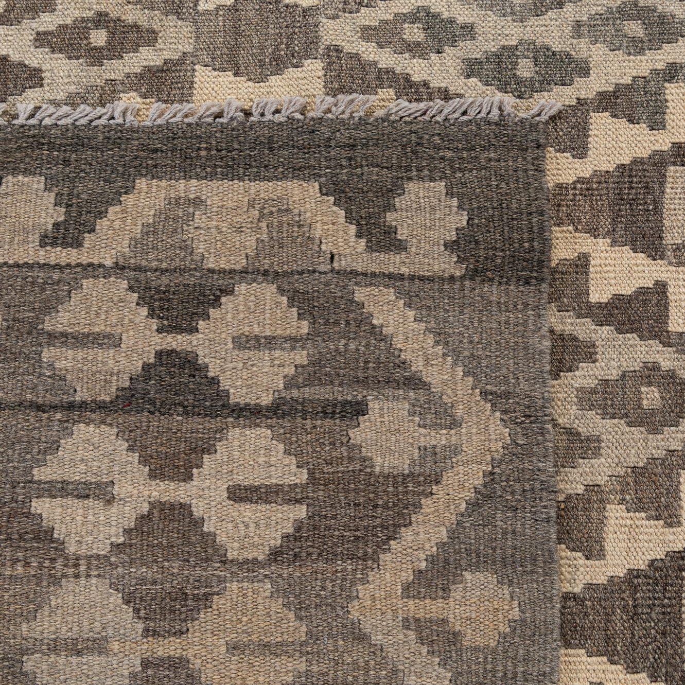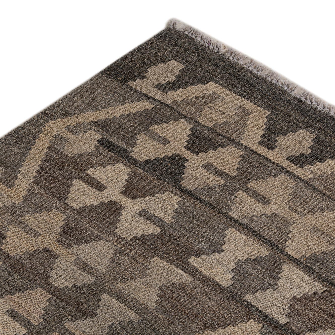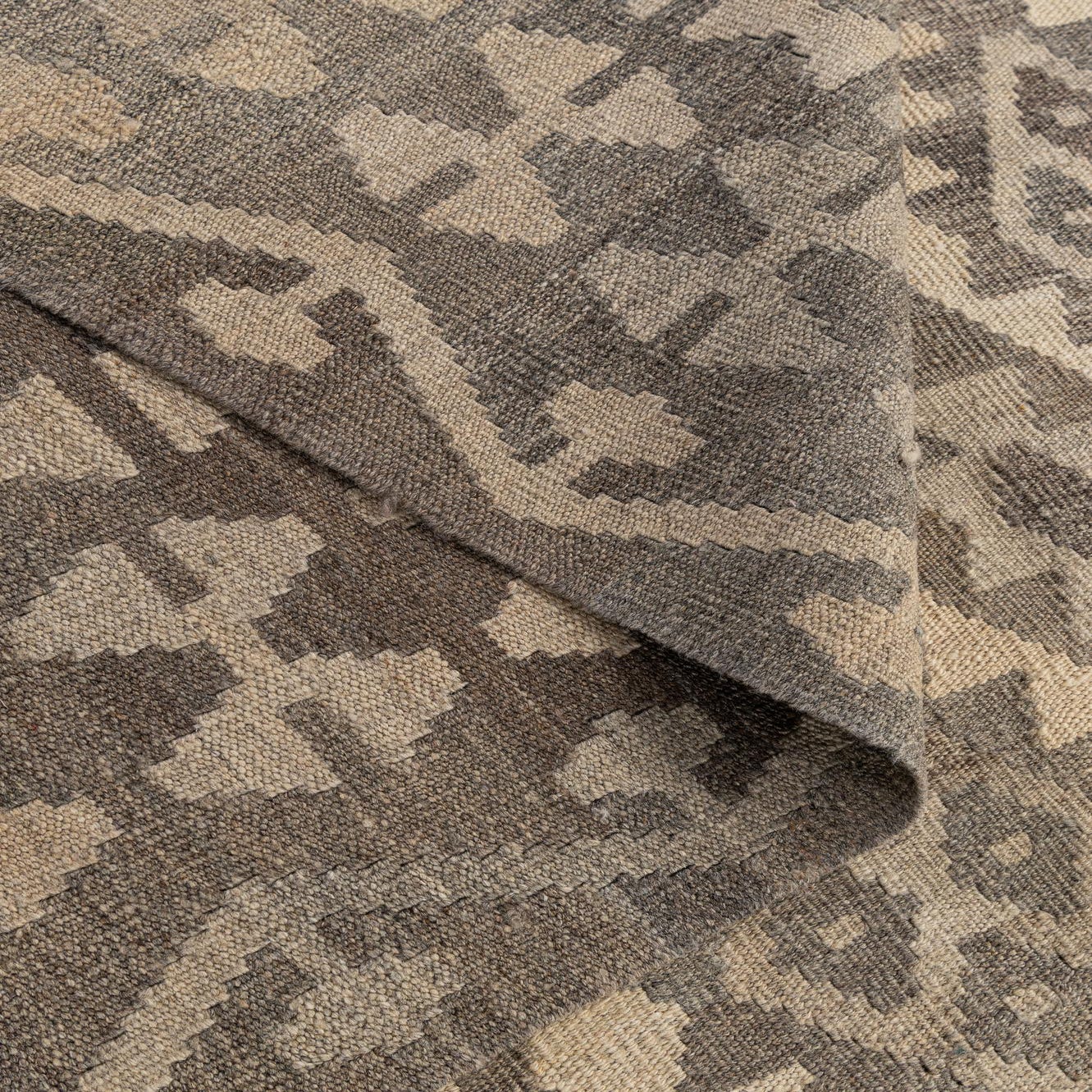 A 7x10 rectangular Kilim Maymana rug featuring a gray and silver tribal geometric pattern, handmade from wool.