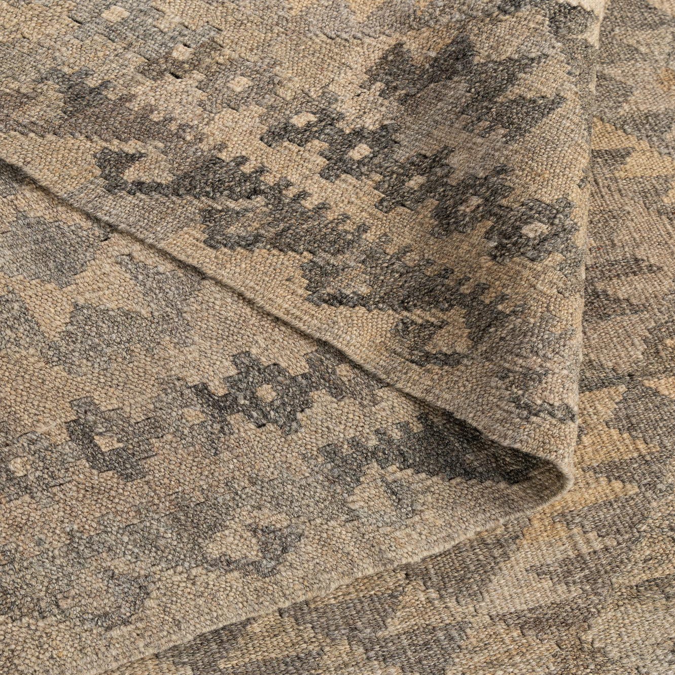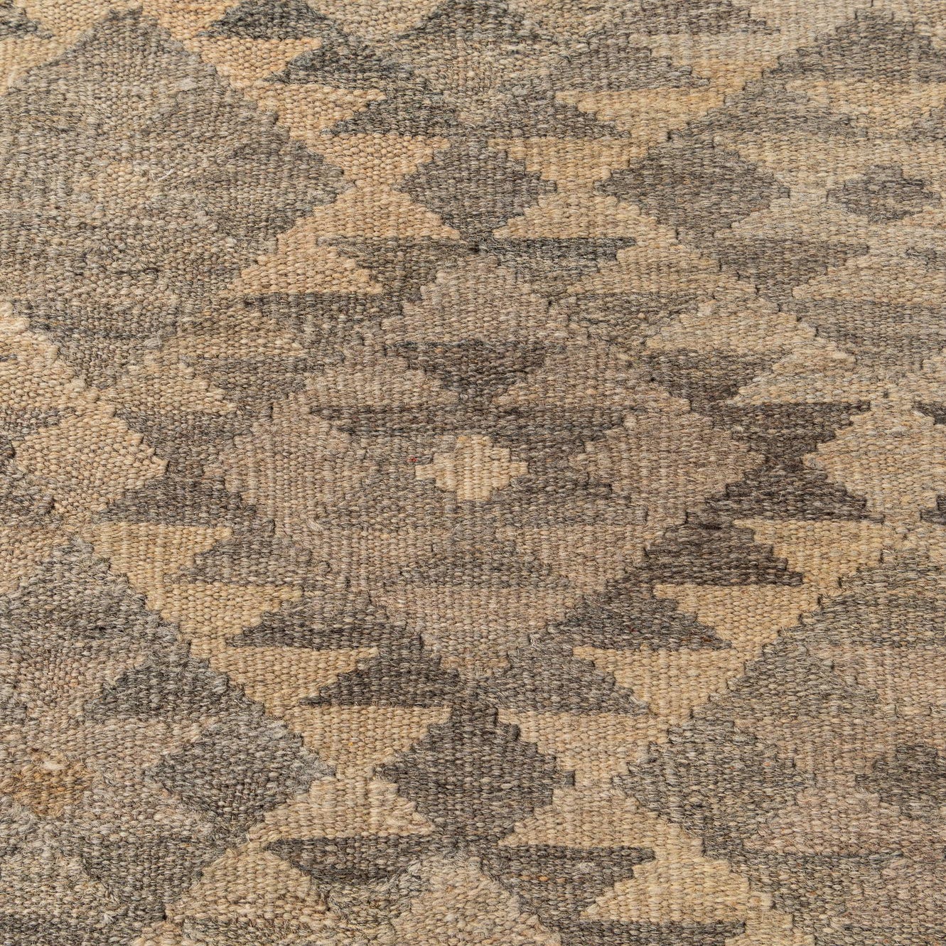 A 7x10 rectangular flatweave Kilim Maymana rug featuring a tribal geometric diamond pattern in varying shades of gray and silver.