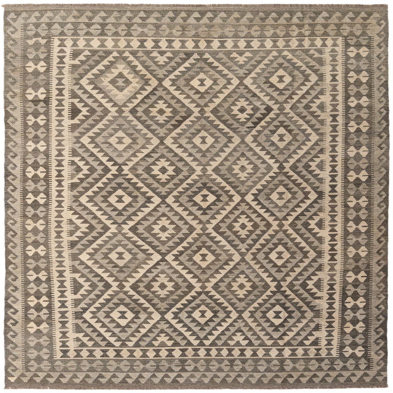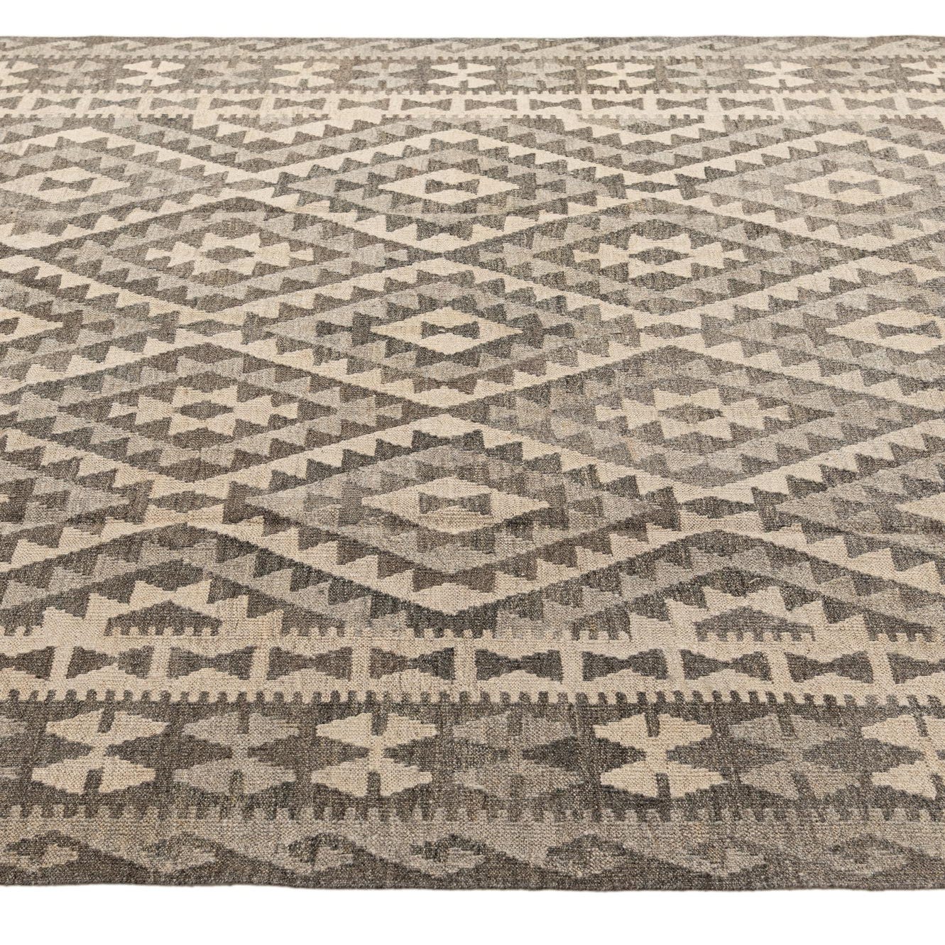 A 7x10 rectangular flatweave rug with a tribal geometric diamond pattern in shades of gray and silver.