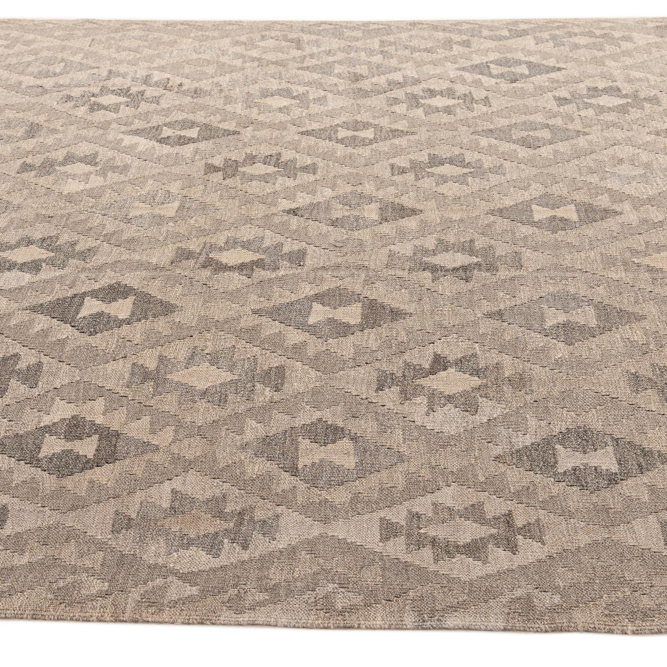 A 7x10 rectangular flatweave Kilim Maymana rug featuring a tribal geometric pattern in varying shades of gray and silver.