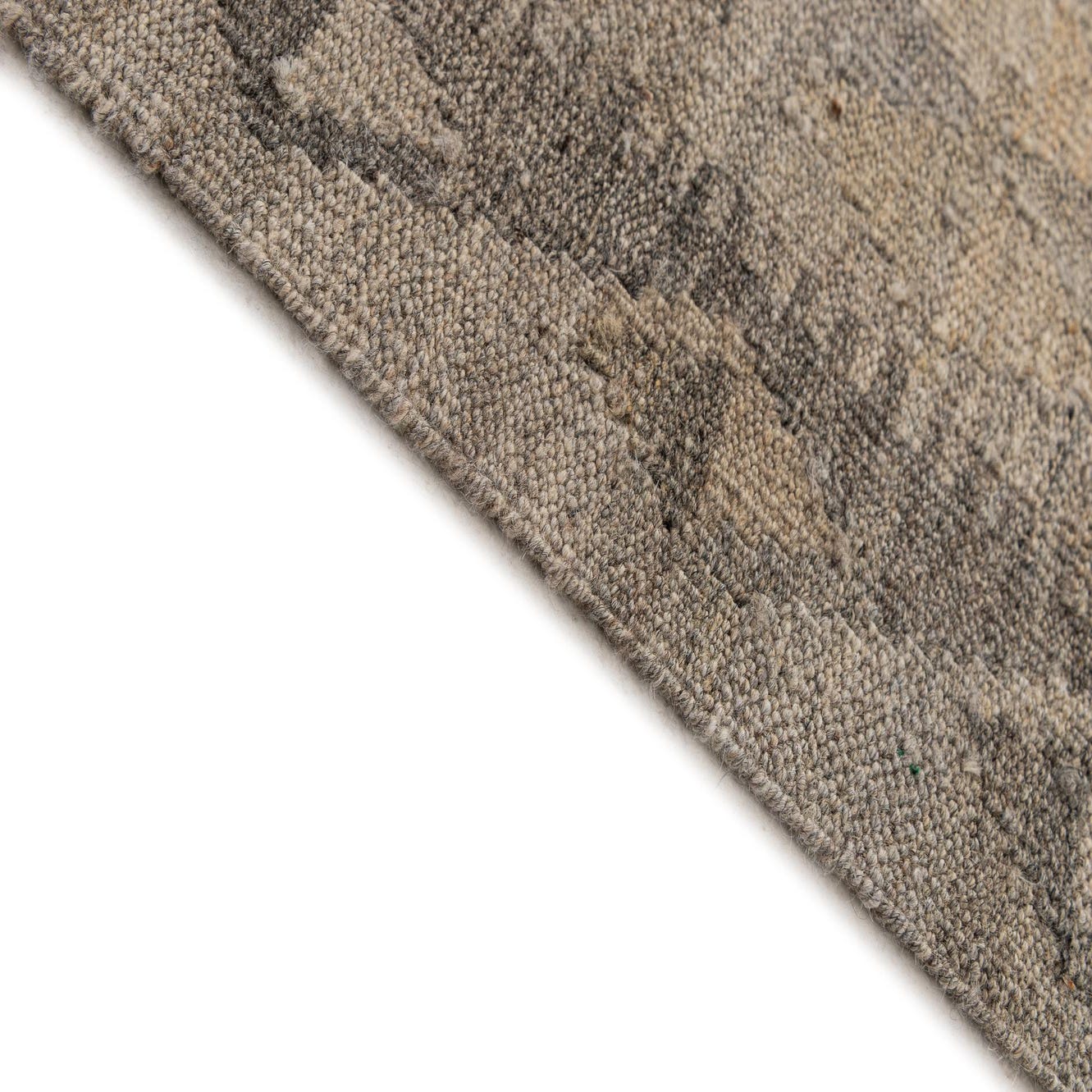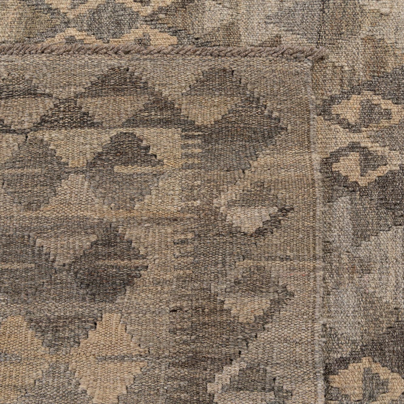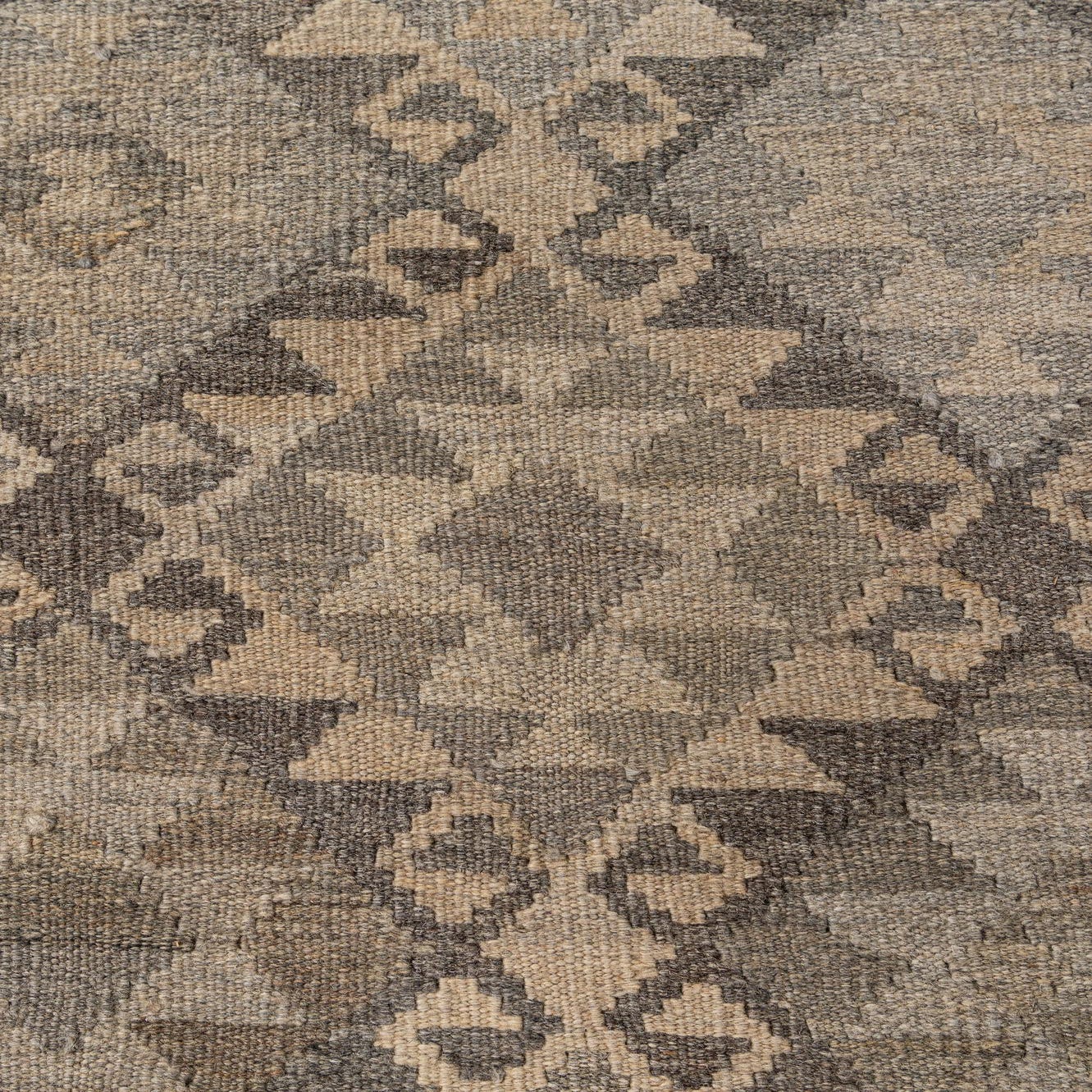 A 7x10 rectangular flatweave Kilim Maymana rug in shades of gray and silver, featuring a tribal geometric pattern with diamond and triangle motifs.