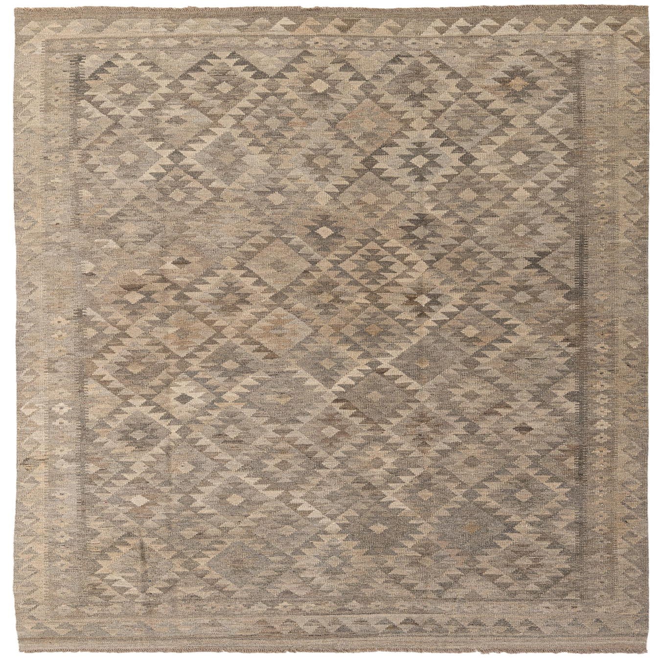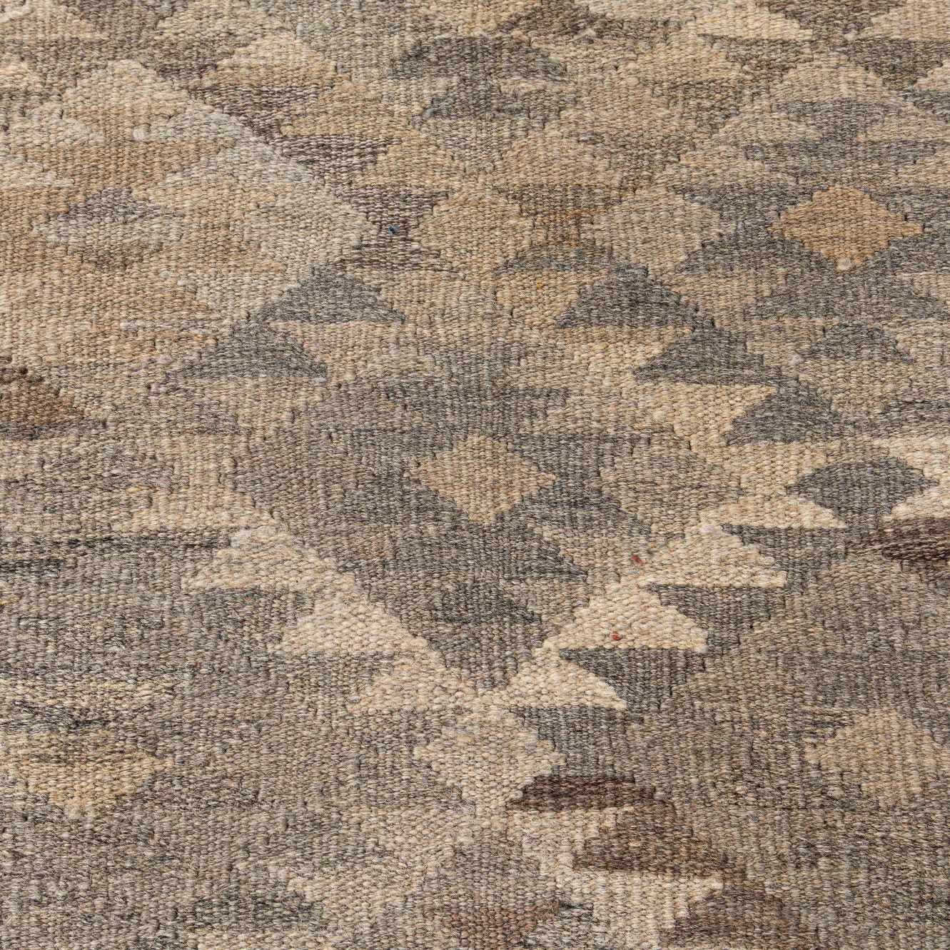 A 7x10 rectangular Kilim Maymana rug featuring a tribal geometric pattern in shades of gray and silver, perfect for a living room.