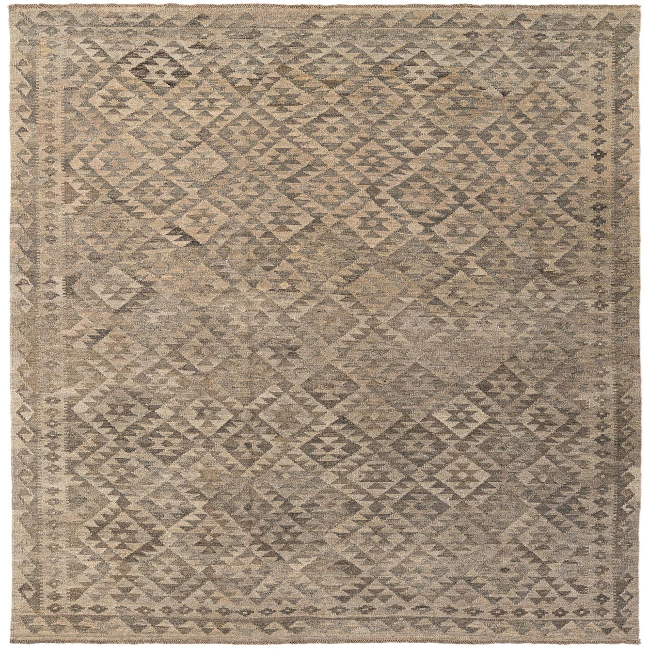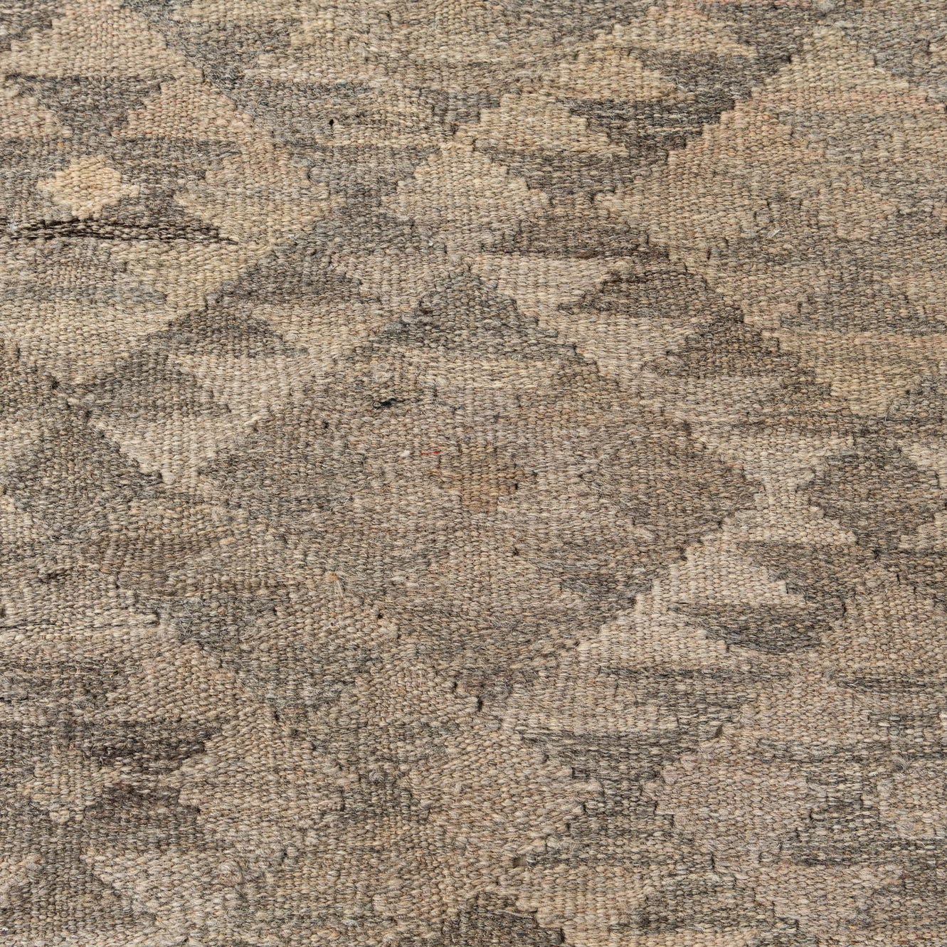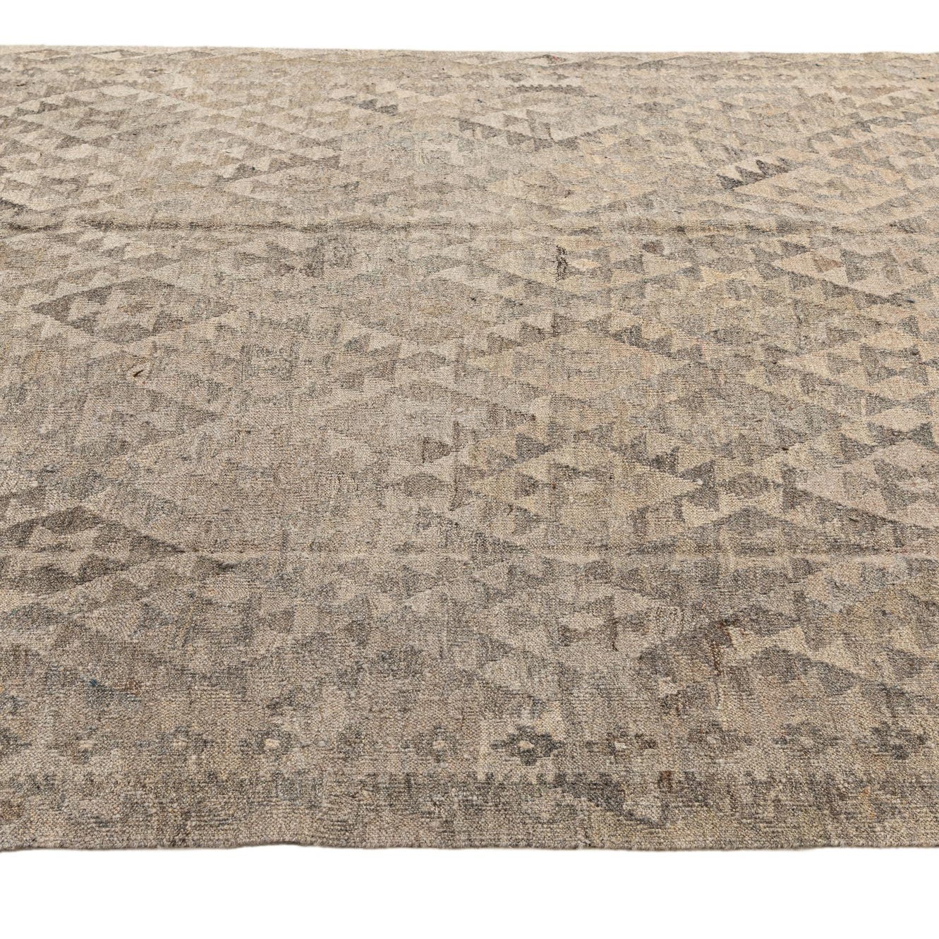 A 7x10 rectangular flatweave Kilim Maymana rug in shades of gray and silver, featuring a dense tribal geometric pattern.