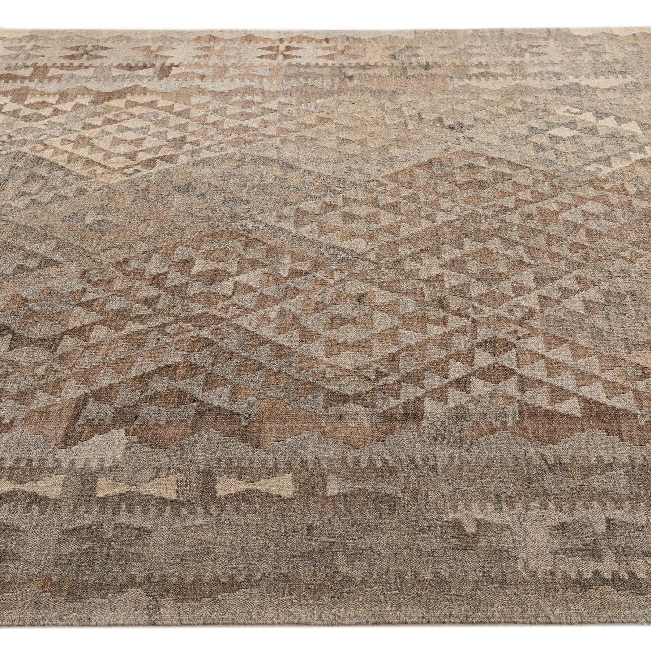 A 7x10 rectangular flatweave Kilim Maymana rug featuring a tribal geometric pattern in shades of gray and silver.
